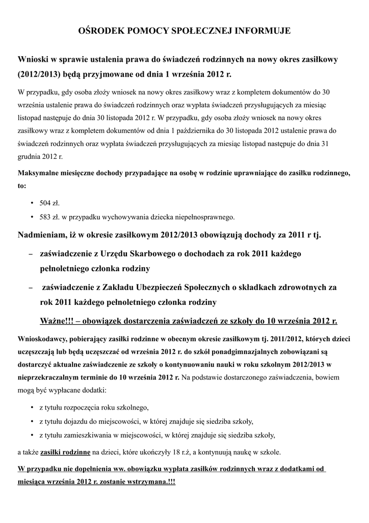 OŚRODEK POMOCY SPOŁECZNEJ INFORMUJE Wnioski w sprawie ustalenia prawa do świadczeń rodzinnych na nowy okres zasiłkowy (2012/2013) będą przyjmowane od dnia 1 września 2012 r. W przypadku, gdy osoba złoży wniosek na nowy okres zasiłkowy wraz z kompletem dokumentów do 30 września ustalenie prawa do świadczeń rodzinnych oraz wypłata świadczeń przysługujących za miesiąc listopad następuje do dnia 30 listopada 2012 r. W przypadku, gdy osoba złoży wniosek na nowy okres zasiłkowy wraz z kompletem dokumentów od dnia 1 października do 30 listopada 2012 ustalenie prawa do świadczeń rodzinnych oraz wypłata świadczeń przysługujących za miesiąc listopad następuje do dnia 31 grudnia 2012 r. Maksymalne miesięczne dochody przypadające na osobę w rodzinie uprawniające do zasiłku rodzinnego, to: • 504 zł. • 583 zł. w przypadku wychowywania dziecka niepełnosprawnego. Nadmieniam, iż w okresie zasiłkowym 2012/2013 obowiązują dochody za 2011 r tj. – zaświadczenie z Urzędu Skarbowego o dochodach za rok 2011 każdego pełnoletniego członka rodziny – zaświadczenie z Zakładu Ubezpieczeń Społecznych o składkach zdrowotnych za rok 2011 każdego pełnoletniego członka rodziny Ważne!!! – obowiązek dostarczenia zaświadczeń ze szkoły do 10 września 2012 r. Wnioskodawcy, pobierający zasiłki rodzinne w obecnym okresie zasiłkowym tj. 2011/2012, których dzieci uczęszczają lub będą uczęszczać od września 2012 r. do szkół ponadgimnazjalnych zobowiązani są dostarczyć aktualne zaświadczenie ze szkoły o kontynuowaniu nauki w roku szkolnym 2012/2013 w nieprzekraczalnym terminie do 10 września 2012 r. Na podstawie dostarczonego zaświadczenia, bowiem mogą być wypłacane dodatki: • z tytułu rozpoczęcia roku szkolnego, • z tytułu dojazdu do miejscowości, w której znajduje się siedziba szkoły, • z tytułu zamieszkiwania w miejscowości, w której znajduje się siedziba szkoły, a także zasiłki rodzinne na dzieci, które ukończyły 18 r.ż, a kontynuują naukę w szkole. W przypadku nie dopełnienia ww. obowiązku wypłata zasiłków rodzinnych wraz z dodatkami od miesiąca września 2012 r. zostanie wstrzymana.!!! Wnioski w sprawie ustalenia prawa do świadczeń z funduszu alimentacyjnego na nowy okres zasiłkowy (2012/2013) będą przyjmowane od dnia 1 sierpnia 2012 W przypadku, gdy osoba złoży wniosek na nowy okres zasiłkowy wraz z kompletem dokumentów do 31 sierpnia 2012 roku ustalenie prawa do świadczeń z funduszu alimentacyjnego oraz wypłata świadczeń przysługujących za miesiąc październik następuje do dnia 31 października 2012 r. W przypadku, gdy osoba złoży wniosek na nowy okres zasiłkowy wraz z kompletem dokumentów od dnia 1 września do 31 października ustalenie prawa do świadczeń oraz wypłata świadczeń przysługujących za miesiąc październik następuje do dnia 30 listopada 2012 r Maksymalne miesięczne dochody przypadające na osobę w rodzinie uprawniające do świadczeń z funduszu alimentacyjnego to: 725 zł. Nadmieniam, iż w okresie zasiłkowym 2012/2013 obowiązują dochody za 2011 r. – zaświadczenie z Urzędu Skarbowego o dochodach za rok 2011 każdego pełnoletniego członka rodziny – zaświadczenie z Zakładu Ubezpieczeń Społecznych o składkach zdrowotnych za rok 2011 każdego pełnoletniego członka rodziny • Ważne!!! – obowiązek dostarczenia zaświadczeń ze szkoły do 10 września 2012 r. Wnioskodawcy, pobierający świadczenia z funduszu alimentacyjnego w obecnym okresie zasiłkowym tj. 2011/2012, których dzieci mają ukończone 18 r. ż. zobowiązani są dostarczyć aktualne zaświadczenie ze szkoły o kontynuowaniu nauki w roku szkolnym 2012/2013 w nieprzekraczalnym terminie do 10 września 2012 r. W przypadku nie dopełnienia ww. obowiązku wypłata świadczeń z funduszu alimentacyjnego od miesiąca września 2012 r. zostanie wstrzymana.!!!