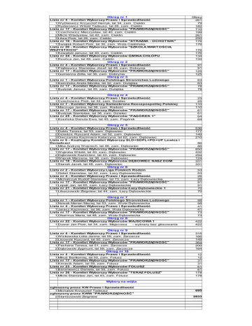 Okręg nr 1 Lista nr 4 - Komitet Wyborczy Prawo i Sprawiedliwość 1 W yżkiewicz Krzysztof Henryk, lat 34, zam. Cieklin 2 Rydarowicz W itold Tadeusz, lat 26, zam. Cieklin Lista nr 17 - Komitet Wyborczy Wyborców "PRAWORZĄDNOŚĆ" 1 Czechowicz Mieczysław, lat 40, zam. Cieklin 2 Mlicki W ładysław, lat 42, zam. Cieklin 3 Litwa Piotr, lat 26, zam. Cieklin Lista nr 19 - Komitet Wyborczy Wyborców "ST RAŻAK - OCHOT NIK" 1 Świątek Robert Piotr, lat 30, zam. W ola Cieklińska Lista nr 20 - Komitet Wyborczy Wyborców "SZKOŁA WART OŚCIĄ WSZYST KICH" 1 Kowalski Janusz, lat 40, zam. Cieklin Lista nr 24 - Komitet Wyborczy Wyborców GMINA CHŁOPU 1 Rzońca Jan, lat 49, zam. Cieklin Okręg nr 2 Lista nr 4 - Komitet Wyborczy Prawo i Sprawiedliwość 1 Piątkiewicz Stanisław Józef, lat 48, zam. Dobrynia Lista nr 17 - Komitet Wyborczy Wyborców "PRAWORZĄDNOŚĆ" 1 Gumienna Zofia, lat 36, zam. Dobrynia Okręg nr 3 Lista nr 1 - Komitet Wyborczy Polskiego Stronnictwa Ludowego 1 Kamińska Aneta Monika, lat 32, zam. Duląbka Lista nr 17 - Komitet Wyborczy Wyborców "PRAWORZĄDNOŚĆ" 1 Budziak Janusz, lat 45, zam. Duląbka Okręg nr 4 Lista nr 4 - Komitet Wyborczy Prawo i Sprawiedliwość 1 Czechowicz Piotr, lat 32, zam. Dzielec Lista nr 7 - Komitet Wyborczy Samoobrona Rzeczpospolitej Polskiej 1 Maczuga Janina, lat 38, zam. Radość Lista nr 17 - Komitet Wyborczy Wyborców "PRAWORZĄDNOŚĆ" 1 Budziak Stanisław, lat 38, zam. Dzielec Lista nr 25 - Komitet Wyborczy Wyborców "PAGÓREK 1" 1 Kosińska Danuta Ewa, lat 45, zam. Pagórek Okręg nr 5 Lista nr 4 - Komitet Wyborczy Prawo i Sprawiedliwość 1 Dubis Teresa, lat 53, zam. Dębowiec 2 Dziedzic Ryszard Adam, lat 52, zam. Dębowiec 3 Owczarska Kazimiera Katarzyna, lat 62, zam. Dębowiec Lista nr 6 - Koalicyjny Komitet Wyborczy SLD+SDPL+PD+UP Lewica i Demokraci 1 Mika Andrzej W ojciech, lat 46, zam. Dębowiec Lista nr 17 - Komitet Wyborczy Wyborców "PRAWORZĄDNOŚĆ" 1 W ątroba W itold, lat 40, zam. Dębowiec 2 Dąbrowski Kazimierz, lat 43, zam. Dębowiec 3 W ięcek Marzena, lat 38, zam. Dębowiec Lista nr 18 - Komitet Wyborczy Wyborców DĘBOWIEC NASZ DOM 1 Stanek Jacek, lat 48, zam. Dębowiec Okręg nr 6 Lista nr 2 - Komitet Wyborczy Liga Polskich Rodzin 1 Goleń Stanisław, lat 52, zam. Łazy Dębowieckie Lista nr 4 - Komitet Wyborczy Prawo i Sprawiedliwość 1 Michalczyk Rudolf Stanisław, lat 73, zam. Łazy Dębowieckie Lista nr 17 - Komitet Wyborczy Wyborców "PRAWORZĄDNOŚĆ" 1 Lepak Jan, lat 65, zam. Łazy Dębowieckie Lista nr 21 - Komitet Wyborczy Wyborców Łazy Dębowieckie 1 1 Libuszowski Zbigniew, lat 44, zam. Łazy Dębowieckie Okręg nr 7 Lista nr 1 - Komitet Wyborczy Polskiego Stronnictwa Ludowego 1 Nowak Marian Maciej, lat 53, zam. W ola Dębowiecka Lista nr 4 - Komitet Wyborczy Prawo i Sprawiedliwość 1 Jaracz Kazimierz, lat 56, zam. W ola Dębowiecka Lista nr 17 - Komitet Wyborczy Wyborców "PRAWORZĄDNOŚĆ" 1 Okarmus Maria, lat 48, zam. W ola Dębowiecka Okręg nr 8 Lista nr 22 - Komitet Wyborczy Wyborców MAJSCOWA 1 1 Duwer Jan Piotr, lat 34, zam. Majscowa - wybrany bez głosowania Okręg nr 9 Lista nr 4 - Komitet Wyborczy Prawo i Sprawiedliwość 1 W ickowska Lidia Janina, lat 59, zam. Zarzecze 2 Lisowski Ryszard, lat 50, zam. Zarzecze Lista nr 17 - Komitet Wyborczy Wyborców "PRAWORZĄDNOŚĆ" 1 Pachana Teresa, lat 51, zam. Zarzecze 2 Dąbrowski Zygmunt, lat 59, zam. Zarzecze Okręg nr 10 Lista nr 4 - Komitet Wyborczy Prawo i Sprawiedliwość 1 Mikuś Bartłomiej, lat 55, zam. Folusz Lista nr 17 - Komitet Wyborczy Wyborców "PRAWORZĄDNOŚĆ" 1 Kmiecik Adam, lat 59, zam. Folusz Lista nr 23 - Komitet Wyborczy Wyborców FOLUSZ 1 Baraniewicz Daniela, lat 55, zam. Folusz Lista nr 26 - Komitet Wyborczy Wyborców "T ERAZ FOLUSZ" 1 Mlicki Stanisław Jan, lat 43, zam. Folusz Głosy 261 79 182 710 199 261 250 176 176 176 176 134 134 91 91 125 125 63 63 78 78 25 25 110 110 61 61 64 64 536 177 149 210 86 86 850 432 294 124 331 331 53 53 26 26 91 91 70 70 98 98 41 41 73 73 422 422 315 166 149 364 200 164 12 12 31 31 61 61 178 178 Wybory na wójta zgłoszony przez KW Prawo i Sprawiedliwość 1 Michalski Krzysztof Tadeusz zgłoszony przez KWW "PRAWORZĄDNOŚĆ" 2 Staniszewski Zbigniew 695 2833