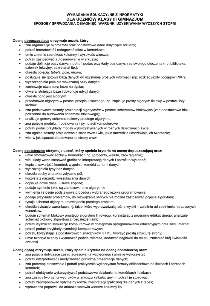 WYMAGANIA EDUKACYJNE Z INFORMATYKI DLA UCZNIÓW KLASY III GIMNAZJUM SPOSOBY SPRWDZANIA OSIĄGNIĘĆ, WARUNKI UZYSKIWANIA WYŻSZYCH STOPNI Ocenę dopuszczającą otrzymuje uczeń, który: zna organizację skoroszytu oraz podstawowe dane dotyczące arkuszy; potrafi formatować i redagować tekst w komórkach; umie zmienić szerokość kolumny i wysokość wiersza; potrafi zastosować autosumowanie w arkuszu; podaje definicję bazy danych, potrafi podać przykłady baz danych ze swojego otoczenia (np. biblioteka, dziennik lekcyjny, sekretariat itp.); określa pojęcia: tabela, pole, rekord; posługuje się gotową bazą danych do uzyskania prostych informacji (np. rozkład jazdy pociągów PKP); wyszczególnia pola dla wskazanej bazy danych; zachowuje utworzoną bazę na dysku; otwiera istniejącą bazę i dokonuje edycji danych; określa co to jest algorytm; przedstawia algorytm w postaci przepisu słownego, np. zapisuje prosty algorytm liniowy w postaci listy kroków; zna podstawowe zasady prezentacji algorytmów w postaci schematów blokowych (zna podstawowe bloki potrzebne do budowania schematu blokowego); analizuje gotowy schemat blokowy prostego algorytmu; zna pojęcie modelu, modelowania i symulacji komputerowej; potrafi podać przykłady modeli wykorzystywanych w różnych dziedzinach życia; zna ogólne zasady projektowania stron www i wie, jakie narzędzia umożliwiają ich tworzenie; wie, w jaki sposób zbudowane są strony www. Ocenę dostateczną otrzymuje uczeń, który spełnia kryteria na ocenę dopuszczającą oraz: umie sformatować liczby w komórkach np. (procenty, waluta, zaokrąglanie); wie, kiedy warto stosować graficzną interpretację danych i potrafi to wykonać; kopiuje zawartość komórek wypełnia komórki seriami danych; wyszczególnia typy baz danych; określa cechy charakterystyczne pól; korzysta z narzędzi wyszukiwania danych; dopisuje nowe dane i usuwa zbędne; podaje symbole jakie są zastosowane w algorytmie wymienia i stosuje podstawowe procedury wybranego języka programowania podaje przykłady problemów, do rozwiązania których nie można zastosować pojęcia algorytmu; rysuje schemat algorytmu rozwiązania prostego problemu; określa sytuacje warunkowe, tj. takie, które wyprowadzają różne wyniki – zależnie od spełnienia narzuconych warunków; buduje schemat blokowy prostego algorytmu liniowego, korzystając z programu edukacyjnego; analizuje schemat blokowy algorytmu z rozgałęzieniami; potrafi wyszukać symulacje komputerowe w dostępnym oprogramowaniu edukacyjnym oraz sieci Internet; potrafi podać przykłady symulacji komputerowych; potrafi, korzystając z podstawowych znaczników HTML, tworzyć prostą strukturę strony; umie tworzyć akapity i wymuszać podział wiersza, dodawać nagłówki do tekstu, zmieniać krój i wielkość czcionki. Ocenę dobrą otrzymuje uczeń, który spełnia kryteria na ocenę dostateczną oraz: zna pojęcia dotyczące zasad adresowania względnego i umie je wykorzystać; potrafi interpretować i modyfikować graficzną prezentację danych; zna potrzebę stosowania i potrafi praktycznie wykorzystać formuły obliczeniowe na liczbach i adresach komórek; potrafi efektywnie wykorzystywać podstawowe działania na komórkach i blokach; zna zasady tworzenia wydruków w arkuszu kalkulacyjnym i potrafi je stosować; potrafi zaproponować optymalny rodzaj interpretacji graficznej dla danych z tabeli; wprowadza poprawki do arkusza wstawia wiersze kolumny itp.; potrafi sortować tabele i znajdować dane; wskazuje przykłady baz danych różnego typu; porządkuje dane; potrafi skorzystać z bazy dostępnej w sieci Internet; modyfikuje strukturę bazy danych; czyta algorytmy wyodrębniając czynności elementarne; uzasadnia, że dane działanie nie nadaje się do przedstawienia w postaci algorytmu; potrafi zinterpretować przebieg symulacji; zna pojęcie rekurencji i potrafi podać jej przykłady; analizuje algorytmy, w których występują powtórzenia i określa, od czego zależy liczba powtórzeń; realizuje prostą sytuację warunkową w wybranym języku programowania; realizuje algorytm liniowy i z warunkami w arkuszu kalkulacyjnym; potrafi podać przykład algorytmu z pętlą; potrafi zapisać w wybranym języku programowania prosty algorytm oraz sprawdzić działanie napisanego programu; definiuje procedury w wybranym języku programowania z parametrami i bez parametrów oraz wywołuje je; potrafi podać przykłady modelowania oraz symulacji komputerowej; omawia, korzystając z gotowego przykładu na czym polega modelowanie; zna funkcje i zastosowanie najważniejszych znaczników HTML; potrafi wstawiać obrazy do utworzonych stron; umie tworzyć listy wypunktowane i numerowane i wstawiać hiperłącza. Ocenę bardzo dobrą otrzymuje uczeń, który spełnia kryteria na ocenę bardzo dobrą oraz: umie w odpowiednich sytuacjach stosować adresowanie względne i bezwzględne; zna potrzebę i celowość stosowania adresowania poprzez nazwę; potrafi wykonać arkusz z wykorzystaniem funkcji i stosować typowe funkcje obliczeniowe(suma, średnia, max, min, jeżeli); zna i potrafi stosować autofiltry z podstawowymi opcjami; dodaje rekordy do bazy danych; samodzielnie projektuje złożoną bazę danych; konstruuje proste algorytmy czynności z życia codziennego, określa przedstawioną sytuację jako algorytmiczną lub nie; przedstawia i rysuje schemat algorytmu określonego problemu; tworzy algorytmy z takich przedmiotów, jak matematyka, fizyka itp. w postaci przepisu słownego i w postaci schematu blokowego; tworzy prostą symulację za pomocą programu; przedstawia w postaci schematu blokowego prosty algorytm rekurencyjny; zapisuje algorytm z pętlą za pomocą schematu blokowego; potrafi uzasadnić sensowność wykorzystania symulacji komputerowych; potrafi wyszukać modele komputerowe w dostępnym oprogramowaniu edukacyjnym oraz sieci Internet; formatuje tekst na stronie, wstawia tabele; publikuje utworzone 