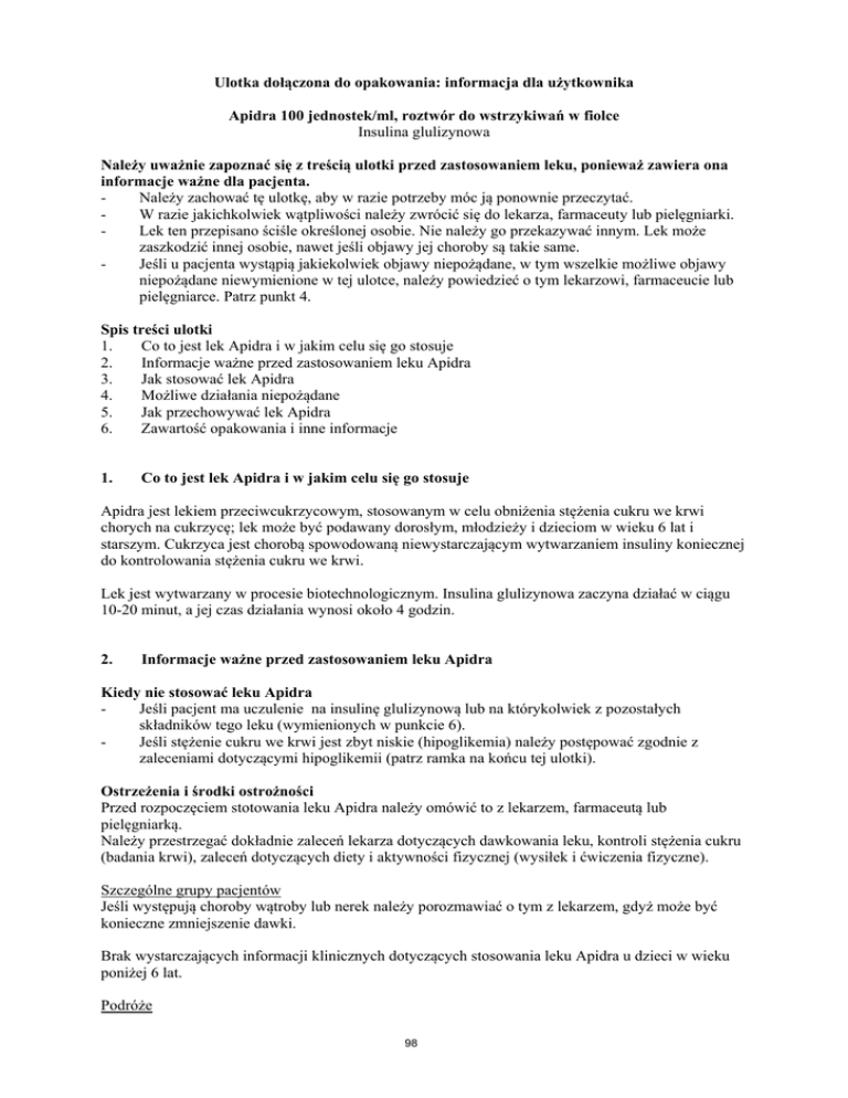 Ulotka dołączona do opakowania: informacja dla użytkownika Apidra 100 jednostek/ml, roztwór do wstrzykiwań w fiolce Insulina glulizynowa Należy uważnie zapoznać się z treścią ulotki przed zastosowaniem leku, ponieważ zawiera ona informacje ważne dla pacjenta. Należy zachować tę ulotkę, aby w razie potrzeby móc ją ponownie przeczytać. W razie jakichkolwiek wątpliwości należy zwrócić się do lekarza, farmaceuty lub pielęgniarki. Lek ten przepisano ściśle określonej osobie. Nie należy go przekazywać innym. Lek może zaszkodzić innej osobie, nawet jeśli objawy jej choroby są takie same. Jeśli u pacjenta wystąpią jakiekolwiek objawy niepożądane, w tym wszelkie możliwe objawy niepożądane niewymienione w tej ulotce, należy powiedzieć o tym lekarzowi, farmaceucie lub pielęgniarce. Patrz punkt 4. Spis treści ulotki 1. Co to jest lek Apidra i w jakim celu się go stosuje 2. Informacje ważne przed zastosowaniem leku Apidra 3. Jak stosować lek Apidra 4. Możliwe działania niepożądane 5. Jak przechowywać lek Apidra 6. Zawartość opakowania i inne informacje 1. Co to jest lek Apidra i w jakim celu się go stosuje Apidra jest lekiem przeciwcukrzycowym, stosowanym w celu obniżenia stężenia cukru we krwi chorych na cukrzycę; lek może być podawany dorosłym, młodzieży i dzieciom w wieku 6 lat i starszym. Cukrzyca jest chorobą spowodowaną niewystarczającym wytwarzaniem insuliny koniecznej do kontrolowania stężenia cukru we krwi. Lek jest wytwarzany w procesie biotechnologicznym. Insulina glulizynowa zaczyna działać w ciągu 10-20 minut, a jej czas działania wynosi około 4 godzin. 2. Informacje ważne przed zastosowaniem leku Apidra Kiedy nie stosować leku Apidra Jeśli pacjent ma uczulenie na insulinę glulizynową lub na którykolwiek z pozostałych składników tego leku (wymienionych w punkcie 6). Jeśli stężenie cukru we krwi jest zbyt niskie (hipoglikemia) należy postępować zgodnie z zaleceniami dotyczącymi hipoglikemii (patrz ramka na końcu tej ulotki). Ostrzeżenia i środki ostrożności Przed rozpoczęciem stotowania leku Apidra należy omówić to z lekarzem, farmaceutą lub pielęgniarką. Należy przestrzegać dokładnie zaleceń lekarza dotyczących dawkowania leku, kontroli stężenia cukru (badania krwi), zaleceń dotyczących diety i aktywności fizycznej (wysiłek i ćwiczenia fizyczne). Szczególne grupy pacjentów Jeśli występują choroby wątroby lub nerek należy porozmawiać o tym z lekarzem, gdyż może być konieczne zmniejszenie dawki. Brak wystarczających informacji klinicznych dotyczących stosowania leku Apidra u dzieci w wieku poniżej 6 lat. Podróże 98 Przed udaniem się w podróż wskazane jest omówienie z lekarzem następujących problemów: dostępność stosowanej insuliny w kraju docelowym, zaopatrzenie w insulinę, strzykawki itd, właściwe przechowywanie insuliny w czasie podróży, czas spożywania posiłków i przyjmowania insuliny w czasie podróży, ewentualne skutki zmiany strefy czasowej, ewentualne nowe czynniki ryzyka dotyczące zdrowia w kraju docelowym, co powinno się zrobić w sytuacjach zagrożenia gdy pacjent źle się poczuje lub zachoruje. Choroby i urazy W następujących przypadkach kontrolowanie cukrzycy powinno być bardzo staranne: wystąpienie choroby lub poważny uraz mogą stać się przyczyną wzrostu stężenia cukru we krwi (hiperglikemii), w przypadku spożycia zbyt małej ilości pokarmu stężenie cukru we krwi może się obniżyć (hipoglikemia). Często konieczna jest pomoc lekarza. Pacjent powinien mieć zapewniony szybki kontakt z lekarzem. Pacjenci z cukrzycą typu 1 (cukrzyca insulinozależna) powinni przyjmować dostateczną ilość węglowodanów i kontynuować leczenie insuliną. Osoby opiekujące się pacjentem powinny być poinformowane o konieczności stosowania insuliny przez pacjenta. U niektórych pacjentów z długotrwającą cukrzycą typu 2 i chorobą serca lub przebytym wcześniej udarem mózgu, leczonych jednocześnie pioglitazonem i insuliną wystapiła niewydolność serca. Jeśli wystąpią objawy niewydolności serca, takie jak nietypowe skrócenie oddechu lub szybki wzrost masy ciała lub miejscowe obrzęki, należy jak najszybciej poinformować o tym lekarza. Apidra a inne leki Niektóre leki powodują zmiany stężenia cukru we krwi (zmniejszenie, zwiększenie albo jedno i drugie, zależnie od sytuacji).W każdym z takich przypadków konieczna może być zmiana dawki insuliny aby uniknąć zbyt małego lub zbyt dużego stężenia cukru we krwi. Wskazane jest zachowanie ostrożności podczas rozpoczynania stosowania innego leku lub podczas kończenia jego przyjmowania. Należy powiedzieć lekarzowi lub farmaceucie o wszystkich lekach przyjmowanych przez pacjenta obecnie lub ostatnio, a także o lekach, które pacjent planuje przyjmować.Przed zastosowaniem nowego leku należy ustalić z lekarzem jaki wpływ może mieć ten lek na stężenie cukru we krwi i jakie, jeśli zajdzie potrzeba, środki zaradcze należy podjąć. Do leków, które mogą powodować zmniejszenie stężenia cukru (hipoglikemia) we krwi należą: wszystkie inne leki w leczeniu cukrzycy, inhibitory enzymu konwertazy angiotensyny (ACE) (stosowane w leczeniu niektórych chorób serca lub wysokiego ciśnienia krwi), dyzopiramid (stosowany w leczeniu niektórych chorób serca), fluoksetyna (stosowana w leczeniu depresji), fibraty (stosowane do obniżenia podwyższonego poziomu tłuszczów we krwi), inhibitory monoaminooksydazy (MAO) (stosowane w leczeniu depresji), pentoksyfilina, propoksyfen, salicylany (takie jak kwas acetylosalicylowy stosowany w łagodzeniu bólu i obniżaniu gorączki), antybiotyki sulfonamidowe. Do leków, które mogą powodować zwiększenie stężenia cukru we krwi (hiperglikemia) należą: kortykosteroidy (takie jak kortyzon stosowany w leczeniu stanów zapalnych), danazol (lek wpływający na owulację), diazoksyd (stosowany w leczeniu wy