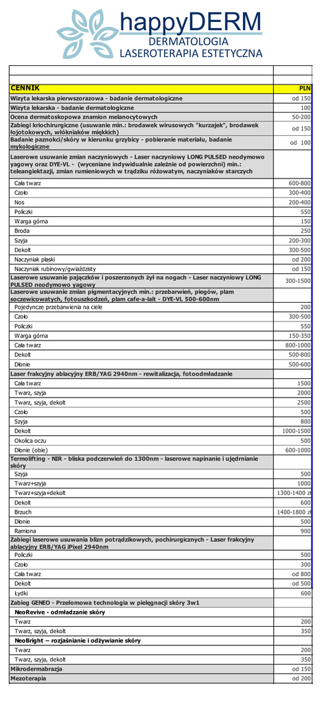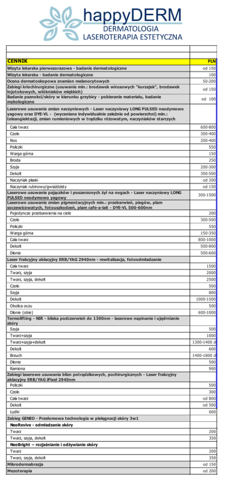 Cennik Happy Derm 2016 - dermatologia i laseroterapia