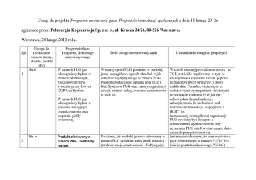 Uwagi do projektu Programu uwolnienia gazu. Projekt do konsultacji społecznych z dnia 13 lutego 2012r. zgłaszane przez: Polenergia Kogeneracja Sp. z o. o., ul. Krucza 24/26, 00-526 Warszawa. Warszawa, 28 lutego 2012 roku. Lp Uwaga do (wskazanie numeru strony, akapitu, punktu itp.) Str.6 1 Str. 6 2 Fragment tekstu Programu, do którego odnosi się uwaga Treść uwagi/proponowany zapis Uzasadnienie/uwagi do propozycji W ramach PUG gaz udostępniany będzie w Punkcie Wirtualnym, zlokalizowanym w systemie przesyłowym OGP Gaz-System. ……. W ramach PUG gaz udostępniany będzie w systemie aukcyjnym organizowanym przy wsparciu giełdy towarowej. W naszej opinii PUG powinien w bardziej jasny szczegółowy sposób określać w jak odbywać się będą aukcje w ramach PUG. Powinna zostać jasno opisane rola TGE i Gaz-System w PUG oraz zasady organizacji aukcji, miejsce aukcji, warunki uczestnictwa w nich itp. Produkt oferowany w ramach PUG - kontrakty roczne: Uważamy, że produkt gazowy oferowany w ramach PUG powinien mieć profil dostawy (strukturyzację, elastyczność - ToP) zgodny W chwili obecnej prowadzenie obrotu na TGE jest ściśle regulowane, w tym w szczególności składanie zleceń. poprzez licencjonowanych brokerów i domy maklerskie. Ponadto, wiąże się to z dodatkowymi wymaganiami stawianymi uczestnikom rynku na TGE jak np.: odpowiednie konta bankowe, zabezpieczenia do rachunków pod realizowane transakcje, współpraca z IRGIT itp. Jasne zasady szczegółowej organizacji PUG powinny być dostępne z odpowiednim wyprzedzeniem, aby uczestnicy PUG mieli wystarczająco dużo czasu do przygotowania się. Jest nieuzasadnionym, że cena wyjściowa gazu oferowanego w ramach PUG (70% ilości z portfela zakupowego PGNiG) Transze –10 000 MWh (~ 1 mln m3). Okres dostawy – odpowiednio rok 2013, 2014 i 2015. Termin rozpoczęcia dostaw – 1 stycznia każdego roku. Profil dostawy – stały. Cena dostawy – w pierwszym kwartale 2013 roku - cena ustalona w ramach aukcji PUG; w kolejnych kwartałach cena indeksowana zgodnie z metodą zdefiniowaną w Porozumieniu Regulacyjnym. Wyjściowa cena gazu oferowanego w ramach aukcji PUG, ustalana będzie w oparciu o cenę hurtową uwzględniającą średnie koszty pozyskania paliwa ze średnim profilem pozyskania gazu przez PGNiG lub jego cena nie powinna obejmować kosztów strukturyzacji gazu importowanego. będzie ustalana jako średni koszt pozyskania gazu, podczas gdy profil dostawy tego produktu jest stały. W średnim koszcie gazu uwzględnione zostaną również koszty strukturyzacji kontraktów importowych PGNiG tzn. magazynowania gazu poza Polską i dostarczania go do PGNiG w kontraktach elastycznych. Uczestnicy aukcji kupując gaz w ramach PUG zapłacą za tą strukturyzację podczas gdy otrzymają produkt bazowy o stałym profilu odbioru. W związku z tym, PGNiG posiadając dla przykładu np. przeciętnie 30% elastyczności w portfelu zakupowym, sprzeda większość gazu na aukcji w dostawach o profilu stałym, natomiast całą elastyczność będzie mógł wykorzystać do obsługi klientów w ramach pozostałej nieuwolnionej części gazu. Oznacza to subsydiowanie skrośne i przeniesienie kosztów magazynowania gazu importowanego przez PGNiG na odbiorców, którzy będą odbierali gaz uwolniony w ramach PUG. W związku z tym uważamy, że albo produkt oferowany na aukcji powinien charakteryzować się przeciętnym profilem dostaw (strukturyzacją) dla całego portfela gazu pozyskiwanego przez PGNiG albo cena gazu uwalnianego w ramach PUG nie gazowego przez PGNiG ze wszystkich źródeł,…. Strona 7 3 W celu zapewnienia pokrycia przez PGNiG poniesionych rzeczywistych kosztów pozyskania gazu oraz uniknięcia sytuacji, w której PGNiG generuje nieuzasadnione zyski z działalności obrotu hurtowego wprowadzony zostanie precyzyjnie zdefiniowany system okresowej indeksacji ceny gazu oferowanego w ramach PUG (cena aukcyjna w pierwszym kwartale dostaw PUG; indeksacja w kolejnych kwartałach dostaw PUG do 31 grudnia 2015 roku). PUG i Porozumienie regulacyjne powinno określać metodologię indeksacji wyjściowej ceny gazu, w tym również, które elementy cenotwórcze w będą indeksowane. Metodologia indeksacji powinna również być elementem konsultacji społecznych, tak jak odbywa się to wobec metody ustalania ceny gazu w PUG. powinna obejmować kosztów jego magazynowania uwzględnionych w kontraktach importowych. Nie znając metodologii indeksacji uczestnicy nie wiedzą jakie występują czynniki cenotwórcze w formule ceny gazu kupowanej w PUG oraz nie mogą ocenić ryzyka zmienności ceny gazu w PUG w porównaniu do gazu na giełdach w Europie. Cena gazu jest podstawowym parametrem i uczestnicy rynku powinni mieć możliwość wypowiedzenia się na temat metodologii zmian ceny i elementów które będą wpływały na cenę kupowanego gazu. W naszej opinii bardzo istotnym jest, aby w metodzie indeksacji ceny, uwzględnić zmiany ceny gazu z importu, które mogą nastąpić w wyniku negocjacji pomiędzy PGNiG i np. Gazprom. Może to istotnie obniżyć konkurencyjność gazu kupionego w ramach PUG. Ponadto, cena oferowanego gazu w ramach PUG będzie określana jako średni koszt pozyskania gazu i będzie uwzględniała wagi w postaci ilości gazu pochodzącego z danego źródła pozyskania w całym koszyku. W związku z tym, jeżeli w późniejszym okresie PGNiG zmieni w Strona 7 Strona 9 W celu zwiększenia atrakcyjności PUG zakładane jest wprowadzenie dyskonta w stosunku do ceny hurtowej, motywującego potencjalnych uczestników aukcji do zakupu gazu w ramach PUG. Poziom dyskonta ceny gazu oferowanego w ramach PUG w stosunku do ceny hurtowej będzie równy marży hurtowej PGNiG. Ustalenie jednoznacznej metody wyznaczenia ceny gazu oferowanego w PUG. I. Rynek PUG – obejmujący sprzedaż przez PGNiG gazu ziemnego pochodzącego z importu oraz wydobycia krajowego innym uczestnikom rynku Rynek PUG w definicji powinien obejmować 