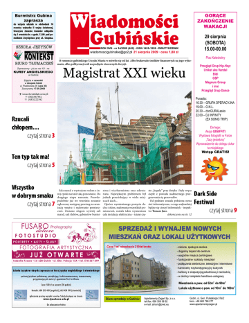 GORĄCE ZAKOŃCZENIE WAKACJI Burmistrz Gubina zaprasza do wzięcia udziału w obchodach 70 rocznicy wybuchu II wojny światowej. Uroczyste złożenie kwiatów odbędzie się 1 września br. o godz. 12.00 pod pomnikiem Zwycięstwa przy ul. Chopina. 29 sierpnia (SOBOTA) 15.00-00.00 O remoncie gubińskiego Urzędu Miasta w mówiło się od lat. Albo brakowało środków finansowych na jego wykonanie, albo politycznej woli na podjęcie stosownych decyzji. Zapraszamy - już po raz 12! - na KURSY ANGIELSKIEGO w Gubinie Zajęcia w czwartki w Zespole Szkół ul. Piastowska 26 (sala 30) Zaczynamy 17.09.2009 Magistrat XXI wieku www.kontekst.com.pl 0601967461 (68)3222542 Do tego: Akcja GRAFFITI Wystawa fotografii w Farze „Tacy jesteśmy” Wprowadzenie do obiegu dukata miejskiego Wstęp GRATIS! Ten typ tak ma! czytaj strona 5 Sala narad z wystrojem rodem z innej epoki narazie taką pozostanie. Do drugiego etapu remontu. Prawdopodobnie już we wrześniu zostanie ogłoszony następny przetarg na aranżację wnętrz i malowanie pomieszczeń. Zmianie ulegnie wystrój sali narad, sali ślubów, gabinetów burmi- strza i wiceburmistrza oraz sekretariatu. Największym problemem był jednak przeciekający w wielu miejscach dach... Oprócz wymienionego poszycia dachu i okien, malowania wszystkich pomieszczeń, została także wymieniona cała instalacja elektryczna - ściany czę- Szkoła Języków obcych zaprasza na kurs języka angielskiego i niemieckiego poziomy językowe: podstawowy, początkujący, średniozaawansowany, zaawansowany, przygotowujący do matury i egzaminów First Certificate. Cena: 500 zł za semestr (30 godzin) Kontakt: 600 355 489 (angielski), 605 424 999 (niemiecki) zgłoszenia prosimy wysyłać na adres Szkoły dostepny na stronie www.tymoteusz.edu.pl ww Szkoła Języków obcych zaprasza na kurs języka angielskiego i niemieckiego poziomy językowe: podstawowy, początkujący, średniozaawansowany, zaawansowany, przygotowujący do matury i egzaminów First Certificate. Przegląd Grup Hip-Hop: Unikat aka Vandal Bidi GSP Magnum Group i inni Przegląd Grup Dance Ponadto: 16.30 – GRUPA OPERACYJNA 19.00 – O.N.L. 20.30 – donGURALesko 22.00 – DJ INFINITY (EX SONIC TRIP) Rzucali chłopem… czytaj strona 3 Wszystko w dobrym smaku czytaj strona 7 Plac Katedralny Do zobaczenia wkrótce Szkoła Języków obcych zaprasza na kurs języka angielskiego i niemieckiego poziomy językowe: podstawowy, początkujący, średniozaawansowany, zaawansowany, przygotowujący do matury i egzaminów First Certificate. Cena: 500 zł za semestr (30 godzin) Cena: 500 zł za semestr (30 godzin) Kontakt: 600 355 489 (angielski), 605 424 999 (niemiecki) Kontakt: 600 355 489 (angielski), 605 424 999 (niemiecki) zgłoszenia prosimy wysyłać na adres Szkoły dostepny na stronie ww www.tymoteusz.edu.pl zgłoszenia prosimy wysyłać na adres Szkoły dostepny na stronie ww www.tymoteusz.edu.pl Do zobaczenia wkrótce Do zobaczenia wkrótce sto „kopały” przy dotyku i były wręcz ciepłe z powodu nadmiernego przegrzewania się przewodów. Od podstaw została położona nowa sieć informatyczna, z czego najbardziej będzie się cieszył informatyk - inspektor Tomasz Jans. dokończenie na str. 12 Dark Side Festiwal czytaj strona 9 Miasto i okolice Urodzenia Weronika Sykuła, Dawid Siwik, Nikodem Mazurek, Dawid Jarzembowski, Liliana Wiśniewska, Hubert Śledź, Filip Budnik, Maciej Sękowski, Zuzanna Ogrodniczek, Maja Kowal. Zgony Scholastyka Kochanowska-Lisowska l. 87, Jan Pawłowski l. 62, Edward Kiwka l. 66, Maria Goszczyńska l. 57, Alina Wieja l. 59, Adela Wąsik l. 82, Kazimierz Golumski l. 63. Rzeczowo i skutecznie W dość nietypowym terminie odbyła się XXXIII sesja Rady Miejskiej w Gubinie. Tym razem radni obradowali w poniedziałek. Ze względu na remont magistratu, spotkanie odbyło się w Galerii Ratusz Gubińskiego Domu Kultury. Na powitanie przewodniczący Rady Miasta Leszek Ochotny powitał specjalnych gości starostę Jacka Hoffmanna i wicestarostę Janinę Pawlik. Ich obecność była związana ze sprawą prywatyzacji szpitala. Tej kwestii radni poświęcili najwięcej czasu. Najpierw szczegóły zmian wyjaśniał starosta. Jak wiemy, rozpatrywano dwie możliwości, z których wybrano wyłonienie tzw. operatora zewnętrznego. Miałby on zarządzać szpitalem od nowego roku. Konkurs na operatora ma być rozstrzygnięty do końca września. Ponieważ nie wszystko było dla radnych do końca jasne, skorzystali z możliwości zadawania pytań. Pytano między innymi o to, co stanie placówkach w Polsce, a starosta przekonywał, że tylko w naszym województwie wstępne umowy w tej sprawie zawarło parę szpitali. Radny Marcin Sikora pochwalił J.Hoffmanna za to, że jest pierwszym starostą, który tak chętnie spotyka się i udziela radnym informacji na temat szpitala. J.Hoffmann przyznał, że zna obawy gubińskiego personelu i jego zdystansowany stosunek do zmian. Stwierdził jednak, że rozmawiając, da się pokonać wątpliwości. Tak właśnie było z pracownikami szpitala w Krośnie Odrzańskim. Gdy nadchodził moment wyrażenia opinii przez Radę Miejską, o przerwę poprosił Wojciech Sendera. Po przerwie postanowiono przychylić się do zmian, gdyż stwierdzono, że gorzej być nie może i powiat musi wziąć odpowiedzialność za losy szpitala. Starosta, dziękując za wyrażenie opinii, zaznaczył, że decyzja zapadnie właśnie w powiecie – 19 sierpnia podczas kolejnej sesji Rady Powiatu. Nr 14 z 21.08.2009 Gubinki tuż, tuż Pisaliśmy w poprzednim numerze o lokalnej monecie. Przypominamy, że Gubinki wejdą do obiegu 29 sierpnia podczas „Koncertu na zakończenie lata”. Do zdobycia będzie także limitowana seria 6 Gubinek w ozdobnym blistrze. Agnieszka Ludkiewicz z Karkonoskiego Domu Numizmatycznego przekazała nam wstępną listę punktów, gdzie honorowane będą Gubinki: „RAB” ul. Obr. Pokoju 13A, Firma Jubilersko Zegarmistrzowska, upominki ul. Śląska 15, Galeria „Ra