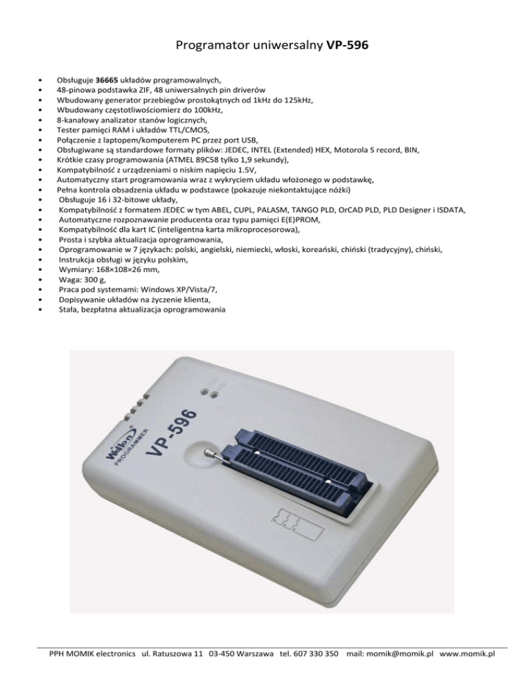 Programator uniwersalny VP‐596 • • • • • • • • • • • • • • • • • • • • • • • • Obsługuje 36665 układów programowalnych, 48‐pinowa podstawka ZIF, 48 uniwersalnych pin driverów Wbudowany generator przebiegów prostokątnych od 1kHz do 125kHz, Wbudowany częstotliwościomierz do 100kHz, 8‐kanałowy analizator stanów logicznych, Tester pamięci RAM i układów TTL/CMOS, Połączenie z laptopem/komputerem PC przez port USB, Obsługiwane są standardowe formaty plików: JEDEC, INTEL (Extended) HEX, Motorola S record, BIN, Krótkie czasy programowania (ATMEL 89C58 tylko 1,9 sekundy), Kompatybilność z urządzeniami o niskim napięciu 1.5V, Automatyczny start programowania wraz z wykryciem układu włożonego w podstawkę, Pełna kontrola obsadzenia układu w podstawce (pokazuje niekontaktujące nóżki) Obsługuje 16 i 32‐bitowe układy, Kompatybilność z formatem JEDEC w tym ABEL, CUPL, PALASM, TANGO PLD, OrCAD PLD, PLD Designer i ISDATA, Automatyczne rozpoznawanie producenta oraz typu pamięci E(E)PROM, Kompatybilność dla kart IC (inteligentna karta mikroprocesorowa), Prosta i szybka aktualizacja oprogramowania, Oprogramowanie w 7 językach: polski, angielski, niemiecki, włoski, koreański, chiński (tradycyjny), chiński, Instrukcja obsługi w języku polskim, Wymiary: 168×108×26 mm, Waga: 300 g, Praca pod systemami: Windows XP/Vista/7, Dopisywanie układów na życzenie klienta, Stała, bezpłatna aktualizacja oprogramowania PPH MOMIK electronics ul. Ratuszowa 11 03‐450 Warszawa tel. 607 330 350 mail: [email protected] www.momik.pl