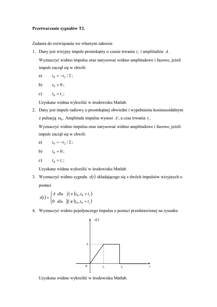 Przetwarzanie sygnałów T2. Zadania do rozwiązania we własnym zakresie 1. Dany jest wizyjny impuls prostokątny o czasie trwania t i i amplitudzie A . Wyznaczyć widmo impulsu oraz narysować widmo amplitudowe i fazowe, jeżeli impuls zaczął się w chwili: a) t 0 = −t 2 / 2 ; b) t0 = 0 ; c) t0 = ti ; Uzyskane widma wykreślić w środowisku Matlab. 2. Dany jest impuls radiowy o prostokątnej obwiedni i wypełnieniu kosinusoidalnym z pulsacją ω0 . Amplituda impulsu wynosi A , a czas trwania t i . Wyznaczyć widmo impulsu oraz narysować widmo amplitudowe i fazowe, jeżeli impuls zaczął się w chwili: a) t 0 = −t 2 / 2 ; b) t0 = 0 ; c) t0 = ti ; Uzyskane widma wykreślić w środowisku Matlab. 3. Wyznaczyć widmo sygnału x(t ) składającego się z dwóch impulsów wizyjnych o postaci A dla t ∈ (t 0 , t 0 + t i ) x(t ) = 0 dla t ∉ (t 0 , t 0 + t i ) 4. Wyznaczyć widmo pojedynczego impulsu o postaci przedstawionej na rysunku x(t ) A 0 t1 t2 Uzyskane widmo wykreślić w środowisku Matlab. t