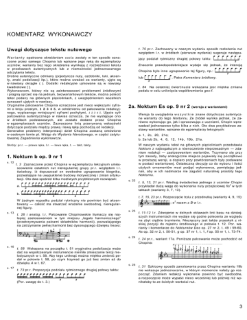 KOMENTARZ WYKONAWCZY Uwagi dotyczące tekstu nutowego t. 75 pr.r. Zachowany w naszym wydaniu sposób rozłożenia nut względem l.r. w źródłach (pierwsze wydania) sugeruje następu- W a r i a n t y opatrzone określeniem ossia zostały w ten sposób oznaczone przez samego Chopina lub wpisane jego ręką do egzemplarzy uczniów; warianty bez tego określenia wynikają z rozbieżności tekstu w przekazach autentycznych lub z niemożności jednoznacznego odczytania tekstu. Drobne autentyczne odmiany (pojedyncze nuty, ozdobniki, łuki, akcenty, znaki pedalizacji itp.), które można uważać za warianty, ujęte są w nawiasy okrągłe ( ). Dodatki redakcyjne ujmowane są w nawiasy kwadratowe [ ]. Wykonawcom, którzy nie są zainteresowani problemami źródłowymi i pragną oprzeć się na jednym, bezwariantowym tekście, można polecić tekst podany na głównych pięcioliniach, z uwzględnieniem wszelkich oznaczeń ujętych w nawiasy. Oryginalne palcowanie Chopina oznaczone jest nieco większymi cyframi o kroju prostym, 1 2 3 4 5 , w odróżnieniu od palcowania redakcyjnego, wypisanego mniejszymi cyframi pochyłymi, 1 2 3 4 5 . Ujęcie cyfr palcowania autentycznego w nawias oznacza, że nie występuje ono w źródłach podstawowych, ale zostało dodane przez Chopina w egzemplarzach uczniów. Zaznaczone linią przerywaną wskazówki dotyczące podziału między prawą i lewą rękę pochodzą od redakcji. Generalne problemy interpretacji dzieł Chopina zostaną omówione w osobnym tomie pt. Wstęp do Wydania Narodowego, w części zatytułowanej Zagadnienia wykonawcze. jący podział rytmiczny drugiej połowy taktu: Chopina było inne ugrupowanie tej figury, np.: lub a. b. 3 5 5 t. 84 Na ostatniej ćwierćnucie wskazana jest miękka zmiana pedału w celu uniknięcia współbrzmienia ges-f. 2a. Nokturn Es op. 9 nr 2 a. 1, 2c, 20, 21a; b. 2a lub 2b, 4, 6, 12, 14b, 19b, 21a. W naszym wydaniu tekst na głównych pięcioliniach przedstawia Nokturn z najbogatszym a równocześnie nieprzesadnym — zdaniem redakcji — zastosowaniem wariantów. Trzymano się przy tym zasady, żeby analogiczne miejsca pojawiały się początkowo w prostszej wersji, a dopiero przy powtórzeniach były podawane w postaci wariantowej. Ostateczną decyzję co do wyboru i ilości użytych ornamentów musi podjąć wykonawca, pamiętając jednak, aby w ich nadmiarze nie zagubić naturalnej prostoty tego Nokturnu. s. 22 8 2 ; e razem z B w l.r. s. 23 t. 26 i analog. l.r. Palcowanie Chopinowskie tłumaczy się najlepiej zastosowaniem w tym miejscu „legato harmonicznego” (przetrzymywania palcami składników harmonii), pozwalającego na zatrzymanie pełnej harmonii bez dysonującego dźwięku heses: 1 1 s. 24 s. 16 s. 17 t. 5, 13, 21 pr.r. Według świadectwa jednego z uczniów Chopin 2 przykładał dużą wagę do wykonania nuty przejściowej fis w tych taktach (warianty 3, 7, 13). t. 7, 15, 23 pr.r. Rozpoczęcie trylu z przednutką (warianty 4, 9, 15): W żadnym wypadku podział rytmiczny nie powinien być akcentowany — całość ma stwarzać wrażenie swobodnej, nieregularnej figury. s. 13 t. 11-12 l.r. Zdwojenie w dolnych oktawach linii basu na dzisiejszych instrumentach nie wydaje się godne polecenia ze względu na zbyt ciężkie brzmienie. Niezręczny jest także przeskok z niskiej pozycji do rejestru środkowego w połowie t. 12. Por. warianty i komentarze do Nokturnów Des op. 27 nr 2, t. 49 i 59-60, As op. 32 nr 2, t. 50-51, g op. 37 nr 1, t. 1, f op. 55 nr 1, t. 73-74. t. 24 pr.r., wariant 17a. Poniższe palcowanie może pochodzić od Chopina: 85 5 t. 58 Wskazana na początku t. 51 oryginalna pedalizacja może dać na współczesnym instrumencie niemiłe zmieszanie tercji melodycznych w t. 58. Aby tego uniknąć można miękko zmienić pedał w połowie t. 58, po czym trzymać go już bez zmian aż do dźwięku A w t. 67. t. 73 pr.r. Propozycja podziału rytmicznego drugiej połowy taktu: (Por. uwagę do t. 3.) 3 5 (wersja z wariantami) Wersja ta uwzględnia w s z y s t k i e znane dotychczas autentyczne warianty do tego Nokturnu. Ze źródeł wynika jednak, że zarówno wykonując go, jak i opracowując z uczniami, Chopin wprowadzał jednorazowo tylko kilka z nich. Oto dwa przykładowe zestawy wariantów, wpisane do egzemplarzy lekcyjnych: 4 5 7 . Patrz Komentarz źródłowy. 3 1. Nokturn b op. 9 nr 1 t. 3 Zaznaczone przez Chopina w egzemplarzu lekcyjnym umiejscowienie ostatnich nut nieregularnej grupy pr.r. względem l.r. świadczy, iż dopuszczał on swobodne ugrupowanie biegnika, pozwalające na uwypuklenie budowy motywicznej i zmian artykulacji. Oto dwa spośród kilku możliwych przybliżonych rozwiązań: . Znacznie prawdopodobniejsze wydaje się jednak, że intencją Skróty: pr.r. — prawa ręka, l.r. — lewa ręka, t. — takt, takty. s. 12 3 3 s. 25 1 4 5 2 1 4 2 3 1 4 1 3 2 5 1 4 3 2 1 4 2 3 1 t. 31 Szkicowy sposób zanotowania przez Chopina wariantu 19b nie wskazuje jednoznacznie, w którym momencie należy go rozpocząć. Zdaniem redakcji wykonanie powinno być swobodne, a rozpoczęcie może wypaść nieco wcześniej lub później niż wynikałoby to ze ścisłych wartości nut. 3 Komentarz wykonawczy 3. Nokturn H op. 9 nr 3 5. Nokturn Fis op. 15 nr 2 s. 26 s. 40 s. 30 t. 14, 16 i analog. pr.r. Tego rodzaju przednutki należy rozpoczynać równocześnie z odpowiednią nutą l.r. t. 88-129 pr.r. W całej środkowej części Nokturnu: 3 3 a = 3 = 3 3 s. 41 3 s. 43 4. Nokturn F op. 15 nr 1 t. 7, 15, 55 pr.r. W jednym z egzemplarzy lekcyjnych Chopin 1 dopisał przednutki fisis przed trylami w tych taktach, ujednolicając tym samym wykonanie tego szczegółu na wzór t. 56 (patrz komentarz do tego taktu). Zachowanie zróżnicowania wydaje się jednak godne polecenia. Możliwe są też rozwiązania pośrednie — np. tryl z przednutką tylko w t. 15 i 56 (por. Nokturn f op. 55 nr 1, t. 6). t. 28 Znak dodany przez Chopina w egzemplarzu lekcyjnym na1 kazuje grać w tym takcie a, 2. ósemkę l.r., 