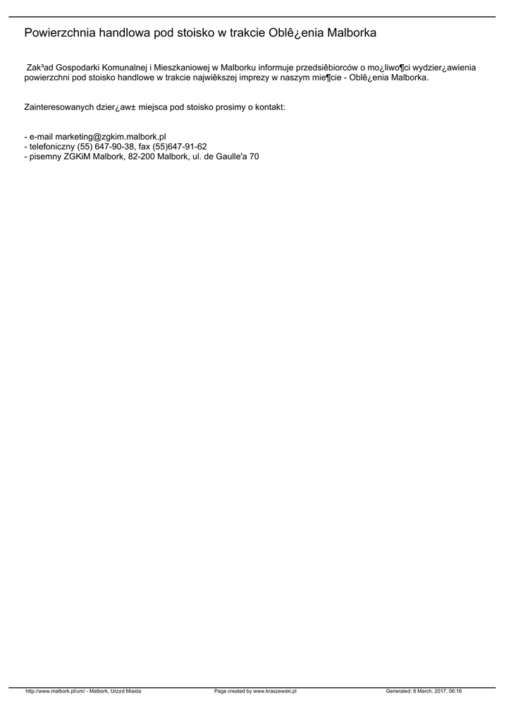 Powierzchnia handlowa pod stoisko w trakcie Oblê¿enia Malborka Zak³ad Gospodarki Komunalnej i Mieszkaniowej w Malborku informuje przedsiêbiorców o mo¿liwo¶ci wydzier¿awienia powierzchni pod stoisko handlowe w trakcie najwiêkszej imprezy w naszym mie¶cie - Oblê¿enia Malborka. Zainteresowanych dzier¿aw± miejsca pod stoisko prosimy o kontakt: - e-mail [email protected] - telefoniczny (55) 647-90-38, fax (55)647-91-62 - pisemny ZGKiM Malbork, 82-200 Malbork, ul. de Gaulle'a 70 http://www.malbork.pl/um/ - Malbork, Urz±d Miasta Page created by www.kraszewski.pl Generated: 8 March, 2017, 06:16