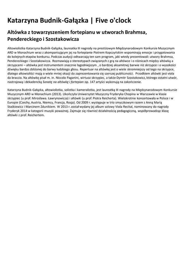 Katarzyna Budnik-Gałązka | Five o'clock Altówka z towarzyszeniem fortepianu w utworach Brahmsa, Pendereckiego i Szostakowicza Altowiolistka Katarzyna Budnik-Gałązka, laureatka III nagrody na prestiżowym Międzynarodowym Konkursie Muzycznym ARD w Monachium wraz z akompaniującym jej na fortepianie Piotrem Kopczyńskim wspominają emocje i przygotowania do kolejnych etapów konkursu. Podczas audycji odtwarzają ten sam program, jaki wtedy prezentowali: utwory Brahmsa, Pendereckiego i Szostakowicza. Rozmawiają o stereotypach związanych z grą na altówce i o różnicach między altówką a skrzypcami – altówka jest instrumentem znacznie łagodniejszym , o bardziej aksamitnej barwie niż skrzypce i o wysokości dźwięku bardzo zbliżonej do barwy ludzkiego głosu. Repertuar na altówkę jest o wiele skromniejszy od tego na skrzypce, dlatego altowioliści mają o wiele mniej okazji do zaprezentowania się szerszej publiczności. Przodkiem altówki jest viola da braccio. Na altówkę pisał m. in. Niccolo Paganini, wirtuoz skrzypiec, a także Dymitr Szostakowicz, którego ostatni utwór, nastrojową i dekadencką Sonatę na altówkę i fortepian op. 147 artyści wykonują na zakończenie. Katarzyna Budnik-Gałązka, altowiolistka, solistka i kameralistka, jest laureatką III nagrody na Międzynarodowym Konkursie Muzycznym ARD w Monachium (2013). Ukończyła Uniwersytet Muzyczny Fryderyka Chopina w Warszawie w klasie skrzypiec (u prof. Mirosława. Ławrynowicza) i altówki (u prof. Piotra Reicherta). Wielokrotnie koncertowała w Polsce i w Europie (Czechy, Austria, Niemcy, Francja, Rosja). Od 2009 r. występuje w trio smyczkowym razem z Anną Marią Staśkiewicz i Marcinem Zdunikiem. W 2013 r. został wydany jej album solowy Viola Recital, nominowany do nagrody Fryderyk 2014 w kategorii muzyki poważnej. Zajmuje się również działalnością pedagogiczną, współprowadząc klasę altówki z prof. Reichertem.