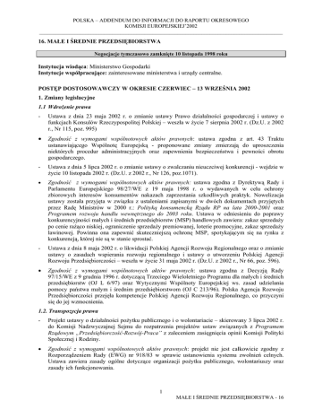 POLSKA – ADDENDUM DO INFORMACJI DO RAPORTU OKRESOWEGO KOMISJI EUROPEJSKIEJ’2002 __________________________________________________________________________________________ 16. MAŁE I ŚREDNIE PRZEDSIĘBIORSTWA Negocjacje tymczasowo zamknięte 10 listopada 1998 roku Instytucja wiodąca: Ministerstwo Gospodarki Instytucje współpracujące: zainteresowane ministerstwa i urzędy centralne. POSTĘP DOSTOSOWAWCZY W OKRESIE CZERWIEC – 13 WRZEŚNIA 2002 1. Zmiany legislacyjne 1.1 Wdrożenie prawa - Ustawa z dnia 23 maja 2002 r. o zmianie ustawy Prawo działalności gospodarczej i ustawy o funkcjach Konsulów Rzeczypospolitej Polskiej – weszła w życie 7 sierpnia 2002 r. (Dz.U. z 2002 r., Nr 115, poz. 995) • Zgodność z wymogami wspólnotowych aktów prawnych: ustawa zgodna z art. 43 Traktu ustanawiającego Wspólnotę Europejską - proponowane zmiany zmierzają do uproszczenia niektórych procedur administracyjnych oraz zapewnienia bezpieczeństwa i pewności obrotu gospodarczego. - Ustawa z dnia 5 lipca 2002 r. o zmianie ustawy o zwalczaniu nieuczciwej konkurencji - wejdzie w życie 10 listopada 2002 r. (Dz.U. z 2002 r., Nr 126, poz.1071). • Zgodność z wymogami wspólnotowych aktów prawnych: ustawa zgodna z Dyrektywą Rady i Parlamentu Europejskiego 98/27/WE z 19 maja 1998 r. o wydawanych w celu ochrony zbiorowych interesów konsumentów nakazach zaprzestania szkodliwych praktyk. Nowelizacja ustawy została przyjęta w związku z ustaleniami zapisanymi w dwóch dokumentach przyjętych przez Radę Ministrów w 2000 r.: Polityką konsumencką Rządu RP na lata 2000-2001 oraz Programem rozwoju handlu wewnętrznego do 2003 roku. Ustawa w odniesieniu do poprawy konkurencyjności małych i średnich przedsiębiorstw (MSP) handlowych zawiera: zakaz sprzedaży po cenie rażąco niskiej, ograniczenie sprzedaży premiowanej, loterie promocyjne, zakaz sprzedaży lawinowej. Powinna ona zapewnić skuteczniejszą ochronę MSP, spotykającym się na rynku z konkurencją, której nie są w stanie sprostać. - Ustawa z dnia 8 maja 2002 r. o likwidacji Polskiej Agencji Rozwoju Regionalnego oraz o zmianie ustawy o zasadach wspierania rozwoju regionalnego i ustawy o utworzeniu Polskiej Agencji Rozwoju Przedsiębiorczości – weszła w życie 31 maja 2002 r. (Dz.U. z 2002 r., Nr 66, poz. 596). • Zgodność z wymogami wspólnotowych aktów prawnych: ustawa zgodna z Decyzją Rady 97/15/WE z 9 grudnia 1996 r. dotyczącą Trzeciego Wieloletniego Programu dla małych i średnich przedsiębiorstw (OJ L 6/97) oraz Wytycznymi Wspólnoty Europejskiej ws. zasad udzielania pomocy państwa małym i średnim przedsiębiorstwom (OJ C 213/96). Polska Agencja Rozwoju Przedsiębiorczości przejęła kompetencje Polskiej Agencji Rozwoju Regionalnego, co przyczyni się do jej wzmocnienia. 1.2. Transpozycja prawa - Projekt ustawy o działalności pożytku publicznego i o wolontariacie – skierowany 3 lipca 2002 r. do Komisji Nadzwyczajnej Sejmu do rozpatrzenia projektów ustaw związanych z Programem Rządowym „Przedsiębiorczość-Rozwój-Praca” z zaleceniem zasięgnięcia opinii Komisji Polityki Społecznej i Rodziny. • Zgodność z wymogami wspólnotowych aktów prawnych: projekt nie jest całkowicie zgodny z Rozporządzeniem Rady (EWG) nr 918/83 w sprawie ustanowienia systemu zwolnień celnych. Ustawa zawiera zasady ogólne dotyczące organizacji pożytku publicznego, wolontariuszy oraz zasady ich funkcjonowania. 1 MAŁE I ŚREDNIE PRZEDSIĘBIORSTWA - 16 POLSKA – ADDENDUM DO INFORMACJI DO RAPORTU OKRESOWEGO KOMISJI EUROPEJSKIEJ’2002 __________________________________________________________________________________________ - Projekt ustawy - przepisy wprowadzające ustawę o działalności pożytku publicznego i o wolontariacie – 3 lipca 2002 r. skierowany do Komisji Nadzwyczajnej Sejmu do rozpatrzenia projektów ustaw związanych z Programem Rządowym „Przedsiębiorczość-Rozwój-Praca” z zaleceniem zasięgnięcia opinii Komisji Polityki Społecznej i Rodziny. • Zgodność z wymogami wspólnotowych aktów prawnych: w zakresie proponowanych zwolnień podatkowych projekt zgodny z Szóstą Dyrektywą Rady 77/388/EWG z 17 maja 1977 r. w sprawie harmonizacji przepisów państw członkowskich dotyczących podatków obrotowych – wspólny system podatku od wartości dodanej - ujednolicona podstawa wymiaru podatku (OJ L 145/77) oraz w zakresie zwolnień celnych zastosowanych do dnia przystąpienia do UE z Rozporządzeniem Rady (EWG) nr 918/83 z 28 marca 1983 r. w sprawie ustanowienia systemu zwolnień celnych (OJ L 271/86). 2. Zmiany instytucjonalne Polska Agencja Rozwoju Przedsiębiorczości (PARP), funkcjonująca od 1 stycznia 2001 r., przyczynia się do wzrostu konkurencyjności sektora MSP w Polsce. W związku z przejęciem zadań Agencji Techniki i Technologii, a od 1 czerwca 2002 r. również zadań zlikwidowanej Polskiej Agencji Rozwoju Regionalnego, nastąpiło rozszerzenie kręgu adresatów działań PARP oraz palety instrumentów realizacyjnych. Wśród działań PARP przejętych od ATT, znalazło się m.in. prowadzenie działań na rzecz realizacji programów polityki państwa w dziedzinie wykorzystania nowych technik i technologii w gospodarce. W celu realizacji nowego zadania (dokumenty programowe są w trakcie opracowywania) rola PARP będzie polegała na: - wydawaniu opinii o technicznych i ekonomicznych perspektywach, możliwościach i warunkach wykorzystania nowych technik i technologii w gospodarce, które mogą być przedstawiane przy ubieganiu się o uzyskanie pożyczki lub kredytu; - udzielaniu przedsiębiorcom pożyczek zaciąganych dla potrzeb gospodarczego wykorzystania nowoczesnych rozwiązań w zakresie techniki i technologii. Ponadto PARP przejął od ATiT zadanie polegające na organizacji Konkursu "Polski Produkt Przyszłości", który ma na celu promocję innowacyjnych rozwiązań technicznych i technologicznych, zorientowanych na szybkie uruchomienie produkcji, szcze
