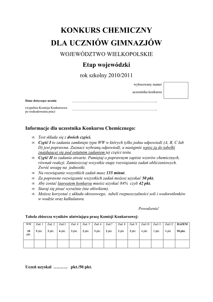 KONKURS CHEMICZNY DLA UCZNIÓW GIMNAZJÓW