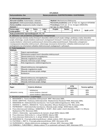 SYL ABUS Kod przedmiotu: Eee Nazwa przedmiotu: ELEKTROTECHNIKA I ELEKTRONIKA A. Informacje podstawowe Kierunek studiów: Automatyka i robotyka Wydział: Mechaniczno-Elektryczny Specjalność: Elektroautomatyka okrętowa Kierownik przedmiotu: prof. dr hab. inż. Zygmunt KITOWSKI Forma studiów: stacjonarne studia I stopnia Prowadzący: kmdr por. dr inż. Grzegorz GRZECZKA, kpt mgr inż. Adam POLAK Semestr: I Forma zajęć: Wykł. Ćwicz. Labor. Projekt Semin. ECTS: 8 Język: polski Liczba godzin : 30 12 18 Kody przedmiotów wprowadzających: Ma, Mf B. Założenia i cele przedmiotu (umiejętności i kompetencje) Student poznaje metody analizy liniowych obwodów elektrycznych prądu stałego, podstawy analizy obwodów prądu zmiennego, zasady działania wybranych analogowych liniowych i nieliniowych układów elektronicznych oraz zasady działania i właściwości podstawowych elementów półprzewodnikowych. Wykształca umiejętności rozwiązywania obwodów elektrycznych, właściwego stosowania elementów i układów elektronicznych oraz posługiwania się schematami układów elektronicznych analogowych i cyfrowych. C. Treści kształcenia Wykłady 1 1h Zajęcia wprowadzające 2 3h Elementarne pojęcia teorii obwodów elektrycznych 3 4h Obwód elektryczny nierozgałęziony 4 11 h Obwody rozgałęzione prądu 5 3h Obwody nieliniowe prądu stałego 6 8h Pole magnetyczne i elektromagnetyczne Ćwiczenia 1 2h Obwód elektryczny nierozgałęziony 2 6h Obwody rozgałęzione prądu 3 2h Obwody nieliniowe prądu stałego 4 2h Kolokwium Laboratoria 1 4h Obwód elektryczny nierozgałęziony 2 10 h Obwody elektryczne rozgałęzione 3 4h Obwody nieliniowe prądu stałego D. Forma zaliczenia próg Rygor Kryteria składowe %oceny ogólnej zaliczeniowy − kolokwium 60% 60% zaliczenie z oceną 60% 20% − ocena średnia z ćwiczeń 60% 20% − ocena średnia z laboratorium E. Literatura podstawowa i uzupełniająca 1. BOLKOWSKI S.: Teoria obwodów elektrycznych. WNT. Warszawa 2005, 2. DAVID J.GRIFFITHS.: Podstawy elektrodynamiki. Wydawnictwo Naukowe PWN, Warszawa 2005, 3. KRAKOWSKI M.: Elektrotechnika teoretyczna. Tom II pole elektromagnetyczne. PWN, 1979, 4. OSOWSKI S., SIWEK K., ŚMIAŁEK M.: Teoria obwodów. Oficyna Wydawnicza PW, Warszawa 2006, 5. PIOTROWSKI T.: Elektrotechnika teoretyczna. Obwody prądu stałego. WAM Gdynia 2004, 6. Praca zbiorowa pod redakcją J. SZABATINA i E. ŚLIWY.: Zbiór zadań z teorii obwodów. Część I i II, Oficyna Wydawnicza PW, Warszawa 2003, 7. CZAJA S.: Elektronika - wprowadzenie do ćwiczeń, skrypt AMW, Gdynia 1989 8. Praca zbiorowa: Elektronika Cz. I, skrypt WSMW, Gdynia 1980 9. Praca zbiorowa: Elektronika Cz. II, skrypt WSMW, Gdynia 1981 10. MARCINIAK W.: Przyrządy półprzewodnikowe i układy scalone, WNT, Warszawa 1987 11. PUŁTORAK J., ŚWIT A.: Przyrządy półprzewodnikowe, WNT, Warszawa 1976 12. FILIPKOWSKI A.: Układy elektroniczne analogowe i cyfrowe, WNT, Warszawa 1980 13. PIEŃKOM J., TURCZYŃSKI Z.: Układy scalone TTL w systemach cyfrowych, WNT, Warszawa 1975 14. NADACHOWSKI M.: Analogowe układy scalone, WNT, Warszawa 1991 15. ŁUBA T.: Komputerowe projektowanie układów cyfrowych w strukturach PLD, WNT, Warszawa 1993 16. WESOŁOWSKI K.: Podstawy cyfrowych systemów telekomunikacyjnych, WKŁ, 2003 17. RUSEK W, PASIERBIŃSKI J.: Elementy i układy elektroniczne w pytaniach i odpowiedziach, 2006 18. HAYKIN S.: Systemy telekomunikacyjne, cz. I i cz. II., 1998 19. Praca zbiorowa: Elektronika - wprowadzenie do ćwiczeń laboratoryjnych, 1981 20. PASIERBINSKI J.: Układy programowalne w praktyce, WNT, Warszawa 2001 21. Praca zbiorowa: Technika impulsowa, WNT, Warszawa 1973 22. TRACZYK W.: Układy cyfrowe, WNT, Warszawa 1982 23. MISIUREWICZ P.: Podstawy techniki cyfrowej, WNT, Warszawa 1982 24. KALISZ J.: Podstawy techniki cyfrowej, WNT, Warszawa 1993 25. LYONS R. G.: Wprowadzenie do cyfrowego przetwarzania sygnałów, WNT, Warszawa 2003