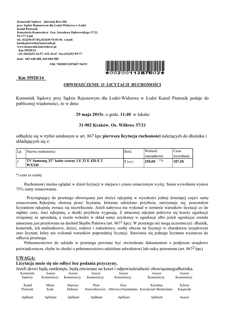 Komornik Sądowy (dawniej Rew.III) przy Sądzie Rejonowym dla Łodzi-Widzewa w Łodzi Kamil Pietrasik Kancelaria Komornicza Gen. Jarosława Dąbrowskiego 17/21, 93-177 Łódź tel. (42)256-87-84,(42)630-76-01/46 e-mail: [email protected] www.komornik.lodzwidzew.pl Km 35920/14 tel: (042)632-16-57, 632-16-67 fax:(42)292-99-77 kom: 603-448-400, 665-884-500 *0020011287602* #SK *0020011287602*/0419/ Km 35920/14 OBWIESZCZENIE O LICYTACJI RUCHOMOŚCI Komornik Sądowy przy Sądzie Rejonowym dla Łodzi-Widzewa w Łodzi Kamil Pietrasik podaje do publicznej wiadomości, że w dniu: 29 maja 2015r. o godz. 11:40 w lokalu: 31-902 Kraków, Os. Willowe 37/21 odbędzie się w trybie ustalonym w art. 867 kpc pierwsza licytacja ruchomości należących do dłużnika i składających się z: Lp. Nazwa ruchomości Ilość 1 TV Samsung 32" kolor czarny LE 32 E 420 E 2 WXXH 1 [szt.] Wartość szacunkowa 250,00 **) Cena wywołania 187,50 *) cena za sztukę Ruchomości można oglądać w dzień licytacji w miejscu i czasie oznaczonym wyżej. Suma wywołania wynosi 75% sumy oszacowania. Przystępujący do przetargu obowiązany jest złożyć rękojmię w wysokości jednej dziesiątej części sumy oszacowania. Rękojmię złożoną przez licytanta, któremu udzielono przybicia, zatrzymuje się; pozostałym licytantom rękojmię zwraca się niezwłocznie. Jeżeli nabywca nie wykonał w terminie warunków licytacji co do zapłaty ceny, traci rękojmię, a skutki przybicia wygasają. Z utraconej rękojmi pokrywa się koszty egzekucji związanej ze sprzedażą, a reszta wchodzi w skład sumy uzyskanej w egzekucji albo jeżeli egzekucja została umorzona jest przelewana na dochód Skarbu Państwa (art. 8671 kpc). W przetargu nie mogą uczestniczyć: dłużnik, komornik, ich małżonkowie, dzieci, rodzice i rodzeństwo, osoby obecne na licytacji w charakterze urzędowym oraz licytant, który nie wykonał warunków poprzedniej licytacji. Stawienie się jednego licytanta wystarcza do odbycia przetargu. Pełnomocnictwo do udziału w przetargu powinno być stwierdzone dokumentem z podpisem urzędowo poświadczonym, chyba że chodzi o pełnomocnictwo udzielone adwokatowi lub radcy prawnemu (art. 8672 kpc) UWAGA: Licytacja może się nie odbyć bez podania przyczyny. Jeżeli drzwi będą zamknięte, będą otwierane na koszt i odpowiedzialność obowiązanegodłużnika. Komornik Sądowy Asesor Komorniczy Asesor Komorniczy Kamil Pietrasik Marta Kula Mariusz Dobiesz Aplikant Aplikant Aplikant Asesor Komorniczy Asesor Komorniczy Asesor Komorniczy Piotr Ewa Karolina Nawrotkiewicz Aftowicz-Szymańska Kowalczyk-Skolasińska Aplikant Aplikant Aplikant Asesor Komorniczy Sylwia Kacprzak Asesor Komorniczy Komorniczy Komorniczy Komorniczy Komorniczy Komorniczy Komorniczy Roksana Kabuła Marta Szesteren Małgorzata Łepek Lidia Chwalewska Małgorzata Sienkiewicz-Siuda Magdalena Leszczyńska Marek Knap Adresat oryginału: dłużnik Do wiadomości: strony