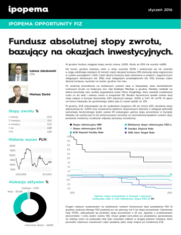 styczeń 2016 IPOPEMA OPPORTUNITY FIZ Fundusz absolutnej stopy zwrotu, bazujący na okazjach inwestycyjnych. W grudniu fundusz osiągnął stopę zwrotu równą -0,55%. Wynik za 2015 rok wyniósł +6,88%. Łukasz Jakubowski CFA Po zmiennej koniunkturze na światowych rynkach akcji w listopadzie, wielu komentatorów rynkowych liczyło na tradycyjny tzw. rajd Świętego Mikołaja w grudniu. Niestety, nadzieje na dobrą końcówkę roku zostały pogrzebane przez Mario Draghi’ego, który zawiódł oczekiwania rynku co do skali i zakresu zmian w programie QE. Bardzo dynamiczne spadki rynków akcji miały miejsce w Europie Zachodniej. DAX zakończył miesiąc -5,62%, a CAC 40 -6,47%. W ujęciu od końca listopada do grudniowego dołka były to nawet spadki ok. 10%. Mariusz Zaród W grudniu, ECB zobowiązało się do wydłużenia programu QE do marca 2017, obniżenia stopy depozytowej do -0,30% oraz rozszerzenia spektrum skupowanych aktywów o obligacje jednostek samorządu terytorialnego (patrz wykres W1 pokazujące ujemne stopy procentowe w Europie). Niestety, nie wystarczyło to do kontynuowania wzrostów na zachodnioeuropejskich rynkach akcji, ponieważ inwestorzy oczekiwali większej stymulacji monetarnej. Stopy zwrotu % 1 miesiąc Na koniec grudnia alokacja netto w akcje wyniosła 30,5% i praktycznie się nie zmieniła w ciągu ostatniego miesiąca. W ramach części akcyjnej funduszu 25% stanowiły akcje zagraniczne (z rynków europejskich i USA). Cześć dłużna funduszu była ulokowana w polskich i zagranicznych obligacjach skarbowych (ok. 35%), oraz obligacjach przedsiębiorstw (ok. 31%). Duracja części dłużnej funduszu wyniosła na koniec grudnia 1,46 roku. -0,52 3 miesiące 2,42 6 miesięcy 0,53 Stopa referencyjna NBP Efektywna stopa referencyjna FED-u 1 rok 6,88 Stopa referencyjna ECB Sweden Deposit Rate YTD 6,88 ECB Deposit Facility Rate SNB Libor Target Rate 4,5 Historia wycen PLN 4,0 3,5 12000 11000 10000 9000 8000 7000 12.05.2008 31.12.2015 00021 3,0 00011 2,5 00001 2,0 0009 1,5 0008 1,0 0007 Alokacja aktywów % opportunity fiz alokacja Gotówka - 2,72% Akcje - 30,43% 1,5 0,0 -0,5 -1,0 -1,5 2012 2015 Ujemne stopy procentowe w Europie i pierwsza podwyżka stóp w USA (efektywna stopa FED-u) W1 Drugim ważnym wydarzeniem na światowych rynkach finansowych było posiedzenie FED 16 grudnia, podczas którego FED podniósł po raz pierwszy od 11 lat stopy procentowe. Członkowie rady FOMC, zdecydowali się podnieść stopy procentowe o 25 p.b., zgodnie z oczekiwaniami ekonomistów i rynku (patrz wykres W2). Dosyć gołębi komunikat po posiedzeniu spowodował, że reakcją rynku na podwyżkę stóp było znaczące odbicie w drugiej połowie miesiąca, które pozwoliło częściowo zniwelować część spadków, jakie miały miejsce po konferencji ECB. Instrumenty dłużne - 66,85% styczeń 2016 IPOPEMA OPPORTUNITY FIZ opportunity fiz waluty EUR - 7,73% Recesje (NBER) Efektywna stopa referencyna FED-u (w %, lewa skala) Baza monetarna Total (w trl USD, prawa skala) Waluty % CHF - 0,51% 20 4,0 16 3,0 12 USD - 13,63% 2,0 8 1,0 4 0,0 0 1963 1967 1971 1975 1979 1983 1987 1991 1995 1999 2003 2007 2011 2015 Efektywna stopa procentowa FED-u po pierwszej podwyżce od 2004 roku na tle bazy monetarnej (w trl UDS) W2 PLN - 78,12% Sektory % Banki 12,40 Przemysł motoryzacyjny 10,23 Informatyka 8,43 Przemysł metalowy 7,60 W związku z końcem roku kalendarzowego, czas na podsumowanie wyników funduszu. W minionym roku fundusz osiągnął stopę zwrotu +6,88%. W związku z tym, cel funduszu, polegający na generowaniu dodatnich rocznych stóp zwrotu rzędu 5-15% w skali roku, niezależnie od warunków rynkowych, można uznać za zrealizowany. Wynik cieszy nas tym bardziej, że został on osiągnięty w bardzo niekorzystnych warunkach rynkowych. W minionym roku mieliśmy do czynienia ze spadkami na polskich i zagranicznych rynkach akcji (WIG -9,62%, MSCI All Country World Index -4,13%, MSCI World -2,59%) i surowców (Bloomberg Commodity Index -26,40%, patrz wykres W3). Rynki obligacji przyniosły z kolei niskie jednocyfrowe stopy zwrotu w Polsce, Strefie Euro i USA, oraz ujemne stopy w skali globalnej, głównie ze względu na efekty walutowe (Effas Poland All>1 +1,36%; Effas US All>1 +0,88%; Fffas Euro All>1 +1,97%, a Bloomberg Global Developed Sovereign Bond Index (USD) -2,47%, patrz wykres W4). Inne Usługi 7,23 Rynek kapitałowy 6,36 Media 6,31 Przemysł farmaceutyczny 6,12 Handel detaliczny 5,92 Ubezpieczenia 4,44 0% Finanse – Inne 4,34 Przemysł lotniczy 4,09 -6% Przemysł elektromaszynowy 3,53 Energetyka 2,52 -18% 10,49 -24% Pozostałe WIG MSCI ACWI (All Country World Index) Bloomberg Commodity Indeks IPOPEMA Opportunity MSCI World Indeks 12% 6% -12% -30% styczeń 2015 styczeń 2016 Stopy zwrotu w 2015 z różnych indeksów akcji vs Ipopema Opportunity W3 Struktura geograficzna % Benchmark obligacji EFFAS Poland > 1 Polska 75,09 Niemcy 15,64 Francja 3,36 Holandia 2,20 Szwajcaria 1,45 9% Włochy 1,14 6% USA 1,12 IPOPEMA Opportunity Effas Bond Euro Govt All > 1 Yr Tr Bloomberg Global Developed Sovereign Bond Index (USD) Effas Bond US Govt All > 1 Yr Tr 12% 3% 0% -3% -6% styczeń 2015 styczeń 2016 Stopy zwrotu w 2015 z różnych indeksów obligacji vs Ipopema Opportunity W4 Niniejszy dokument służy wyłącznie celom informacyjnym, nie stanowi rekomendacji czy doradztwa inwestycyjnego i nie może stanowić podstawy do podjęcia decyzji inwestycyjnej. Wszelkie informacje dotyczące planów, oczekiwań, strategii, czy polityki inwestycyjnej co do przyszłości, stanowią odzwierciedlenie wiedzy i oczekiwań zarządzającego na moment sporządzenia niniejszego dokumentu, w związku z czym mogą one ulec wielokrotnej zmianie w zależności od rozwoju sytuacji na rynkach finansowych. W skrajnym przypadku może to oznaczać, że oczekiwania te mogą ulec zmianie, także zanim niniejszy dokument dotrze do jego adresata. IPOPEMA Towarzystwo Funduszy Inwestycyjnych S.A., ul. Próżna 9, 00-107