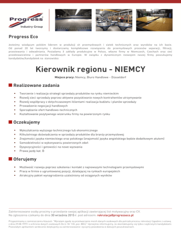 Progress Eco Jesteśmy wiodącym polskim liderem w produkcji sit przemysłowych i siatek technicznych oraz wyrobów na ich bazie. Od ponad 20 lat tworzymy i dostarczamy kompleksowe rozwiązania do przemysłowych procesów separacji, filtracji, przesiewania i odwadniania. Posiadamy 3 zakłady produkcyjne w Polsce, własne firmy w Niemczech, Czechach oraz sieć przedstawicielstw i partnerów handlowych w Europie. W związku z dynamicznym rozwojem naszej firmy poszukujemy kandydatów/kandydatek na stanowisko: Kierownik regionu - NIEMCY Miejsce pracy: Niemcy, Biuro Handlowe - Düsseldorf Realizowane zadania Tworzenie i realizacja strategii sprzedaży produktów na rynku niemieckim Rozwój sieci sprzedaży poprzez aktywne pozyskiwanie nowych kontrahentów utrzymywanie Rozwój współpracy z dotychczasowymi klientami realizacja budżetu i planów sprzedaży Prowadzenie negocjacji handlowych Sporządzanie ofert handlowo-technicznych Kształtowanie pozytywnego wizerunku firmy na powierzonym rynku Oczekujemy Wykształcenia wyższego technicznego lub ekonomicznego Kilkuletniego doświadczenia w sprzedaży produktów dla branży przemysłowej Znajomości języka niemieckiego oraz polskiego (znajomość języka angielskiego będzie dodatkowym atutem) Samodzielności w wykonywaniu powierzonych zdań Dyspozycyjności i gotowości na nowe wyzwania Prawa jazdy kat. B Oferujemy Możliwość rozwoju poprzez szkolenia i kontakt z najnowszymi technologiami przemysłowymi Pracę w firmie o ugruntowanej pozycji, działającej na rynkach europejskich Atrakcyjny pakiet wynagrodzenia uzależniony od osiąganych wyników Zainteresowane osoby prosimy o przesłanie swojej aplikacji zawierającej list motywacyjny oraz CV. Na zgłoszenia czekamy do dnia 30 września 2015 r. pod adresem: [email protected] Przypominamy o zamieszczeniu klauzuli: "Wyrażam zgodę na przetwarzanie moich danych osobowych dla potrzeb procesu rekrutacji (zgodnie z ustawą z dnia 29.08.1997r o ochronie danych osobowych Dz.U. Nr 133, poz. 883;)” Uprzejmie informujemy, że skontaktujemy się tylko z wybranymi kandydatami. Pozostałym aplikantom serdecznie dziękujemy za zainteresowanie i życzymy powodzenia w dalszych poszukiwaniach.