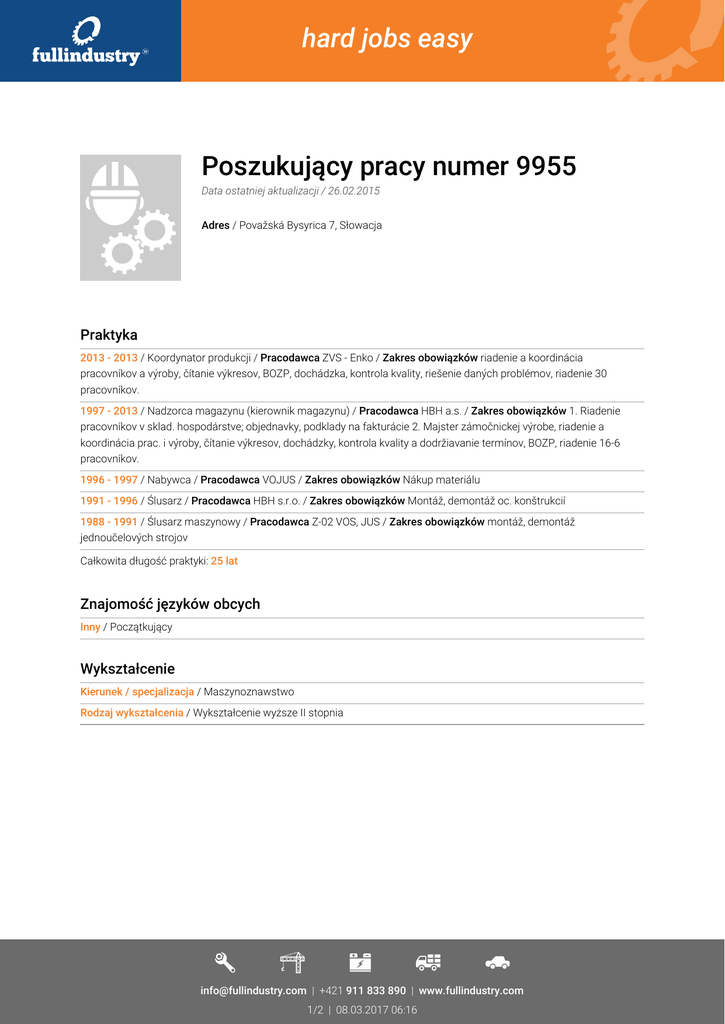 hard jobs easy Poszukujący pracy numer 9955 Data ostatniej aktualizacji / 26.02.2015 Adres / Považská Bysyrica 7, Słowacja Praktyka 2013 - 2013 / Koordynator produkcji / Pracodawca ZVS - Enko / Zakres obowiązków riadenie a koordinácia pracovníkov a výroby, čítanie výkresov, BOZP, dochádzka, kontrola kvality, riešenie daných problémov, riadenie 30 pracovníkov. 1997 - 2013 / Nadzorca magazynu (kierownik magazynu) / Pracodawca HBH a.s. / Zakres obowiązków 1. Riadenie pracovníkov v sklad. hospodárstve; objednavky, podklady na fakturácie 2. Majster zámočnickej výrobe, riadenie a koordinácia prac. i výroby, čítanie výkresov, dochádzky, kontrola kvality a dodržiavanie termínov, BOZP, riadenie 16-6 pracovníkov. 1996 - 1997 / Nabywca / Pracodawca VOJUS / Zakres obowiązków Nákup materiálu 1991 - 1996 / Ślusarz / Pracodawca HBH s.r.o. / Zakres obowiązków Montáž, demontáž oc. konštrukcií 1988 - 1991 / Ślusarz maszynowy / Pracodawca Z-02 VOS, JUS / Zakres obowiązków montáž, demontáž jednoučelových strojov Całkowita długość praktyki: 25 lat Znajomość języków obcych Inny / Początkujący Wykształcenie Kierunek / specjalizacja / Maszynoznawstwo Rodzaj wykształcenia / Wykształcenie wyższe II stopnia [email protected] | +421 911 833 890 | www.fullindustry.com 1/2 | 08.03.2017 06:16 hard jobs easy Zainteresowany w pozycji roboczej Przemysł maszynowy / Technolog spawalnictwa Przemysł motoryzacyjny / Majster warsztatu mechanicznego Przemysł maszynowy / Dyrektor techniczny Logistyka / Kontroler w logistyce i transporcie Logistyka / Nadzorca magazynu (kierownik magazynu) Logistyka / Pracownik administracyjny w transporcie drogowym Przemysł motoryzacyjny / Technolog Przemysł maszynowy / Kierownik zakładu Przemysł maszynowy / Technolog spawania tworzyw sztucznych Logistyka / Kierownik (menedżer) w transporcie drogowym (oprócz miejskiego transportu zbiorowego) Przemysł motoryzacyjny / Inżynier ds. konserwacji Logistyka / Specjalista techniczny w transporcie kolejowym Elektrotechnika / Menedżer projektu w dziedzinie elektrotechniki Przemysł motoryzacyjny / Inżynier procesowy Przemysł maszynowy / Inspektor jakości Logistyka / Pracownik administracyjny w miejskim transporcie zbiorowym Logistyka / Inżynier ds. konserwacji Przemysł maszynowy / Specjalista spawacz Logistyka / Kierownik ds. zakupów Przemysł maszynowy / Koordynator dostaw i usług Logistyka / Pracownik administracyjny w transporcie kolejowym Logistyka / Pracownik ds. planowania handlowego i zakupów Logistyka / Menedżer projektu w transporcie Logistyka / Dyspozytor, dyżurny ruchu w transporcie kolejowym Przemysł maszynowy / Technik maszyn Logistyka / Koordynator Przemysł maszynowy / Kierownik ds. konserwacji Przemysł motoryzacyjny / Majster warsztatu blacharskiego Przemysł maszynowy / Inżynier spawalnictwa Logistyka / Dyspozytor transportu drogowego osób (oprócz miejskiego transportu zbiorowego) Przemysł maszynowy / Kierownik produkcji Przemysł maszynowy / Asystent kierownika projektu Logistyka / Menedżer parku samochodowego Logistyka / Nabywca Logistyka / Kierownik transportu Logistyka / Dyrektor logistyki Przemysł motoryzacyjny / Kontroler jakości Przemysł maszynowy / Inżynier maszyn Przemysł maszynowy / Koordynator produkcji Przemysł maszynowy / Planista produkcji Przemysł maszynowy / Kierownik serwisu Logistyka / Dyspozytor [email protected] | +421 911 833 890 | www.fullindustry.com 2/2 | 08.03.2017 06:16