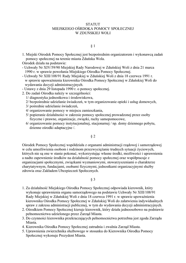 STATUT MIEJSKEIGO OŚRDOKA POMOCY SPOŁECZNEJ W ZDUŃSKIEJ WOLI §1 1. Miejski Ośrodek Pomocy Społecznej jest bezpośrednim organizatorem i wykonawcą zadań pomocy społecznej na terenie miasta Zduńska Wola. Ośrodek działa na podstawie: - Uchwały Nr XIV/59/90 Miejskiej Rady Narodowej w Zduńskiej Woli z dnia 21 marca 1990 r. w sprawie powołania Miejskiego Ośrodka Pomocy Społecznej. - Uchwały Nr XIII/108/91 Rady Miejskiej w Zduńskiej Woli z dnia 18 czerwca 1991 r. w sprawie upoważnienia kierownika Ośrodka Pomocy Społecznej w Zduńskiej Woli do wydawania decyzji administracyjnych. - Ustawy z dnia 29 listopada 1990 r. o pomocy społecznej. 2. Do zadań Ośrodka należy w szczególności: 1/ diagnostyka jednostkowa i środowiskowa, 2/ bezpośrednie udzielanie świadczeń, w tym organizowanie opieki i usług domowych, 3/ pośrednie udzielanie świadczeń, 4/ organizowanie pomocy w miejscu zamieszkania, 5/ popieranie działalności w zakresie pomocy społecznej prowadzonej przez osoby fizyczne i prawne, organizacje, związki, ruchy samopomocowe, 6/ organizowanie pomocy instytucjonalnej, stacjonarnej / np. domy dziennego pobytu, dzienne ośrodki adaptacyjne /. §2 Ośrodek Pomocy Społecznej współdziała z organami administracji rządowej i samorządowej w celu umożliwienia osobom i rodzinom przezwyciężanie trudnych sytuacji życiowych, których nie są one w stanie pokonać, wykorzystując własne środki, możliwości i uprawnienia a nadto zapewnienie środków na działalność pomocy społecznej oraz współpracuje z organizacjami społecznymi, związkami wyznaniowymi, stowarzyszeniami o charakterze charytatywnym, fundacjami, osobami fizycznymi, jednostkami organizacyjnymi służby zdrowia oraz Zakładem Ubezpieczeń Społecznych. §3 1. Za działalność Miejskiego Ośrodka Pomocy Społecznej odpowiada kierownik, który wykonuje uprawnienia organu samorządowego na podstawie Uchwały Nr XIII/108/91 Rady Miejskiej w Zduńskiej Woli z dnia 18 czerwca 1991 r. w sprawie upoważnienia kierownika Ośrodka Pomocy Społecznej w Zduńskiej Woli do załatwienia indywidualnych spraw z zakresu administracji publicznej, w tym do wydawania decyzji administracyjnych. 2. Ośrodkiem Pomocy Społecznej kieruje kierownik, który działa jednoosobowo na podstawie pełnomocnictwa udzielonego przez Zarząd Miasta. 3. Do czynności kierownika przekraczających pełnomocnictwa potrzebna jest zgoda Zarządu Miasta. 4. Kierownika Ośrodka Pomocy Społecznej zatrudnia i zwalnia Zarząd Miasta. 5. Uprawnienia zwierzchnika służbowego w stosunku do Kierownika Ośrodka Pomocy Społecznej wykonuje Prezydent Miasta. §4 1. W skład Miejskiego Ośrodka Pomocy Społecznej wchodzą: 1/ Dział Pomocy Środowiskowej - starsi pracownicy socjalni, - pracownicy socjalni, - aspiranci socjalni. 2/ Dział Świadczeń i Usług 3/ Dział finansowo – księgowy 4/ Konsultanci specjalistyczni 2. Szczegółowe zadania dla poszczególnych działów i stanowisk pracy określonych w ust. 1 ustalają regulaminy i zakresy czynności. §5 Placówki opieki instytucjonalnej/półstacjonarnej lub stacjonarnej o lokalnym zasięgu/działają na podstawie regulaminów zatwierdzonych przez kierownika Ośrodka. §6 Prawa i obowiązki pracowników socjalnych zatrudnionych w Ośrodku Pomocy Społecznej regulują przepisy o pracownikach samorządowych, zaś pozostałych pracowników – przepisy z zakresu prawa pracy powszechnie obowiązującego. §7 1. Ośrodek Pomocy Społecznej jest wyodrębnioną jednostką budżetową Miasta. 2. Podstawą gospodarki finansowej Ośrodka Pomocy Społecznej jest roczny plan rzeczowo – finansowo sporządzony w oparciu o dotacje na realizacje zadań zleconych oraz własnych Miasta. §8 1. Statut Ośrodkowi Pomocy Społecznej nadaje Rada Miejska. 2. Zmiany statutu mogą być dokonywane w trybie właściwym dla jego ustaleniu.