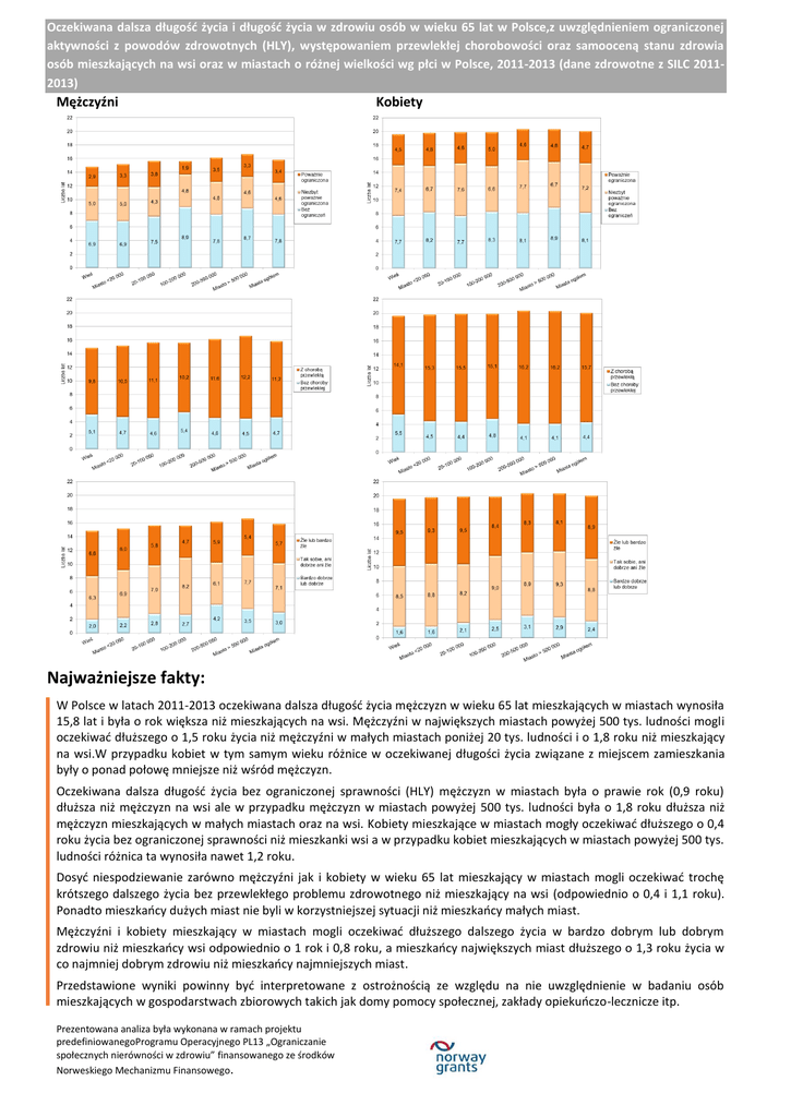 Oczekiwana dalsza długość życia i długość życia w zdrowiu osób w wieku 65 lat w Polsce,z uwzględnieniem ograniczonej aktywności z powodów zdrowotnych (HLY), występowaniem przewlekłej chorobowości oraz samooceną stanu zdrowia osób mieszkających na wsi oraz w miastach o różnej wielkości wg płci w Polsce, 2011-2013 (dane zdrowotne z SILC 20112013) Mężczyźni Kobiety Najważniejsze fakty: W Polsce w latach 2011-2013 oczekiwana dalsza długość życia mężczyzn w wieku 65 lat mieszkających w miastach wynosiła 15,8 lat i była o rok większa niż mieszkających na wsi. Mężczyźni w największych miastach powyżej 500 tys. ludności mogli oczekiwać dłuższego o 1,5 roku życia niż mężczyźni w małych miastach poniżej 20 tys. ludności i o 1,8 roku niż mieszkający na wsi.W przypadku kobiet w tym samym wieku różnice w oczekiwanej długości życia związane z miejscem zamieszkania były o ponad połowę mniejsze niż wśród mężczyzn. Oczekiwana dalsza długość życia bez ograniczonej sprawności (HLY) mężczyzn w miastach była o prawie rok (0,9 roku) dłuższa niż mężczyzn na wsi ale w przypadku mężczyzn w miastach powyżej 500 tys. ludności była o 1,8 roku dłuższa niż mężczyzn mieszkających w małych miastach oraz na wsi. Kobiety mieszkające w miastach mogły oczekiwać dłuższego o 0,4 roku życia bez ograniczonej sprawności niż mieszkanki wsi a w przypadku kobiet mieszkających w miastach powyżej 500 tys. ludności różnica ta wynosiła nawet 1,2 roku. Dosyć niespodziewanie zarówno mężczyźni jak i kobiety w wieku 65 lat mieszkający w miastach mogli oczekiwać trochę krótszego dalszego życia bez przewlekłego problemu zdrowotnego niż mieszkający na wsi (odpowiednio o 0,4 i 1,1 roku). Ponadto mieszkańcy dużych miast nie byli w korzystniejszej sytuacji niż mieszkańcy małych miast. Mężczyźni i kobiety mieszkający w miastach mogli oczekiwać dłuższego dalszego życia w bardzo dobrym lub dobrym zdrowiu niż mieszkańcy wsi odpowiednio o 1 rok i 0,8 roku, a mieszkańcy największych miast dłuższego o 1,3 roku życia w co najmniej dobrym zdrowiu niż mieszkańcy najmniejszych miast. Przedstawione wyniki powinny być interpretowane z ostrożnością ze względu na nie uwzględnienie w badaniu osób mieszkających w gospodarstwach zbiorowych takich jak domy pomocy społecznej, zakłady opiekuńczo-lecznicze itp. Prezentowana analiza była wykonana w ramach projektu predefiniowanegoProgramu Operacyjnego PL13 „Ograniczanie społecznych nierówności w zdrowiu” finansowanego ze środków Norweskiego Mechanizmu Finansowego.