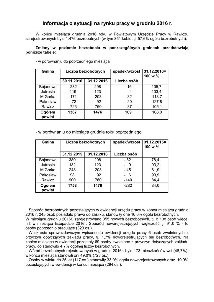 Informacja o sytuacji na rynku pracy w grudniu 2016 r. W końcu miesiąca grudnia 2016 roku w Powiatowym Urzędzie Pracy w Rawiczu zarejestrowanych było 1.476 bezrobotnych (w tym 851 kobiet tj. 57,6% ogółu bezrobotnych). Zmiany w poziomie bezrobocia w poszczególnych gminach przedstawiają poniższe tabele: - w porównaniu do poprzedniego miesiąca Gmina Bojanowo Jutrosin M.Górka Pakosław Rawicz Ogółem powiat Liczba bezrobotnych 30.11.2016 282 119 171 72 723 1367 31.12.2016 298 123 203 92 760 1476 spadek/wzrost 31.12.2016= 100 w % Liczba osób 16 105,7 4 103,4 32 118,7 20 127,8 37 105,1 109 108,0 - w porównaniu do miesiąca grudnia roku poprzedniego Gmina Bojanowo Jutrosin M.Górka Pakosław Rawicz Ogółem powiat Liczba bezrobotnych 31.12.2015 380 132 248 98 900 1758 31.12.2016 298 123 203 92 760 1476 spadek/wzrost 31.12.2015= 100 w % Liczba osób - 82 - 9 - 45 - 6 -140 -282 78,4 93,2 81,9 93,9 84,4 84,0 Spośród bezrobotnych pozostających w ewidencji urzędu pracy w końcu miesiąca grudnia 2016 r. 245 osób posiadało prawo do zasiłku, stanowiły one 16,6% ogółu bezrobotnych. W miesiącu grudniu 2016r. zarejestrowano 355 nowych bezrobotnych, tj. o 108 osób więcej niż w miesiącu listopadzie 2016r. Spośród noworejestrujących większość tj. 91,0 % - to osoby poprzednio pracujące (323 os.). W okresie sprawozdawczym wpisano do ewidencji urzędu pracy 6 osób zwolnionych z przyczyn dotyczących zakładu pracy, tj. 1,7% noworejestrujących się bezrobotnych. Na koniec miesiąca w ewidencji pozostały 69 osoby zwolnione z przyczyn dotyczących zakładu pracy, co stanowiło 4,7% ogólnej liczby bezrobotnych. Wśród bezrobotnych rejestrowanych w grudniu 2016r. było 173 mieszkańców wsi (48,7%), w końcu miesiąca stanowili oni 49,0% (723 os.). Osoby w wieku do 25 lat (117 os.) stanowiły 33,0% ogółu noworejestrowanych oraz 19,9% pozostających w ewidencji w końcu miesiąca (294 os.). Rejestracje bezrobotnych w miesiącu grudniu 2016 roku Wyszczególnienie Ogółem Gminy Bojanowo Jutrosin Miejska Pakosław Rawicz Górka Bezrobotni rejestrowani ogółem 355 53 25 63 31 183 W tym: Kobiety 203 24 16 32 19 112 Udział w rejestracjach og. w % 57,2 45,3 64,0 42,1 61,3 61,2 bezrobotni z prawem do zasiłku 61 9 5 8 8 31 Udział w rejestracjach og. w % 17,2 17,0 20,0 12,7 25,8 16,9 poprzednio pracujący 323 50 21 57 29 166 Udział w rejestracjach og. w % 91,0 94,3 84,0 90,5 93,5 90,7 Zwolnieni z przyczyn dot z-du pracy 6 1 1 1 0 3 Udział w rejestracjach og. w % 1,7 1,9 4,0 1,6 0 1,6 zamieszkali na wsi 173 32 16 34 31 60 Udział w rejestracjach og. w % 48,7 60,4 64,0 54,0 100 32,8 W grudniu 2016 r. w Powiatowym Urzędzie Pracy w Rawiczu zgłoszono 190 ofert pracy o 22 więcej niż w poprzednim miesiącu. Na koniec bieżącego miesiąca pozostały do wykorzystania 82 oferty. Na jedną ofertę pracy przypadało średnio 8 bezrobotnych. Z ewidencji Powiatowego Urzędu Pracy wyłączono w miesiącu sprawozdawczym 246 bezrobotnych to jest o 42 osoby mniej niż w miesiącu listopadzie 2016 r. W miesiącu sprawozdawczym pracę podjęło 175 osób, w tym pracę niesubsydiowaną 128 osób, w ramach prac interwencyjnych oraz robót publicznych skierowano 1 osobę bezrobotną. Szkolenie podjęło 8 osób a na staż skierowano 1 osobę bezrobotną. Powiatowy Urząd Pracy w Rawiczu w miesiącu grudniu br. udzielił 23 dotacji na podjęcie następujących działalności gospodarczych: usługi noclegowe 1 os., usługi fotograficzne i filmowe 2 os., usługi budowlane 4 os., usługi dekarsko-ciesielskie 2 os., usługi fryzjerskie 3 os., mechanika pojazdowa 1 os., usługi rachunkowo-księgowe 1 os., usługi kosmetyczne 1 os., handel 1 os., usługi opiekuńczo-medyczne 1 os., usługi doradcze w zakresie zarządzania zasobami ludzkimi 1 os., psi salon 1 os., naprawa i konserwacja urządzeń elektrycznych 1 os., usługi ślusarskie 1 os., usługi sprzątające 1 os. oraz instalacje wodnokanalizacyjne, c.o. 1 os. na łączną kwotę: 305.490,00zł. Tutejszy Urząd zawarł również 1 umowę na sfinansowanie 1 stanowiska pracy dla osób bezrobotnych w ramach refundacji poniesionych kosztów wyposażenia i doposażenia stanowisk pracy na kwotę 13.300,00zł. Bezrobotni wyłączeni z ewidencji w grudniu 2016 roku Wyszczególnienie Wyłączenia w tym z powodu: podjęcia pracy Udział w wyłączeniach og. w % podjęcia pracy niesubsydiowanej Udział w podjęciach pracy og. w % podjęcia prac interwencyjnych Udział w podjęciach pracy og. w % podjęcia robót publicznych Udział w podjęciach pracy og. w % skierowania na staż lub szkol. Udział w wyłączeniach og. w % nie potwierdzania got. do pracy Udział w wyłączeniach og. w % Ogółem Bojanowo Jutrosin 246 37 21 175 71,1 128 73,1 1 0,6 0 0 9 3,7 35 14,2 20 54,1 16 80,0 0 0 0 0 1 2,7 10 27,0 16 76,2 9 56,2 0 0 0 0 1 4,8 3 14,3 Gminy Miejska Pakosław Rawicz Górka 31 11 146 21 67,7 15 71,4 0 0 0 0 3 9,7 4 12,9 9 81,8 5 55,6 0 0 0 0 0 0 1 9,1 109 74,7 83 76,1 1 0,9 0 0 4 3,7 17 15,6 Wybrane kategorie bezrobotnych zarejestrowanych w Powiatowym Urzędzie Pracy według stanu na dzień 31.12.2016r. Ogółem Wybrane kategorie bezrobotnych Wyszczególnienie Kobiety Udział w ogólnej liczbie bezrob. w % Zasiłkobiorcy Udział w ogólnej liczbie bezrob. W % Zwolnieni z przyczyn dot. zakł. pracy Udział w ogólnej liczbie bezrob. w % Zamieszkali na wsi Udział w ogólnej liczbie bezrob. w % Osoby do 25 roku życia Udział w ogólnej liczbie bezrob. w % Bezrobotni z wykszt. gimn. i poniżej Udział w ogólnej liczbie bezrob. w % Bojanowo Jutrosin w tym pow. 24 miesięcy 851 57,6 245 16,6 69 4,7 723 49,0 294 19,9 371 25,1 457 274 163 54,7 42 14,1 15 5,0 212 71,1 48 16,1 110 36,9 121 75 74 60,2 25 20,3 6 4,9 95 77,2 36 29,3 14 11,4 30 20 Udział w ogólnej liczbie bezrob. w % 31,0 40,6 24,4 Długotrwale bezrobotni (pow. 12 m-cy) Gminy Miejska Pakosław Rawicz Górka 117 56 441 57,6 60,9 58,0 35 19 124 17,2 20,7 16,3 9 6 33 4,4 6,5 4,3 120 92 204 59,1 100 2
