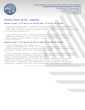Instytut Meteorologii i Gospodarki Wodnej - Państwowy Instytut Badawczy Centralne Biuro Prognoz Meteorologicznych w Krakowie 30-215 Kraków ul. Piotra Borowego 14 tel: 12-6398150, fax: 12-4251973 email: [email protected] www: www.imgw.pl PROGNOZA POGODY DLA WOJ. ŚLĄSKIEGO ważność od godz. 07:30 dnia 21.02.2013 do godz. 07:30 dnia 22.02.2013 W dzień zachmurzenie duże z większymi przejaśnieniami. Przelotne opady śniegu. Temperatura maksymalna od -3°C do -1°C, na szczytach Beskidów od -10°C do -7°C. Wiatr słaby, północny i północno-wschodni. Wysoko w górach wiatr słaby i umiarkowany, z kierunków zmieniających się. W nocy zachmurzenie duże z większymi przejaśnieniami. Miejscami opady śniegu. Temperatura minimalna od -7°C do -5°C, na szczytach Beskidów od -12°C do -8°C. Wiatr słaby, północno-wschodni. Wysoko w górach wiatr umiarkowany, wschodni i północno-wschodni. ważność od godz. 07:30 dnia 22.02.2013 do godz. 07:30 dnia 23.02.2013 W dzień zachmurzenie duże. Opady śniegu. Temperatura maksymalna od -2°C do 0°C, na szczytach Beskidów od -8°C do -5°C. Wiatr umiarkowany, okresami porywisty, północno-wschodni. Wysoko w górach wiatr umiarkowany, okresami dość silny, z kierunków wschodnich. W nocy zachmurzenie całkowite. Opady śniegu, okresami o natężeniu umiarkowanym, od południowego wschodu przechodzące miejscami w opady deszczu ze śniegiem i deszczu, lokalnie marznącego deszczu, powodującego gołoledź. Temperatura minimalna od -4°C do -2°C, na szczytach Beskidów od -9°C do -6°C. Temperatura minimalna w pierwszej części nocy, później stopniowe ocieplenie. Wiatr słaby i umiarkowany, północno-wschodni i wschodni. Wysoko w górach wiatr umiarkowany, okresami dość silny, południowo-wschodni skręcający na południowy. prognozę 6036/2013 opracował synoptyk dyżurny Grzegorz Baca, dnia 2013-02-21 05:44