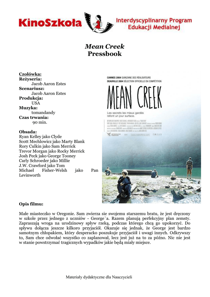 Mean Creek Pressbook Czołówka: Reżyseria: Jacob Aaron Estes Scenariusz: Jacob Aaron Estes Produkcja: USA Muzyka: tomandandy Czas trwania: 90 min. Obsada: Ryan Kelley jako Clyde Scott Mechlowicz jako Marty Blank Rory Culkin jako Sam Merrick Trevor Morgan jako Rocky Merrick Josh Peck jako George Tooney Carly Schroeder jako Millie J.W. Crawford jako Tom Michael Fisher-Welsh jako Levinworth Pan Opis filmu: Małe miasteczko w Oregonie. Sam zwierza sie swojemu starszemu bratu, że jest dręczony w szkole przez jednego z uczniów - George`a. Razem planują perfekcyjny plan zemsty. Zapraszają wroga na urodzinowy spływ rzeką, podczas którego chcą go upokorzyć. Do spływu dołącza jeszcze kilkoro przyjaciół. Okazuje się jednak, że George jest bardzo samotnym chłopakiem, który desperacko poszukuje przyjaciół i uwagi innych. Odkrywszy to, Sam chce odwołać wszystko co zaplanował, lecz jest już na to za późno. Nic nie jest w stanie powstrzymać tragicznych wypadków jakie będą miały miejsce. Materiały dydaktyczne dla Nauczycieli O PRODUKCJI: Mean Creek tłumaczone swobodnie to „zła woda”. Tak jak niespodziewany nurt rzeki potrafi przynieść zgubę nawet wprawnemu pływakowi, tak – właśnie w trakcie spływu miejscową rzeką – Marty’emu, Clyde’owi, Millie oraz braciom Samowi i Rocky’emu spod kontroli wymyka się misterny plan skompromitowania ich kolegi George’a. Plan, ukuty, by mu dać nauczkę, podjęty w odwecie za znęcanie się przez niego nad słabszym Samem, niespodziewanie kończy się utonięciem George’a. To opowieść o przemocy – jej źródłach i pożywkach, na których rośnie; film o ciężkim ładunku treści i emocji, ale dający szansę przyjrzenia się relacjom między prześladowcą i ofiarą, a na końcu – również wytyczający kierunek odkupienia winy. Ten drugi temat jest godzien samego Raskolnikowa. Film jest gęstym emocjonalnie pociskiem. Strzelba zawieszona w pierwszej scenie (bójka George’a i Sama) wystrzela po godzinie (kłótnia na łodzi – George wypada za burtę). Ale widząc, jak iskra zapala lont – jak ofiara, by się ratować, sama wchodzi w rolę opresora, jak przemocą odpowiada na przemoc, jak narasta napięcie między przyjaciółmi – być może widzowie dostrzegą powszechny sens odbezpieczania broni: powtarzania za Millie „stop” i szukania dojrzałych rozwiązań. Szczególnie po przedyskutowaniu filmu, ocenieniu działania postaci, próbie zrozumienia natury przemocy. Zwłaszcza że twórcy rozmawiają z nimi poważnie, poruszają temat, który jest w ich życiu obecny, pokazują konsekwencje tragedii (dramat matki, taśma filmowa George’a, kwestia winy). RECENZJA: autor: Tarantinka19 22 lutego 2010 Czasami cisza jest bardziej wymowna niż krzyk "Mean Creek" prezentowany był na dwóch prestiżowych festiwalach, Sundance i w Cannes, jednakże na żadnym z nich nie oszołomił widzów. A szkoda, bo nie często trafia się równie poruszający i bezpretensjonalny dramat o młodzieży i dla młodzieży. Film Estesa nie odkrywa niczego nowego, ale opowiada w sposób ciekawy na znane już tematy. Sam (bardziej utalentowany z Culkinów - Rory) jest typowym szkolnym outsiderem. Nie byłoby może w tym nic złego, gdyby nie fakt, że stanowi też worek treningowy dla szkolnego osiłka George'a. W końcu młody zwierza się swojemu starszemu bratu, że skąd pochodzą jego siniaki. Wtedy brat, razem z kolegami, postanawia zemścić się na dręczycielu. O czym więc jest "Mean Creek"? O złej młodzieży?, o głupocie?, o tym, że nie warto się mścić? Nie. "Mean Creek" jest o tym, że każdy z nas "pod powierzchnią, ma swe tajemnice" i śladami Gombrowiczowskiej teorii formy, przyprawia sobie samemu gębę. Mimo że sądzimy, iż dobrze znamy każdego z bohaterów, potrafią nas oni zaskoczyć. George w gruncie rzeczy nie różni się wiele od nieśmiałego Sama, tylko że w przeciwieństwie do niego, o swoje miejsce w szeregu walczy pięścią. Zaś Sam, mimo że jest ofiarą, irytuje biernością w obliczu tragedii, a Marty - syn ojca samobójcy, kreuje się na silnego i niezależnego, ale sam zmierza do autodestrukcji. W końcu trudno określić, kto tu jest prawdziwą ofiarą. "Mean Creek" byłby jednak niczym bez znakomitych aktorów. Estes wykazał się niezwykłą intuicją, obsadzając w głównych rolach znanych już w świecie filmu, ale nieopatrzonych Materiały dydaktyczne dla Nauczycieli aktorów. I tak Marty'ego zagrał Scott Mechlowicz (Scotty "co nie wie" z "Eurotrip"), Rocky'ego, znany chociażby z "Komedia patriotyczna (1992)Komedia patriotyczna (1992)Patrioty" Trevor Morgan, a Sama Rory Culkin. Średnia wieku całej obsady mogłaby się wahać gdzieś w okolicach 20 lat, ale jak widać czasami to prawdziwy talent, a nie doświadczenie się liczy. Aktorzy dali temu filmowi cząstkę swojej młodzieńczej wiary, energii i pasji życia. Sprostali psychologii filmu, który dzięki ich naturalności nie ociera się o banał. Uroku całej tej, w gruncie rzeczy, smutnej historii dodają plenery. Rzecz dzieje się na pięknej, otoczonej przez lasy rzece, gdzie diabeł zdaje się mówić dobranoc. Miejsce zostało niesamowicie sfilmowane przez [person=123076]Sharon Meir[/person]. Operatorka pracując z niezwykłym pietyzmem, wydobyła z dzikiej przyrody to co najpiękniejsze. Senny klimat filmu potęgują jednak nie tylko widoki i falowanie wody, ale i muzyka autorstwa dwóch kompozytorów: Andy'ego Milburna i Toma Hajdu, pracujących pod pseudonimem - tomandandy. Panowie, znani z bardzo nietuzinkowych soundtracków (jak np. ten do "Żyć szybko umierać młodo") również i tu stanęli na wysokości zadania. Ich ścieżka z "Mean Creek" to niezwykle relaksująca, eteryczne muzyka, którą można się cieszyć również poza seansem. Pozwala odpłynąć na falach "Mean Creek", daleko od zwykłych problemów. Idąc za znanym kiedyś duetem, zakończę krótkim "Enjoy the silence"! http://