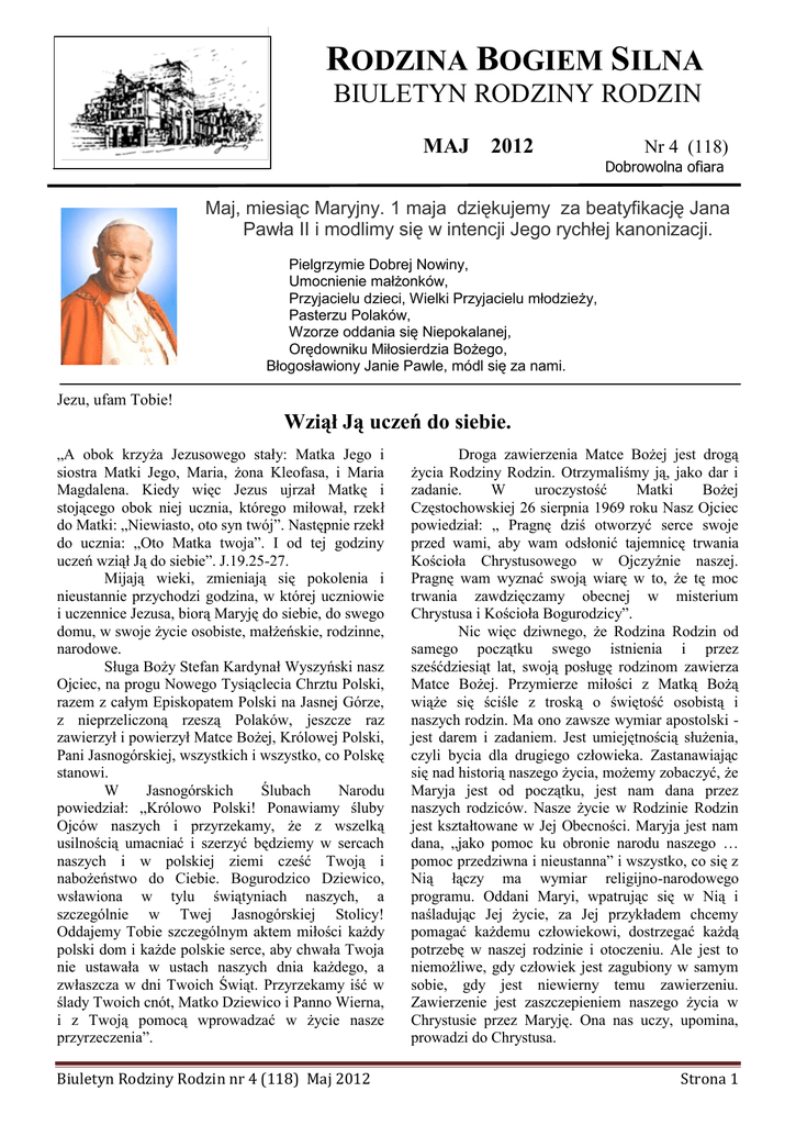 RODZINA BOGIEM SILNA BIULETYN RODZINY RODZIN MAJ 2012 Nr 4 (118) Dobrowolna ofiara Maj, miesiąc Maryjny. 1 maja dziękujemy za beatyfikację Jana Pawła II i modlimy się w intencji Jego rychłej kanonizacji. Pielgrzymie Dobrej Nowiny, Umocnienie małżonków, Przyjacielu dzieci, Wielki Przyjacielu młodzieży, Pasterzu Polaków, Wzorze oddania się Niepokalanej, Orędowniku Miłosierdzia Bożego, Błogosławiony Janie Pawle, módl się za nami. Jezu, ufam Tobie! Wziął Ją uczeń do siebie. „A obok krzyża Jezusowego stały: Matka Jego i siostra Matki Jego, Maria, żona Kleofasa, i Maria Magdalena. Kiedy więc Jezus ujrzał Matkę i stojącego obok niej ucznia, którego miłował, rzekł do Matki: „Niewiasto, oto syn twój”. Następnie rzekł do ucznia: „Oto Matka twoja”. I od tej godziny uczeń wziął Ją do siebie”. J.19.25-27. Mijają wieki, zmieniają się pokolenia i nieustannie przychodzi godzina, w której uczniowie i uczennice Jezusa, biorą Maryję do siebie, do swego domu, w swoje życie osobiste, małżeńskie, rodzinne, narodowe. Sługa Boży Stefan Kardynał Wyszyński nasz Ojciec, na progu Nowego Tysiąclecia Chrztu Polski, razem z całym Episkopatem Polski na Jasnej Górze, z nieprzeliczoną rzeszą Polaków, jeszcze raz zawierzył i powierzył Matce Bożej, Królowej Polski, Pani Jasnogórskiej, wszystkich i wszystko, co Polskę stanowi. W Jasnogórskich Ślubach Narodu powiedział: „Królowo Polski! Ponawiamy śluby Ojców naszych i przyrzekamy, że z wszelką usilnością umacniać i szerzyć będziemy w sercach naszych i w polskiej ziemi cześć Twoją i nabożeństwo do Ciebie. Bogurodzico Dziewico, wsławiona w tylu świątyniach naszych, a szczególnie w Twej Jasnogórskiej Stolicy! Oddajemy Tobie szczególnym aktem miłości każdy polski dom i każde polskie serce, aby chwała Twoja nie ustawała w ustach naszych dnia każdego, a zwłaszcza w dni Twoich Świąt. Przyrzekamy iść w ślady Twoich cnót, Matko Dziewico i Panno Wierna, i z Twoją pomocą wprowadzać w życie nasze przyrzeczenia”. Biuletyn Rodziny Rodzin nr 4 (118) Maj 2012 Droga zawierzenia Matce Bożej jest drogą życia Rodziny Rodzin. Otrzymaliśmy ją, jako dar i zadanie. W uroczystość Matki Bożej Częstochowskiej 26 sierpnia 1969 roku Nasz Ojciec powiedział: „ Pragnę dziś otworzyć serce swoje przed wami, aby wam odsłonić tajemnicę trwania Kościoła Chrystusowego w Ojczyźnie naszej. Pragnę wam wyznać swoją wiarę w to, że tę moc trwania zawdzięczamy obecnej w misterium Chrystusa i Kościoła Bogurodzicy”. Nic więc dziwnego, że Rodzina Rodzin od samego początku swego istnienia i przez sześćdziesiąt lat, swoją posługę rodzinom zawierza Matce Bożej. Przymierze miłości z Matką Bożą wiąże się ściśle z troską o świętość osobistą i naszych rodzin. Ma ono zawsze wymiar apostolski jest darem i zadaniem. Jest umiejętnością służenia, czyli bycia dla drugiego człowieka. Zastanawiając się nad historią naszego życia, możemy zobaczyć, że Maryja jest od początku, jest nam dana przez naszych rodziców. Nasze życie w Rodzinie Rodzin jest kształtowane w Jej Obecności. Maryja jest nam dana, „jako pomoc ku obronie narodu naszego … pomoc przedziwna i nieustanna” i wszystko, co się z Nią łączy ma wymiar religijno-narodowego programu. Oddani Maryi, wpatrując się w Nią i naśladując Jej życie, za Jej przykładem chcemy pomagać każdemu człowiekowi, dostrzegać każdą potrzebę w naszej rodzinie i otoczeniu. Ale jest to niemożliwe, gdy człowiek jest zagubiony w samym sobie, gdy jest niewierny temu zawierzeniu. Zawierzenie jest zaszczepieniem naszego życia w Chrystusie przez Maryję. Ona nas uczy, upomina, prowadzi do Chrystusa. Strona 1 Jak w Kanie Galilejskiej powiedziała do sług, tak i dzisiaj mówi do nas: „ Zróbcie wszystko, cokolwiek wam powie” J.2.5. Tak, jak Maryja czujna i współczująca widzi potrzeby ludzkie, tak samo człowiek Jej oddany staje się wrażliwy i stara się całym sercem spieszyć innym z pomocą, szczególnie domownikom wspólnej wiary. W Maryi dobroć Boża przybliżyła się i wciąż znacznie przybliża się do nas. Staje Ona przed nami jak Znak pocieszenia, otuchy, nadziei. Zwraca się do nas słowami: „Miej odwagę podjąć ryzyko z Bogiem! Spróbuj! Nie lękaj się Chrystusa. Miej odwagę podjąć ryzyko dobroci. Opowiedz się całym sercem za Bogiem, a zobaczysz, że dzięki temu twoje życie stanie się otwarte i promienne, wcale nie nudne, ale pełne rozlicznych niespodzianek, bo nieskończona dobroć Boża nigdy się nie wyczerpie”. Nie uciekaj od Boga, bo wtedy wszystko ucieknie od ciebie. Chrystus niczego nie zabiera - On oddał siebie, abyś ty żył wiecznie. Im bliżej człowiek jest Boga, tym bliżej jest ludzi. Widzimy to u Maryi. Fakt, że jest Ona całkowicie przy Bogu sprawia, że jest również tak bliska ludziom. Matka, która wszystko rozumie. Matka, do której każdy może zwrócić się w jakiejkolwiek potrzebie, mimo własnej słabości i grzechu. Bo Ona potrafi zrozumieć wszystko i jest dostępna dla wszystkich mocą twórczej dobroci. To w Niej Bóg odcisnął Swój wizerunek - wizerunek Tego, który idzie za zgubioną owieczką aż w góry, pomiędzy ciernie i kolce grzechów tego świata. Na wszystkich drogach Syna Swego, na drogach Kościoła i dzieci Swoich jest obecna Matka Współczująca, pełna dobroci. Pełne ufności zawierzenie Matce Bożej jest źródłem pokoju serca, ale również posłuszeństwa Matce Bożej. Tak jak Maryja przyjmuje postawę całkowitej i czynnej zależności od Chrystusa, tak i nasze oddanie Maryi powoduje nieustanną przemianę naszego życia. Prowadzi nas do upodobnienia się do Niej. Proces stawania się lepszym jest czymś istotnym w zawierzeniu życia Matce Bożej. Odtąd wszystko czynić będę z Nią, przez Nią, dla Niej - aby Chrystus był moim życiem. Potrzeba nam modlitwy, zwłaszcza różańcowej, jest ona