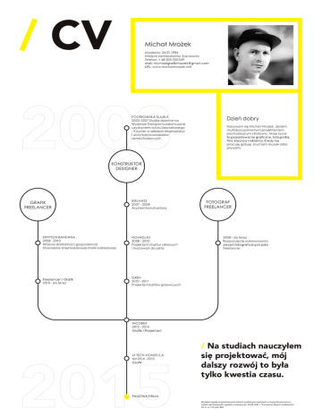 / CV Michał Mrożek Urodzony: 24.01.1984 Miejsce zamieszkania: Sosnowiec Telefon: + 48 505 520 049 URL: www.michalmrozek.net POLITECHNIKA ŚLĄSKA 2003-2007 Studia dzienne na Wydziale Transportu zakończone uzyskaniem tytułu zawodowego - inżynier w zakresie eksploatacji i utrzymania pojazdów samochodowych Dzień dobry Nazywam się Michał Mrożek. Jestem multidyscyplinarnym projektantem pochodzącym z Katowic. Moje życie pracuję gotuję, słucham muzyki albo pływam. KONSTRUKTOR DESIGNER GRAFIK FREELANCER KRYPTON BANDANA 2008 - 2010 Własna działalność gospodarcza Stworzenie streetwearowej marki odzieżowej 2010 - do teraz BIELMASZ 2007 - 2008 Asystent konstruktora NOVAGLAS 2008 - 2010 Projektant struktur szklanych i mocowań do szkła FOTOGRAF FREELANCER 2008 - do teraz Rozpoczęcie wykonywania freelancer GREŃ 2010 - 2011 Projektant kotłów grzewczych INCOBEX 2012 - 2014 LS TECH-HOMES S.A. od 2014 - 2015 / Na studiach nauczyłem się projektować, mój dalszy rozwój to była tylko kwestia czasu. PAŃSTWA FIRMA Wyrażam zgodę na przetwarzanie danych osobowych zawartych w mojej ofercie pracy w celach rekrutacyjnych, zgodnie z ustawą z dn. 29.08.1997 r. "O ochronie danych osobowych", Dz. U. nr 133, poz. 883 / Umiejętności Adobe Illustrator 80% Adobe InDesign 80% Adobe Photoshop 80% Adobe Premiere Pro 100% Adobe Lightroom 100% 90% Adobe Muse Maxon Cinema 4D 50% Autodesk Autocad 100% Autodesk Inventor 100% Apple 100% Canon EOS 100% Angielski 70% / Na WWW.MICHALMROZEK.NET znajdą Państwo moje realizacje. Posiadam profesjonalny sprzęt do grafiki: komputer, oprogramowanie i aparat.