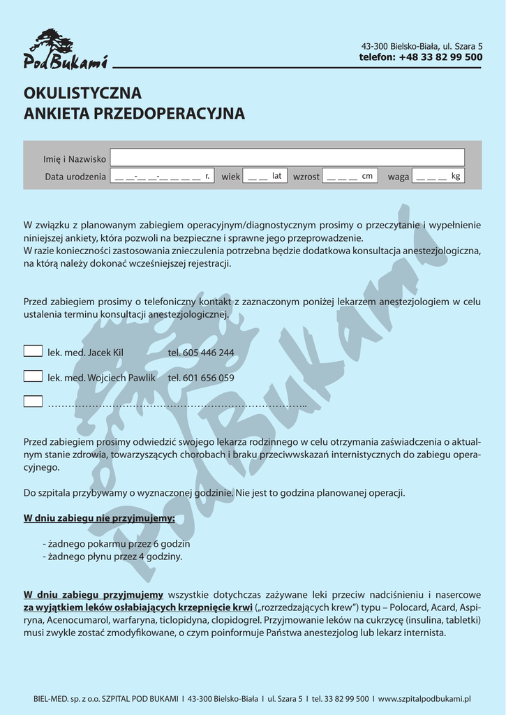 �������� �������� ��ł�������������� 43-300 Bielsko-Biała, ul. Szara 5 telefon: telefon:+48 +4833 3382 8299 99500 500 OKULISTYCZNA ANKIETA PRZEDOPERACYJNA W związku z planowanym zabiegiem operacyjnym/diagnostycznym prosimy o przeczytanie i wypełnienie niniejszej ankiety, która pozwoli na bezpieczne i sprawne jego przeprowadzenie. W razie konieczności zastosowania znieczulenia potrzebna będzie dodatkowa konsultacja anestezjologiczna, na którą należy dokonać wcześniejszej rejestracji. Przed zabiegiem prosimy o telefoniczny kontakt z zaznaczonym poniżej lekarzem anestezjologiem w celu ustalenia terminu konsultacji anestezjologicznej. lek. med. Jacek Kil tel. 605 446 244 lek. med. Wojciech Pawlik tel. 601 656 059 ………………………………………………………………….. Przed zabiegiem prosimy odwiedzić swojego lekarza rodzinnego w celu otrzymania zaświadczenia o aktualnym stanie zdrowia, towarzyszących chorobach i braku przeciwwskazań internistycznych do zabiegu operacyjnego. Do szpitala przybywamy o wyznaczonej godzinie. Nie jest to godzina planowanej operacji. W dniu zabiegu nie przyjmujemy: - żadnego pokarmu przez 6 godzin - żadnego płynu przez 4 godziny. W dniu zabiegu przyjmujemy wszystkie dotychczas zażywane leki przeciw nadciśnieniu i nasercowe za wyjątkiem leków osłabiających krzepnięcie krwi („rozrzedzających krew”) typu – Polocard, Acard, Aspiryna, Acenocumarol, warfaryna, ticlopidyna, clopidogrel. Przyjmowanie leków na cukrzycę (insulina, tabletki) musi zwykle zostać zmodyfikowane, o czym poinformuje Państwa anestezjolog lub lekarz internista. BIEL-MED. sp. z o.o. SZPITAL POD BUKAMI I 43-300 Bielsko-Biała I ul. Szara 5 I tel. 33 82 99 500 I www.szpitalpodbukami.pl �������� �������� ��ł�������������� 43-300 Bielsko-Biała, ul. Szara 5 telefon: 500 telefon:+48 +4833 33 82 82 99 99 500 Do szpitala przynosimy: - skierowanie na zabieg - dokument potwierdzający prawo do świadczeń zdrowotnych (legitymacja emeryta-rencisty lub aktualny druk RMUA lub legitymacja ubezpieczeniowa z aktualnym wpisem i pieczątka pracodawcy) - zaświadczenie od lekarza rodzinnego o aktualnym stanie zdrowia - numer NIP (osobisty oraz zakładu pracy) - dowód osobisty - wszystkie posiadane aktualne badania (laboratoryjne, RTG, EKG, TK, RM) - karty informacyjne z pobytów w szpitalu, sanatorium - przyjmowane leki (w oryginalnych opakowaniach) - pantofle - przybory toaletowe - ręcznik - szlafrok Cenne przedmioty osobiste pozostawiamy w domu. Na oddziale łóżkowym prosimy o ograniczenie ilości osób towarzyszących ze względu na zachowanie intymności pozostałych pacjentów. Pacjenci operowani w trybie „jednego dnia” mogą opuścić szpital tylko w towarzystwie osoby dorosłej, sprawnej umysłowo i fizycznie, która zapewni pacjentowi transport i opiekę przez 24 godziny po zabiegu. BIEL-MED. sp. z o.o. SZPITAL POD BUKAMI I 43-300 Bielsko-Biała I ul. Szara 5 I tel. 33 82 99 500 I www.szpitalpodbukami.pl WYWIAD CHOROBOWY: (dotyczy całego życia) Proszę o zaznaczenie prawidłowej odpowiedzi krzyżykiem 1. Czy choruje Pan(i) lub chorował(a) na serce i/lub nadciśnienie tętnicze? ______________________ tak zawał serca (data ________________) wada zastawki nie pieczenie, ból za mostkiem wysokie ciśnienie tętnicze operacja serca lub naczyń wieńcowych („bypass”), zabieg „balonikowania”, założenie stentów choroba niedokrwienna serca wysoki poziom cholesterolu stymulator serca („rozrusznik”) nierówne lub szybkie bicie serca obrzęki wokół kostek inne (opisz) _____________________ szmer serca szybkie męczenie się 2. Czy ma Pan(i) lub miał(a) jakieś choroby oskrzeli, płuc lub inne problemy z oddychaniem? _______ tak nie astma oskrzelowa rozedma zapalenie płuc (ostatnie 2 tygodnie) przewlekłe zapalenie oskrzeli gruźlica duszność przy położeniu się na plecach przewlekły kaszel przeziębienie, infekcja dróg oddechowych (ostatnie 2 tygodnie) inne (opisz) ______________________ z odksztuszaniem wydzieliny __________________________________ 3. Czy ma Pan(i) lub miał(a) jakieś problemy z żołądkiem lub wątrobą? _________________________ tak choroba wrzodowa zapalenie żołądka zapalenie wątroby/żółtaczka wirusowe typu A B C / tosyczne żółtaczka mechaniczna / zastój żółci refluks żołądkowo-przełykowy nie stłuczenie wątroby marskość wątroby inne (opisz) ______________________ 4. Czy ma Pan(i) lub miał(a) jakieś problemy z układem moczowym (nerki, pęcherz) lub gruczołem krokowym?___________________________________________________________ tak nie zapalenie nerek częste infekcje inne (opisz) ______________________ kamica nerkowa L P konieczność oddawania moczu w nocy __________________________________ trudność w oddawaniu moczu trudność w oddawaniu moczu __________________________________ 5. Czy ma Pan(i) lub miał(a) cukrzycę, dnę moczanową lub jakieś choroby tarczycy? ______________ tak nie cukrzyca typu 1 2 guzki / powiększenie tarczycy inne (opisz) ______________________ leczenie insuliną niedoczynność tarczycy __________________________________ dna moczanowa nadczynność tarczycy __________________________________ 6. Czy ma Pan(i) lub miał(a) jakieś choroby układu nerwowego (mózgu, nerwów), mięśni, kręgosłupa lub stawów?_______________________________________________________ tak udar lub inne niedokrwienie osłabienie mięśni (miastenia) porażenie lub niedowład osłabienie lub drętwienie rąk/nóg drgawki lub padaczka inne (opisz) ______________________ operacje kręgosłupa częste bóle głowy, migreny choroby zapalne stawów dolegliwości kręgosłupa szyjny piersiowy skłonność do krwawień krwotok po usunięciu zęba podskórne wylewy krwi przy małych urazach przedłużające się miesiączki zapalenie żył nie zakrzepica 