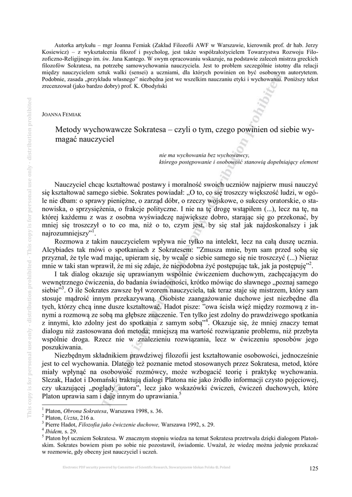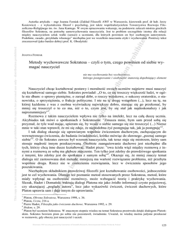 This copy is for personal use only - distribution prohibited - This copy is for personal use only - distribution prohibited Autorka artykułu – mgr Joanna Femiak (Zakład Filozofii AWF w Warszawie, kierownik prof. dr hab. Jerzy Kosiewicz) – z wykształcenia filozof i psycholog, jest także współzałożycielem Towarzystwa Rozwoju Filozoficzno-Religijnego im. św. Jana Kantego. W swym opracowaniu wskazuje, na podstawie zaleceń mistrza greckich filozofów Sokratesa, na potrzebę samowychowania nauczyciela. Jest to problem szczególnie istotny dla relacji między nauczycielem sztuk walki (sensei) a uczniami, dla których powinien on być osobowym autorytetem. Podobnie, zasada „przykładu własnego” niezbędna jest we wszelkim nauczaniu etyki i wychowaniu. Poniższy tekst zrecenzował (jako bardzo dobry) prof. K. Obodyński JOANNA FEMIAK Metody wychowawcze Sokratesa – czyli o tym, czego powinien od siebie wymagać nauczyciel nie ma wychowania bez wychowawcy, którego postępowanie i osobowość stanowią dopełniający element Nauczyciel chcąc kształtować postawy i moralność swoich uczniów najpierw musi nauczyć się kształtować samego siebie. Sokrates powiadał: „O to, co się troszczy większość ludzi, w ogóle nie dbam: o sprawy pieniężne, o zarząd dóbr, o rzeczy wojskowe, o sukcesy oratorskie, o stanowiska, o sprzysiężenia, o frakcje polityczne. I nie na tę drogę wstąpiłem (...), lecz na tę, na której każdemu z was z osobna wyświadczę największe dobro, starając się go przekonać, by mniej się troszczył o to co ma, niż o to, czym jest, by się stał jak najdoskonalszy i jak najrozumniejszy”1. Rozmowa z takim nauczycielem wpływa nie tylko na intelekt, lecz na całą duszę ucznia. Alcybiades tak mówi o spotkaniach z Sokratesem: ”Zmusza mnie, bym sam przed sobą się przyznał, że tyle wad mając, upieram się, by wcale o siebie samego się nie troszczyć (...) Nieraz mnie w taki stan wprawił, że mi się zdaje, że niepodobna żyć postępując tak, jak ja postępuję”2. I tak dialog okazuje się uprawianym wspólnie ćwiczeniem duchowym, zachęcającym do wewnętrznego ćwiczenia, do badania świadomości, krótko mówiąc do sławnego „poznaj samego siebie”3. O ile Sokrates zawsze był wzorem nauczyciela, tak teraz staje się mistrzem, który sam stosuje mądrość innym przekazywaną. Osobiste zaangażowanie duchowe jest niezbędne dla tych, którzy chcą inne dusze kształtować. Hadot pisze: ”owa ścisła więź między rozmową z innymi a rozmową ze sobą ma głębsze znaczenie. Ten tylko jest zdolny do prawdziwego spotkania z innymi, kto zdolny jest do spotkania z samym sobą”4. Okazuje się, że mniej znaczy temat dialogu niż zastosowana doń metoda; mniejszą ma wartość rozwiązanie problemu, niż przebyta wspólnie droga. Rzecz nie w znalezieniu rozwiązania, lecz w ćwiczeniu sposobów jego poszukiwania. Niezbędnym składnikiem prawdziwej filozofii jest kształtowanie osobowości, jednocześnie jest to cel wychowania. Dlatego też poznanie metod stosowanych przez Sokratesa, metod, które miały wpłynąć na osobowość rozmówcy, może wzbogacić teorię i praktykę wychowania. Slezak, Hadot i Domański traktują dialogi Platona nie jako źródło informacji czysto pojęciowej, czy ukazującej „poglądy autora”, lecz jako wskazówki ćwiczeń, ćwiczeń duchowych, które Platon uprawia sam i daje innym do uprawiania.5 1 Platon, Obrona Sokratesa, Warszawa 1998, s. 36. Platon, Uczta, 216 a. 3 Pierre Hadot, Filozofia jako ćwiczenie duchowe, Warszawa 1992, s. 29. 4 Ibidem, s. 29. 5 Platon był uczniem Sokratesa. W znacznym stopniu wiedza na temat Sokratesa przetrwała dzięki dialogom Platońskim. Sokrates bowiem pism po sobie nie pozostawił, świadomie. Uważał, że wiedzę można jedynie przekazać w rozmowie, gdy obecny jest nauczyciel i uczeń. 2 Electronic PDF security powered by Committee of Scientific Research, Stowarzyszenie Idokan Polska ®, Poland 125 This copy is for personal use only - distribution prohibited - This copy is for personal use only - distribution prohibited Spróbujmy także spojrzeć na dialogi z perspektywy zmian, jakie mają w człowieku wywołać. Otóż dla wszystkich szkół filozoficznych podstawową przyczyną cierpienia i nieświadomości człowieka są namiętności: chaotyczne pragnienia, obawy. Przeszkadzają one żyć prawdziwie. Nieprzygotowanie Kaliklesa polega na utożsamianiu siebie z żądzami i popędami. To powoduje, że siła rozumu jest jedynie instrumentem, na użytek popędów. Filozofia żąda człowieka w całości. Sama sprawność intelektualna nie wystarcza, trzeba wewnętrznej więzi z duszą, której się wiedzę przekazuje. Ktoś kto nie jest gotów tę więź stworzyć i włączyć się w proces wewnętrznych zmian, nie dostąpi poznania. Poznanie siebie (także i swoich emocji, namiętności) jest warunkiem życzliwości wobec partnera, wyjścia mu ze swoim zrozumieniem naprzeciw. Filozofia zatem okazuje się kształtowaniem nie tylko intelektu, lecz także sfery, którą dzisiaj nazwalibyśmy emocjonalo-uczuciową6. Każda szkoła ma swój własny sposób, ale wszędzie jest on związany z gruntownym przekształceniem sposobu postrzegania i bycia jednostki – oto cel ćwiczeń duchowych 7. Przejdźmy dalej, gdy znamy już warunki wstępne przyjmowania wiedzy poznajmy metodę jej przekazywania. Często funkcja dialogu platońskiego postrzegana jest jako „żywy proces dyskutowania”. To prawda, lecz wydaje się być o wiele istotniejszą rolą, proces myślenia i postrzegania, który podczas niego zachodzi. Podczas dialogu nauczyciel ćwiczy swoją uwagę, która pozwala odpowiedzieć natychmiast na zdarzenia i na pytania postawione z nagła. Ciągła czujność, rozbudzona samoświadomość, umożliwia dostosowanie każdej wypowiedzi do poziomu partnera. Ćwiczenie uwagi, która musi obejmować co najmniej trzy przedmioty: siebie samego, wychowa