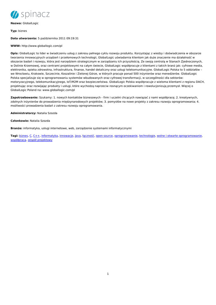 1 Nazwa: GlobalLogic Typ: biznes Data utworzenia: 5 października