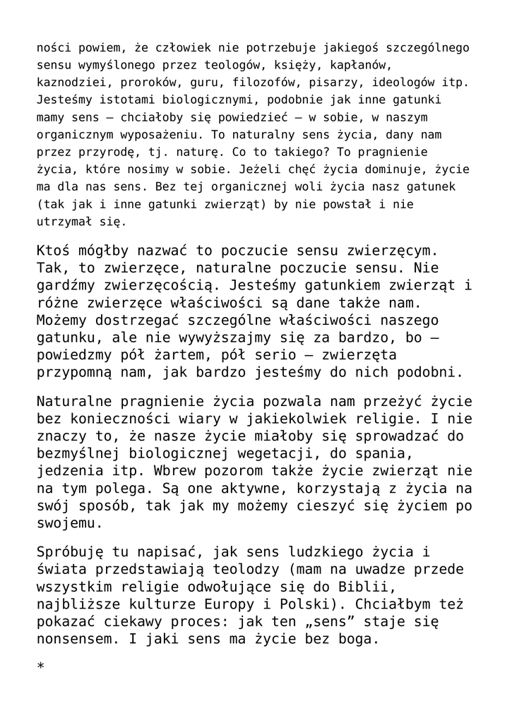 ności powiem, że człowiek nie potrzebuje jakiegoś szczególnego sensu wymyślonego przez teologów, księży, kapłanów, kaznodziei, proroków, guru, filozofów, pisarzy, ideologów itp. Jesteśmy istotami biologicznymi, podobnie jak inne gatunki mamy sens – chciałoby się powiedzieć – w sobie, w naszym organicznym wyposażeniu. To naturalny sens życia, dany nam przez przyrodę, tj. naturę. Co to takiego? To pragnienie życia, które nosimy w sobie. Jeżeli chęć życia dominuje, życie ma dla nas sens. Bez tej organicznej woli życia nasz gatunek (tak jak i inne gatunki zwierząt) by nie powstał i nie utrzymał się. Ktoś mógłby nazwać to poczucie sensu zwierzęcym. Tak, to zwierzęce, naturalne poczucie sensu. Nie gardźmy zwierzęcością. Jesteśmy gatunkiem zwierząt i różne zwierzęce właściwości są dane także nam. Możemy dostrzegać szczególne właściwości naszego gatunku, ale nie wywyższajmy się za bardzo, bo – powiedzmy pół żartem, pół serio – zwierzęta przypomną nam, jak bardzo jesteśmy do nich podobni. Naturalne pragnienie życia pozwala nam przeżyć życie bez konieczności wiary w jakiekolwiek religie. I nie znaczy to, że nasze życie miałoby się sprowadzać do bezmyślnej biologicznej wegetacji, do spania, jedzenia itp. Wbrew pozorom także życie zwierząt nie na tym polega. Są one aktywne, korzystają z życia na swój sposób, tak jak my możemy cieszyć się życiem po swojemu. Spróbuję tu napisać, jak sens ludzkiego życia i świata przedstawiają teolodzy (mam na uwadze przede wszystkim religie odwołujące się do Biblii, najbliższe kulturze Europy i Polski). Chciałbym też pokazać ciekawy proces: jak ten „sens” staje się nonsensem. I jaki sens ma życie bez boga. * Bóg jako dostawca sensu Według teologów, ludzkiemu życiu, człowiekowi, światu sens nadaje religia. Jako dostawca sensu występuje bóg. Jaki to sens? Mówią oni, że bóg stworzył świat i człowieka, a po śmierci będziemy żyć wiecznie w niebie. Czasami dodają, że bóg nas kocha i wspomaga. To jest ten sens. Dlatego naszym celem powinna być głęboka wiara, oddawanie czci bogu-stwórcy, dążenie do boga. Ten „sens” jest przekazywany nieznośnym księżowskim żargonem, nieznośną retoryką, potokiem sloganów, jakby autorzy nie potrafili mówić ludzkim głosem. Wszystko przetykane religijną mitologią, z której wyparowały życiodajne soki. Oto przykłady w miarę przejrzystych tekstów, chociaż przeładowanych teologią i księżowskim gadaniem (autorami są znani księża): „celem życia człowieka jest niebo, to znaczy zjednoczenie z Bogiem, który nas stworzył (tzn. „zrobił” z niczego, kodując w nas swój obraz i podobieństwo), zbawił (tzn. uratował od tego, co najbardziej nam ciąży, czyli od śmierci i lęku przed nią, od winy i od niszczącego jej poczucia) i w ogóle nas kocha. Wtedy (tzn. w niebie) osiągamy pełnię szczęścia dostępując pełni podobieństwa do Boga”. Inny ksiądz pisze: „W rozumieniu ludzkim, nie tylko chrześcijańskim, sensem życia powinna być miłość – czyli: jednoczenie się z Bogiem. Słowo ‚miłość’ jest tu brane w szerokim znaczeniu. Bo człowiek jednoczy się z Bogiem nie tylko w akcie modlitwy kontemplacyjnej, ale również gdy postępuje w prawości, mądrości, wolności, pokoju i miłości. Kiedy tak myśli, mówi i czyni, jednoczy się z Bogiem, uczestniczy w Jego Bóstwie. Specyfika zaś chrześcijaństwa polega na tym, że w tej drodze pomaga mu Jezus, który ową prawdę uwyraźnił w Ewangelii. Tak przez swoje nauczanie, jak i przez przykład własnego życia. I w ten sposób prowadzi swoich uczniów”. * Mieszanie teologii z fizyką