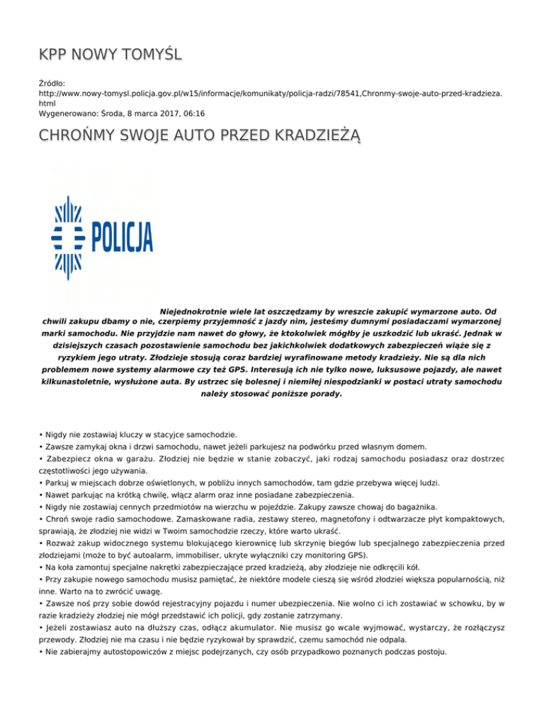 KPP NOWY TOMYŚL Źródło: http://www.nowy-tomysl.policja.gov.pl/w15/informacje/komunikaty/policja-radzi/78541,Chronmy-swoje-auto-przed-kradzieza. html Wygenerowano: Środa, 8 marca 2017, 06:16 CHROŃMY SWOJE AUTO PRZED KRADZIEŻĄ Niejednokrotnie wiele lat oszczędzamy by wreszcie zakupić wymarzone auto. Od chwili zakupu dbamy o nie, czerpiemy przyjemność z jazdy nim, jesteśmy dumnymi posiadaczami wymarzonej marki samochodu. Nie przyjdzie nam nawet do głowy, że ktokolwiek mógłby je uszkodzić lub ukraść. Jednak w dzisiejszych czasach pozostawienie samochodu bez jakichkolwiek dodatkowych zabezpieczeń wiąże się z ryzykiem jego utraty. Złodzieje stosują coraz bardziej wyrafinowane metody kradzieży. Nie są dla nich problemem nowe systemy alarmowe czy też GPS. Interesują ich nie tylko nowe, luksusowe pojazdy, ale nawet kilkunastoletnie, wysłużone auta. By ustrzec się bolesnej i niemiłej niespodzianki w postaci utraty samochodu należy stosować poniższe porady. • Nigdy nie zostawiaj kluczy w stacyjce samochodzie. • Zawsze zamykaj okna i drzwi samochodu, nawet jeżeli parkujesz na podwórku przed własnym domem. • Zabezpiecz okna w garażu. Złodziej nie będzie w stanie zobaczyć, jaki rodzaj samochodu posiadasz oraz dostrzec częstotliwości jego używania. • Parkuj w miejscach dobrze oświetlonych, w pobliżu innych samochodów, tam gdzie przebywa więcej ludzi. • Nawet parkując na krótką chwilę, włącz alarm oraz inne posiadane zabezpieczenia. • Nigdy nie zostawiaj cennych przedmiotów na wierzchu w pojeździe. Zakupy zawsze chowaj do bagażnika. • Chroń swoje radio samochodowe. Zamaskowane radia, zestawy stereo, magnetofony i odtwarzacze płyt kompaktowych, sprawiają, że złodziej nie widzi w Twoim samochodzie rzeczy, które warto ukraść. • Rozważ zakup widocznego systemu blokującego kierownicę lub skrzynię biegów lub specjalnego zabezpieczenia przed złodziejami (może to być autoalarm, immobiliser, ukryte wyłączniki czy monitoring GPS). • Na koła zamontuj specjalne nakrętki zabezpieczające przed kradzieżą, aby złodzieje nie odkręcili kół. • Przy zakupie nowego samochodu musisz pamiętać, że niektóre modele cieszą się wśród złodziei większa popularnością, niż inne. Warto na to zwrócić uwagę. • Zawsze noś przy sobie dowód rejestracyjny pojazdu i numer ubezpieczenia. Nie wolno ci ich zostawiać w schowku, by w razie kradzieży złodziej nie mógł przedstawić ich policji, gdy zostanie zatrzymany. • Jeżeli zostawiasz auto na dłuższy czas, odłącz akumulator. Nie musisz go wcale wyjmować, wystarczy, że rozłączysz przewody. Złodziej nie ma czasu i nie będzie ryzykował by sprawdzić, czemu samochód nie odpala. • Nie zabierajmy autostopowiczów z miejsc podejrzanych, czy osób przypadkowo poznanych podczas postoju. Źródło (KWP Kielce) Ocena: 0/5 (0) Tweetnij