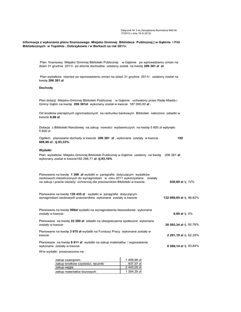 Załącznik Nr 3 do Zarządzenia Burmistrza MiG Nr 17/2012 z dnia 19.III.2012r. Informacja z wykonania planu finansowego Miejsko Gminnej Bibliotece Publicznej j w Gąbinie i Filii Bibliotecznych w Topólnie , Dobrzykowie i w Borkach za rok 2011r. Plan finansowy Miejsko Gminnej Biblioteki Publicznej w Gąbinie po wprowadzeniu zmian na dzień 31 grudnia 2011r. po stronie dochodów ustalony został na kwotę 206 381 zł zł Plan wydatków również po wprowadzeniu zmian na dzień 31 grudnia 2011r. ustalony został na kwotę 206 381 zł Dochody Plan dotacji Miejsko-Gminnej Biblioteki Publicznej w Gąbinie uchwalony przez Radę Miasta i Gminy Gąbin na kwotę 206 381zł wykonany został w kwocie 187 000,00 zł . Od środków pieniężnych zgromadzonych na rachunku bankowym Biblioteki naliczono odsetki w kwocie 8,86 zł Dotacja z Biblioteki Narodowej na zakup nowości wydawniczych na kwotę 5 600 zł wpłynęło 5 600 zł Ogółem planowane dochody w kwocie 206 381 zł , wykonane zostały w kwocie 608,86 zł , tj.93,33%. 192 Wydatki Plan wydatków Miejsko Gminnej Biblioteki Publicznej w Gąbinie ustalony na kwotę wykonany został w kwocie192 296,71 zł .tj.93,18% Planowane na kwotę 1 300 zł wydatki w paragrafie dotyczącym wydatków osobowych niezaliczonych do wynagrodzeń w roku 2011 wykorzystane zostały na zakup i pranie odzieży ochronnej dla pracowników Biblioteki w kwocie: Planowane na kwotę 136 435 zł wydatki w paragrafie dotyczącym wynagrodzeń osobowych pracowników wykonane zostały w kwocie Planowane na kwotę 500zł wydatki na wynagrodzenia bezosobowe wykonane zostały w kwocie: Planowane na kwotę 22 200 zł składki na ubezpieczenia społeczne wykonane zostały w kwocie 206 381 zł 930,00 zł tj. 72% 132 089,65 zł tj. 96,82% 0,00 zł tj. 0% 20 593,34 zł tj. 92,76% Planowane na kwotę 3 675 zł wydatki na Fundusz Pracy wykonane zostały w kwocie 2 291,19 zł tj. 62,35% Planowane na kwotę 8 811 zł wydatki na zakup materiałów i wyposażenia wykonane zostały w kwocie 8 268,14 zł tj. 93,84% W/w wydatki przeznaczono na : zakup czasopism zakup środków czystości, ręczniki zakup węgla zakup materiałów biurowych 1 459,96 zł 937,07 zł 2 445,00 zł 1 304,35 zł zakup materiałów remontowych: farba, wapno, ościeżnica, narożnik aluminiowy, świetlówki 830,51 zł zakup karty sieciowej 145,00 zł Zakup dla dzieci słodyczy, napojów itp.. na 295,25 zł konkurs recytatorski , art. Spoż., 851,00 zł Zakup nagród na konkursy, kwiaty,książki Razem: 0 8 268,14 zł Plan wydatków ustalony na kwotę12 500 zł na zakup książek do Biblioteki i jej Filii wykonany został w kwocie : Plan wydatków w kwocie 6 500 zł na energię elektryczną i ogrzewanie wykonany został w kwocie: 9 340,43 zł tj. 74,72% 6 295,60 tj. 96,86% Plan wydatków ustalony na kwotę 5 500 zł na zakup usług remontowych w Topólnie, wykonany został w kwocie: 4 640,49 zł tj. 84,37% Plan wydatków ustalony na kwotę 2 500 zł na zakup usług, wykonany został w kwocie na następujące usługi: 2 327,01 zł tj. 93,08% prowizja za prowadzenie rachunku zapłacona bankowi 954,92 zł wykonanie obróbek blacharskich w Bibliotece w Dobrzykowie 380,00 zł malowanie pomieszczeń, drzwi i futryn kasy pancernej przegląd gaśnic , instalacja oprogramowania komputerowego Razem: 750,00 zł 102,09 zł 140,00 zł 2 327,01 zł Plan wydatków opłaty za telefon stacjonarny ustalony na kwotę 1 100zł wykonany został w kwocie Plan wydatków ustalony na kwotę 400 zł z przeznaczeniem na podróże służbowe pracowników wykonany został w kwocie: Plan wydatków ustalony na kwotę 4960zł na fundusz socjalny pracowników wykorzystany został w kwocie Razem wykonanie wydatków : 1 008,24 zł tj. 91,66% 317,62 zł tj. 79,41% 4 195 zł tj. 84,58% 192 296,71 tj. 93,18% MG Biblioteka Publiczna w Gąbinie na dzień 31.12.2011r. nie posiadała zobowiązań.Należności wynosiły 787,52 zł - są to niewykorzystane środki dotacji na rachunku bankowym. Gąbin,luty 2012r. Wykonanie planu finasowego Miejsko-Gminnej Biblioteki w Gąbinie za rok 2011 DZIAŁ 926 KULTURA I OCHRONA DZIEDZICTWA NARODOWEGO DOCHODY Plan 92116 Biblioteki § 2480Dotacja podmiotowa z budżetu otrzymana przez samorządową instrytucję kultury § 0920 pozostałe odsetki § 2020 dotacje celowe otrzymane z budżetu państwa na zadania bieżące realizowane przez gminę na podstawie porozumień z organami administracji rządowej Razem Wykonanie % wykonania 206 381 187 000,00 0 8,86 90,61% 0,00% 0 5 600,00 206 381 192 608,86 93,33% WYDATKI 92116 Biblioteki § 3020 Wydatki osobowe niezaliczone do wynagrodzeń § 4010 Wynagrodzenia osobowe pracowników § 4110 Składki na ubezpieczenia społeczne § 4120 Składki na Fundusz Pracy § 4170 Wynagrodzenia bezosobowe § 4440 Odpisy na zakładowy fundusz świadczeń socjalnych § 4210 Zakup materiałów i wyposażenia § 4240 Zakup pomocy naukowych , dydaktycznych i książek § 4270 Zakup usług remontowych § 4300 Zakup usług pozostałych § 4410 Podróże służbowe krajowe § 4370 Opłaty z tytułu zakupu usług telekomunikacyjnych telefonii stacjonarnej § 4260 Zakup energii Razem Plan 1 300 136 435,00 22 200,00 3 675,00 500,00 4 960,00 8 811,00 12 500,00 5 500,00 2 500,00 400,00 1 100,00 6 500,00 206 381,00 Wykonanie % wykonania 930,00 72% 132 089,65 96,82% 20 593,34 92,76% 2 291,19 62,35% 0,00 0,00% 4 195,00 84,58% 8 268,14 93,84% 9 340,43 74,72% 4 640,49 84,37% 2 327,01 93,08% 317,62 79,41% 1 008,24 6 295,60 192 296,71 91,66% 96,86% 93,18%