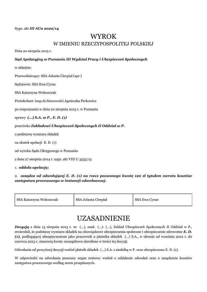 Sygn. akt III AUa 2020/14 WYROK W IMIENIU RZECZYPOSPOLITEJ POLSKIEJ Dnia 20 sierpnia 2015 r. Sąd Apelacyjny w Poznaniu III Wydział Pracy i Ubezpieczeń Społecznych w składzie: Przewodniczący: SSA Jolanta Cierpiał (spr.) Sędziowie: SSA Ewa Cyran SSA Katarzyna Wołoszczak Protokolant: insp.ds.biurowości Agnieszka Perkowicz po rozpoznaniu w dniu 20 sierpnia 2015 r. w Poznaniu sprawy (...) S.A. w P., E. D. (1) przeciwko Zakładowi Ubezpieczeń Społecznych II Oddział w P. o podstawę wymiaru składek na skutek apelacji E. D. (1) od wyroku Sądu Okręgowego w Poznaniu z dnia 27 sierpnia 2014 r. sygn. akt VIII U 3555/13 1. oddala apelację; 2. zasądza od odwołującej E. D. (1) na rzecz pozwanego kwotę 120 zł tytułem zwrotu kosztów zastępstwa procesowego w instancji odwoławczej. SSA Katarzyna Wołoszczak SSA Jolanta Cierpiał SSA Ewa Cyran UZASADNIENIE Decyzją z dnia 13 sierpnia 2013 r. nr (...), znak (...)- (...), Zakład Ubezpieczeń Społecznych II Oddział w P., stwierdził, że podstawę wymiaru składek na obowiązkowe ubezpieczenia społeczne i ubezpieczenie zdrowotne E. D. (1), podlegającej ubezpieczeniom jako pracownik u płatnika składek (...) S.A., w okresie od września 2012 r. do czerwca 2013 r. stanowią kwoty szczegółowo określone w treści tej decyzji. Odwołania od powyższej decyzji wniósł płatnik składek (...) S.A. z siedzibą w P. oraz ubezpieczona E. D. (1). W odpowiedzi na odwołania pozwany organ rentowy wniósł o oddalenie odwołań oraz o zasądzenie kosztów zastępstwa procesowego według norm przepisanych. Zarządzeniem z dnia 12 listopada 2013 r. połączono sprawę z odwołania E. D. (1) od decyzji (...) z dnia 13 sierpnia 2013 r. ze sprawą z odwołania (...) S.A. od decyzji (...) z dnia 13 sierpnia 2013 r. celem ich łącznego rozpoznania i rozstrzygnięcia w sprawie o sygn. VIII U 3555/13. Wyrokiem z dnia 27 sierpnia 2014 r., wydanym w sprawie o sygn. VIII U 3555/13, Sąd Okręgowy w Poznaniu, Wydział VIII Ubezpieczeń Społecznych oddalił odwołania (...) S.A. z siedzibą w P. oraz ubezpieczonej E. D. (1) od decyzji Zakładu Ubezpieczeń Społecznych II Oddział w P. z dnia 13 sierpnia 2013 r. nr (...), znak (...)- (...) (pkt I), zasądził od odwołującej (...) S.A. z siedzibą w P. na rzecz Zakładu Ubezpieczeń Społecznych II Oddział w P. kwotę 60 zł tytułem zwrotu kosztów zastępstwa procesowego (pkt II) oraz zasądził od odwołującej E. D. (1) na rzecz Zakładu Ubezpieczeń Społecznych II Oddział w P. kwotę 60 zł tytułem zwrotu kosztów zastępstwa procesowego (pkt III). Podstawę rozstrzygnięcia Sądu Okręgowego stanowiły następujące ustalenia i rozważania: E. D. (1) urodziła się w dniu (...) i ma wykształcenie wyższe – ukończyła studia magisterskie na kierunku filologia polska, w zakresie specjalności nauczycielskiej. Sąd Okręgowy ustalił, że odwołująca od dnia 3 marca 2008 r. do nadal jest zatrudniona w Szkole Podstawowej im. A. L. w D., w pełnym wymiarze czasu pracy, na stanowisku nauczyciela języka polskiego. Natomiast płatnik składek spółka (...) S.A. z siedzibą w P. jest wpisana do Krajowego Rejestru Sądowego pod numerem KRS (...). Podstawowym przedmiotem działalności spółki jest działalność firm centralnych i holdingów, z wyłączeniem holdingów finansowych. Z ustaleń Sądu I instancji wynika, że w dniu 14 września 2012 r. E. D. (1) została zatrudniona przez (...) S.A. na podstawie umowy o pracę na czas określony na stanowisku C. w wymiarze 1/2 etatu. Umowa została zawarta na okres od dnia 14 września 2012 r. do dnia 13 października 2012 r. Strony ustaliły, iż odwołującą obowiązywać będzie zadaniowy czas pracy a za wykonywane obowiązki otrzyma wynagrodzenie w wysokości 750,00 zł brutto. Jako datę rozpoczęcia pracy wskazano dzień 14 września 2012 r. Do zakresu obowiązków odwołującej należało: twórcza realizacja strategii reklamowej wpisującej się w misję firmy, współtworzenie koncepcji strategii reklamowych dla klientów firmy, odpowiedzialność za stronę tekstową reklamy i stron www klientów oraz firmy własnej, redagowanie tekstów m.in. scenariuszy filmów reklamowych, artykułów sponsorowanych w prasie branżowej, szeroko pojętych materiałów reklamowych, sloganów i haseł reklamowych, ulotek lub ogłoszeń prasowych również dla klientów firmy, prezentacji multimedialnych, mailingów zewnętrznych, a ponadto obowiązek współpracy z przełożonym i działem marketingu firm partnerskich nad opracowywaniem koncepcji strategii rozwoju, współpraca z klientem i działem reklamy w celu zgodności tekstu reklamowego z założeniem strategii marketingowej, koordynacja pracy nad tekstem, współpraca z grafikiem czuwając nad poprawnym kształtem materiałów reklamowych oraz współpraca z firmą multimedialną czuwając nad właściwym kształtem i treścią filmów promocyjnych firm partnerskich. Sąd Okręgowy ustalił ponadto, że w dniach od 14 do 15 września 2012 r. odwołująca odbyła szkolenie w dziedzinie bezpieczeństwa i higieny pracy oraz przedłożyła zaświadczenie lekarskie z dnia 14 września 2012 r. o braku przeciwwskazań zdrowotnych do wykonywania pracy na stanowisku (...). W związku z zawarciem umowy o pracę, z dniem 14 września 2012 r. odwołująca została zgłoszona do obowiązkowych ubezpieczeń społecznych: emerytalnego, rentowych, chorobowego i wypadkowego. Z ustaleń Sądu I instancji wynika, że pracodawca był zadowolony z wykonywanej przez odwołującą pracy, z pisanych tekstów i docenił jej przydatność dla firmy. Stanowisko było wykreowane w taki sposób, że istniała możliwość wykonywania pracy zdalnej, poza siedzibą firmy, a odwołująca rozliczana była z pracy godzinowo. Do pierwszych zadań odwołującej należało tworzenie tekstów perswazyjnych, czyli zawierających taki opis produktu, by zachęcić klienta do wyboru określonej marki. Ponadto odwołująca uczyła si