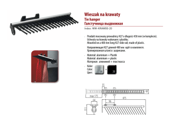 Wieszak na krawaty Tie hanger Галстучница выдвижная Index: WW-KRAW00-20 Produkt mocowany prowadnicy H27 o długości 450 mm (w komplecie). Uchwyty na krawaty wykonane z plastiku. Mounted on a 400 mm long H27 slide rail; made of plastic. Направляющая H27 длиной 400 мм идёт в комплекте. Хромированная штанга с шариками. • Materiał: aluminium + Plastik Material: aluminium + plastic Материал: алюминий + пластмасса • Kolor: Color: + Цвет: • 40 35 111 max 175 64 96 475
