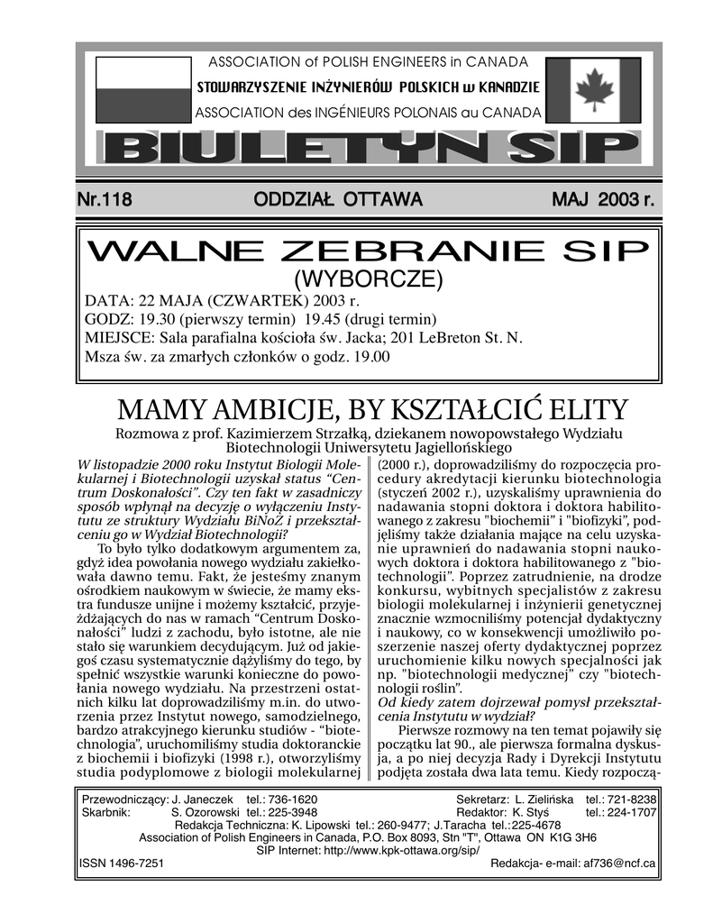 ASSOCIATION of POLISH ENGINEERS in CANADA STOWARZYSZENIE IN¸YNIERØW POLSKICH w KANADZIE ASSOCIATION des INGÉNIEURS POLONAIS au CANADA B I ULETYN SIP Nr.118 ODDZIAÒ OTTAWA MAJ 2003 r. WALNE ZEBRANIE SIP (WYBORCZE) DATA: 22 MAJA (CZWARTEK) 2003 r. GODZ: 19.30 (pierwszy termin) 19.45 (drugi termin) MIEJSCE: Sala parafialna koßcio¬a ßw. Jacka; 201 LeBreton St. N. Msza ßw. za zmar¬ych cz¬onkøw o godz. 19.00 MAMY AMBICJE, BY KSZTAÒCIÇ ELITY Rozmowa z prof. Kazimierzem Strza¬kå, dziekanem nowopowsta¬ego Wydzia¬u Biotechnologii Uniwersytetu Jagiello˜skiego W listopadzie 2000 roku Instytut Biologii Molekularnej i Biotechnologii uzyska¬ status “Centrum Doskona¬oßci”. Czy ten fakt w zasadniczy sposøb wp¬ynå¬ na decyzj´ o wy¬åczeniu Instytutu ze struktury Wydzia¬u BiNoZ i przekszta¬ceniu go w Wydzia¬ Biotechnologii? To by¬o tylko dodatkowym argumentem za, gdyΩ idea powo¬ania nowego wydzia¬u zakie¬kowa¬a dawno temu. Fakt, Ωe jesteßmy znanym oßrodkiem naukowym w ßwiecie, Ωe mamy ekstra fundusze unijne i moΩemy kszta¬ciç, przyjeΩdΩajåcych do nas w ramach “Centrum Doskona¬oßci” ludzi z zachodu, by¬o istotne, ale nie sta¬o si´ warunkiem decydujåcym. JuΩ od jakiegoß czasu systematycznie dåΩylißmy do tego, by spe¬niç wszystkie warunki konieczne do powo¬ania nowego wydzia¬u. Na przestrzeni ostatnich kilku lat doprowadzilißmy m.in. do utworzenia przez Instytut nowego, samodzielnego, bardzo atrakcyjnego kierunku studiøw - “biotechnologia”, uruchomilißmy studia doktoranckie z biochemii i biofizyki (1998 r.), otworzylißmy studia podyplomowe z biologii molekularnej (2000 r.), doprowadzilißmy do rozpocz´cia procedury akredytacji kierunku biotechnologia (stycze˜ 2002 r.), uzyskalißmy uprawnienia do nadawania stopni doktora i doktora habilitowanego z zakresu "biochemii” i "biofizyki”, podj´lißmy takΩe dzia¬ania majåce na celu uzyskanie uprawnie˜ do nadawania stopni naukowych doktora i doktora habilitowanego z "biotechnologii”. Poprzez zatrudnienie, na drodze konkursu, wybitnych specjalistøw z zakresu biologii molekularnej i inΩynierii genetycznej znacznie wzmocnilißmy potencja¬ dydaktyczny i naukowy, co w konsekwencji umoΩliwi¬o poszerzenie naszej oferty dydaktycznej poprzez uruchomienie kilku nowych specjalnoßci jak np. "biotechnologii medycznej” czy "biotechnologii roßlin”. Od kiedy zatem dojrzewa¬ pomys¬ przekszta¬cenia Instytutu w wydzia¬? Pierwsze rozmowy na ten temat pojawi¬y si´ poczåtku lat 90., ale pierwsza formalna dyskusja, a po niej decyzja Rady i Dyrekcji Instytutu podj´ta zosta¬a dwa lata temu. Kiedy rozpoczå- Przewodniczåcy: J. Janeczek tel.: 736-1620 Sekretarz: L. Zieli˜ska tel.: 721-8238 Skarbnik: S. Ozorowski tel.: 225-3948 Redaktor: K. Styß tel.: 224-1707 Redakcja Techniczna: K. Lipowski tel.: 260-9477; J.Taracha tel.: 225-4678 Association of Polish Engineers in Canada, P.O. Box 8093, Stn "T", Ottawa ON K1G 3H6 SIP Internet: http://www.kpk-ottawa.org/sip/ ISSN 1496-7251 Redakcja- e-mail: [email protected] ¬em kadencj´ jako dyrektor Instytutu uchwalilißmy d¬ugofalowy program rozwoju. Jednym z za¬oΩe˜ tego programu by¬o w¬aßnie utworzenie w przysz¬oßci wydzia¬u, ale bez sprecyzowania dat. Od tej pory jednak konsekwentnie pracowalißmy nad tym, by spe¬niaç wszystkie kryteria potrzebne do utworzenia wydzia¬u. Wniosek o przekszta¬cenie Instytutu w wydzia¬ wyszed¬ wiosnå tego roku, w kwietniu by¬a decyzja senatu, 1 pa≈dziernika br. zainaugurujemy nowy rok akademicki juΩ jako Wydzia¬ Biotechnologii. Bylißmy dobrze przygotowani i dlatego uda¬o si´ tak sprawnie to wszystko przeprow adziç. Trzeba jednak przyznaç, Ωe ostatnie lata szczegølnie sprzyja¬y temu przedsi´wzi´ciu. Niebagatelne znaczenie, we wrzeßniu ubieg¬ego roku, mia¬a teΩ przeprowadzka Instytutu do nowoczesnego budynku na terenie trzeciego Kampusu. Nowy gmach, wybudowany wed¬ug europejskich standardøw, da¬ szans´ na dalszy dynamiczny rozwøj, zarøwno naukowy, jak i dydaktyczny, dzia¬ajåcego od trzydziestu dwøch lat Instytutu. Wiodåce miejsce w dziedzinie biochemii i biofizyki nie tylko w Polsce, ale przede wszystkim na ßwiecie zajmujemy od wielu lat, ale dopiero teraz tak naprawd´ naukowcy zza granicy mogå przyjeΩdΩaç do nas nie po, by oglådaç Krakøw czy wyg¬osiç referat, ale przede wszystkim, by pracowaç w naszych laboratoriach, korzystaç z naszych urzådze˜, z naszych doßwiadcze˜. W dawnej siedzibie nie by¬o to moΩliwe. Teraz pracownikom naukowym, przyjeΩdΩajåcym do nas z ca¬ego ßwiata, m.in. ze Szwajcarii czy Belgii, zapewniamy naprawd´ dobre warunki. W tej chwili choçby w moim macierzystym Zak¬adzie Fizjologii i Biochemii Roßlin pracujå cztery osoby z zagranicy. Podczas uroczystoßci otwarcia nowej siedziby na trzecim Kampusie 12 pa≈dziernika 2001 roku rektor Franciszek Ziejka powiedzia¬, Ωe przed Instytutem Biologii Molekularnej i Biotechnologii ogromne wyzwanie, by sprostaç oczekiwaniom spo¬ecznoßci akademickiej. Musz´ przyznaç, Ωe obawia¬em si´ nieco, by przy tej przeprowadzce Instytut nie obniΩy¬ swojej mocnej pozycji. Pracownicy Instytutu byli przecieΩ na kilka miesi´cy oderwani od laboratorium, musieli si´ pakowaç, a nast´pnie w nowym miejscu instalowaç aparatur´ itp. Instytut mia¬ kilkumiesi´cznå przerw´ w funkcjonowaniu. Troch´ ba¬em si´ teΩ, by urzådzanie nowej siedziby nie oderwa¬o ludzi na d¬uΩej od pracy. Na szcz´ßcie przez etap przeprowadzki przebrn´lißmy doßç szybko. Pierwsze urzådzenia dzia¬a¬y juΩ po dwøch, trzech tygodniach. A o tym, Ωe jednak utrzymalißmy swå wysokå pozycj´ ßwiadczy choçby ranking KBN-u, przeprowadzony w kwietniu br. Jeßli chodzi o dzia¬alnoßç na- ukowå, to Instytut wyrabia prawie po¬ow´ punktøw, ktøre majå sumarycznie pozosta¬e instytuty BiNoZ-u, co ßwiadczy o jego duΩym potencjale badawczym i dydaktycznym. Potwierdzeniem wysokiej rangi Instytutu jes
