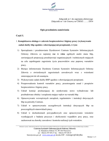 Załącznik nr 1 do zapytania ofertowego Załącznik nr 1 do Umowy nr CSIOZ/……./2014 Opis przedmiotu zamówienia Część I. 1. Kompleksowa obsługa w zakresie bezpieczeństwa i higieny pracy (wykonywanie zadań służby bhp zgodnie z obowiązującymi przepisami), w tym: 1) Sporządzanie i przedstawianie Dyrektorowi Centrum Systemów Informacyjnych Ochrony Zdrowia co najmniej raz w roku ogólnych analiz stanu bhp, zawierających propozycję przedsięwzięć organizacyjnych i technicznych mających na celu zapobieganie zagrożeniu życia pracowników oraz poprawę warunków pracy. 2) Bieżące informowanie Dyrektora Centrum Systemów Informacyjnych Ochrony Zdrowia o stwierdzonych zagrożeniach zawodowych wraz z wnioskami zmierzającymi do ich usunięcia. 3) Wykonywanie zadań służby BHP zgodnie z obowiązującymi przepisami. 4) Przeprowadzenie kontroli warunków pracy, przestrzegania zasad i przepisów bezpieczeństwa i higieny pracy. 5) Udział komisji przekazującej do użytkowania nowo wybudowane lub przebudowane obiekty i urządzenia mające wpływ na warunki bhp. 6) Opracowywanie wewnętrznych zarządzeń, regulaminów i instrukcji dotyczących bhp na potrzeby Centrum. 7) Udział w opracowywaniu szczegółowych instrukcji dotyczących bhp na poszczególnych stanowiskach pracy. 8) Udział w dochodzeniach powypadkowych oraz opracowywanie wniosków wynikających z badania przyczyn i okoliczności wypadków przy pracy, oraz zachorowań na choroby zawodowe i kontrola realizacji tych wniosków. Dokument w postaci elektronicznej opatrzony został bezpiecznym podpisem elektronicznym weryfikowanym za pomocą ważnego kwalifikowanego certyfikatu. Centrum Systemów Informacyjnych Ochrony Zdrowia ul. Stanisława Dubois 5A, 00-184 Warszawa tel. +48(22) 597-09-27 fax +48(22) 597-09-47 [email protected] www.csioz.gov.pl skrytka ESP : /csiozgovpl/skrytka Strona 1 z 3 9) Odpracowywanie protokołów powypadkowych z dziedziny bhp. 10) Doradztwo w zakresie obowiązujących zasad i przepisów bhp. 11) Doradztwo w zakresie obowiązku doboru najwłaściwszych środków ochrony osobistej i zbiorowej na stanowiskach pracy. 12) Szkolenie wstępne i okresowe pracowników zakresie bhp oraz prowadzenie dokumentacji wymaganej przepisami. 13) Szkolenie wstępne i okresowe pracowników zakresie bhp oraz prowadzenie dokumentacji wymaganej przepisami z nowo zatrudnionymi pracownikami CSIOZ. 14) Sprawowanie nadzoru na zapewnieniem w zakładzie właściwego stanu bhp. 15) Udział w opracowaniu zasad i norm przydziału środków ochrony indywidualnej odzieży i obuwia roboczego, środków czystości oraz posiłków i napojów. 16) Wykonanie i uaktualnianie dokumentacji związanej z Oceną Ryzyka Zawodowego. Część II. 2. Kompleksowa obsługa przeciwpożarowa (wykonywanie zadań związanych z ochroną przeciwpożarową zgodnie z obowiązującymi przepisami), w tym: 1) Sporządzanie i przedstawianie Dyrektorowi co najmniej raz w roku ogólnych analiz stanu bezpieczeństwa pożarowego, zawierających propozycję przedsięwzięć organizacyjnych i technicznych mających na celu zapobieganie zagrożeniu pożarowemu. 2) Bieżące informowanie Dyrektora o stwierdzonych zagrożeniach pożarowych wraz z wnioskami zmierzającymi do ich usunięcia. 3) Sporządzanie instrukcji bezpieczeństwa pożarowego. 4) Przygotowanie planów rozmieszczenia sprzętu ppoż. 5) Sporządzenie ocen ryzyk. 6) Prowadzenie ćwiczeń z ewakuacji budynków. 7) Przygotowanie planów ewakuacji z budynku. 8) Przeprowadzanie szkoleń ppoż dla pracowników i prowadzenie wymaganej przepisami dokumentacji. Dokument w postaci elektronicznej opatrzony został bezpiecznym podpisem elektronicznym weryfikowanym za pomocą ważnego kwalifikowanego certyfikatu. Centrum Systemów Informacyjnych Ochrony Zdrowia ul. Stanisława Dubois 5A, 00-184 Warszawa tel. +48(22) 597-09-27 fax +48(22) 597-09-47 [email protected] www.csioz.gov.pl Strona 2 z 3 9) Przeprowadzanie szkoleń każdorazowo z nowo zatrudnionymi pracownikami CSIOZ w ilości od 5 osób. 10) Wydawanie opinii, uzgodnień ppoż. 11) Świadczenie doradztwa w zakresie ochrony ppoż. 12) Pomoc w realizacji zaleceń pokontrolnych Państwowej Straży Pożarnej. 13) Inne usługi związane z bezpieczeństwem pożarowym. 14) Przeprowadzanie kontroli przestrzegania przepisów przeciwpożarowych. 15) Udział w dochodzeniach powypadkowych oraz opracowywanie wniosków wynikających z badania przyczyn i okoliczności zdarzenia. 16) Opracowywanie protokołów powypadkowych z dziedziny ppoż. 17) Opracowywanie wewnętrznych zarządzeń, regulaminów i instrukcji dotyczących ppoż. na potrzeby Centrum Uwagi: Zamawiający jest jednostką budżetową zgodnie z przepisami o finansach publicznych. Minimalne wymagania dla Wykonawcy: Dla części I 1) o udzielenie zamówienia mogą się ubiegać wykonawcy posiadający aktualne uprawnienia do wykonywania działalności tj.: a) osoby realizujące przedmiot zamówienia muszą posiadać wykształcenie wyższe oraz 6-letni staż pracy w służbie BHP, warunkiem koniecznym jest ukończenie podstawowego szkolenia przewidzianego dla pracowników służb BHP lub b) osoba fizyczna realizujące przedmiot zamówienia musi posiadająca wykształcenie wyższe oraz 6-letni staż pracy w służbie BHP, warunkiem koniecznym jest ukończenie podstawowego szkolenia przewidzianego dla pracowników służb BHP. Dla części II 1) o udzielenie zamówienia mogą się ubiegać wykonawcy posiadający aktualne uprawnienia do wykonywania działalności tj.: a) osoby realizujące przedmiot zamówienia muszą posiadać uprawnienia dotyczące prowadzenia szkoleń z problematyki zagrożenia pożarowego oraz do realizacji wymagań określonych w opisie przedmiotu. Dokument w postaci elektronicznej opatrzony został bezpiecznym podpisem elektronicznym weryfikowanym za pomocą ważnego kwalifikowanego certyfikatu. Centrum Systemów Informacyjnych Ochrony Zdrowia ul. Stanisława Dubois 5A, 00-184 Warszawa tel