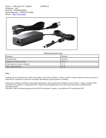 Nazwa :: 65W Smart AC Adapter Producent :: HP Kod AB :: RNHPDZ00082 Kod producenta :: ED494AA#ABB Strona :: http://www.hp.pl ED494AA Tabela parametryczna Parametr Wartość Przeznaczenie sieciowy Napięcie na wyjściu (Volt) 18.5 V Prąd wyjściowy (max.) (Amper) 11 A Moc zasilacza (Wat) 65 W Opis Zasilanie zawsze do dyspozycji. Jeden taki zasilacz warto mieć na biurku w pracy, a jeden w domu. Można też zawsze nosić go w torbie HP na notebook, co pozwala oszczędzać akumulatory podczas przerw w podróży. Jednoczesne zasilanie notebooka i ładowanie akumulatora tak przygotowany komputer możesz zabrać w drogę w każdej chwili Certyfikowana zgodność z notebookami HP i ochrona przed przepięciami, nawet tymi spowodowanymi wyładowaniami atmosferycznymi Niewielki i lekki, doskonale pasujący do torby HP na notebook i zgodny z wszystkimi 65 W notebookami HP
