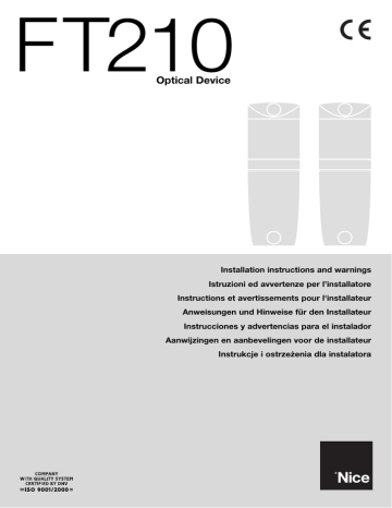 FT210 Optical Device Installation instructions and warnings Istruzioni ed avvertenze per l’installatore Instructions et avertissements pour l'installateur Anweisungen und Hinweise für den Installateur Instrucciones y advertencias para el instalador Aanwijzingen en aanbevelingen voor de installateur Instrukcje i ostrzeżenia dla instalatora 1) Ostrzeżenia Ta instrukcja zawiera ważne informacje dotyczące bezpieczeństwa podczas instalowania, należy się z nią zapoznać przed rozpoczęciem prac instalacyjnych. Niniejszą instrukcję należy przechowywać w celu ewentualnej, przyszłej konsultacji. Biorąc pod uwagę niebezpieczeństwa, jakie mogą wystąpić podczas instalowania i użytkowania FT210, dla zwiększenia bezpieczeństwa, instalacja musi odpowiadać przepisom, normom i uregulowaniom prawnym. Według obowiązujących przepisów europejskich, wykonanie drzwi lub bramy automatycznej musi być zgodne z Dyrektywą 98/37/CE (Dyrektywa Maszynowa), a w szczególności musi odpowiadać normom: EN 13241-1 (norma zharmonizowana); EN 12445; EN 12453 i EN 12635, które pozwalają na wystawienie oświadczenia zgodności z dyrektywą maszyn. Dodatkowe informacje, wytyczne do analiz zagro_e_ i Ksi__ka Techniczna, s_ dost_pne na: www.niceforyou.com. Niniejsza instrukcja przeznaczona jest jedynie dla personelu technicznego z odpowiednimi kwalifikacjami do instalowania. _adne informacje znajduj_ce si_ w niniejszej instrukcji nie s_ skierowane do ko_cowego u_ytkownika! • Użycie FT210 do innych celów niż przewidziano w niniejszej instrukcji jest zabronione; użycie niezgodne z przeznaczeniem może spowodować zagrożenie i wyrządzić szkody ludziom oraz uszkodzić inne obiekty. • Nie wykonywać żadnych zmian i modyfikacji, jeśli nie są one przewidziane w niniejszej instrukcji; operacje tego rodzaju mogą jedynie spowodować niewłaściwe działanie; NICE nie bierze odpowiedzialności za szkody spowodowane przez zmodyfikowany produkt. • FT210 może funkcjonować tylko przy bezpośrednim kontakcie optycznym TX-RX; zabronione jest użytkowanie z wykorzystaniem lusterka. • Dla podłączeń elektrycznych stosować odpowiednie przewody, jak to wskazano w rozdziale „Instalacja”. • Upewnić się, czy zasilanie elektryczne oraz inne parametry użytkowe odpowiadają wartościom podanym w tabeli „Dane techniczne”. • Upewnić się, czy zasilanie elektryczne oraz inne parametry użytkowe odpowiadają wartościom podanym w tabeli „Dane techniczne”. • EN 12453 Drzwi i bramy przemysłowe, handlowe i do garażu. Bezpieczeństwo użytkowania drzwi zautomatyzowanych – Wymagania. • EN 12978 - Drzwi i bramy przemysłowe, handlowe i do garażu. Urządzenia zabezpieczające do bram i drzwi zautomatyzowanych – Wymagania i sposoby wykonywania prób. Instalacja i podłączenie FT210 w celu realizacji urządzenia zabezpieczającego bez spełnienia wymagań powyższych norm uważane jest za niedbałość i samowolne nadużycie! Szczególną uwagę należy zwrócić na użytkowanie niniejszego produktu z punktu widzenia dyrektywy o “Zgodności elektromagnetycznej” 89/336/CEE wraz z późniejszymi zmianami 92/31/CEE oraz 93/68/CEE: Niniejszy produkt został poddany badaniom w zakresie zgodności elektromagnetycznej w skrajnych sytuacjach użytkowania, w konfiguracjach przewidywanych w niniejszym podręczniku użytkownika oraz w połączeniu z artykułami znajdującymi się w katalogu produktów firmy Nice S.p.a. Zgodność elektromagnetyczna może nie być zagwarantowana, jeśli produkt użytkowany będzie w połączeniu z innymi wyrobami nieprzewidzianymi przez Nice; zabronione jest użytkowanie niniejszego produktu w takich sytuacjach póki osoba dokonująca instalacji nie upewni się co do zgodności z wymaganiami zawartymi w dyrektywie. 2) Opis produktu i przeznaczenie FT210 jest to urządzenie, które służy do rozwiązania problemów z połączeniami elektrycznymi listew krawędziowych zamontowanych na ruchomych skrzydłach. Składa się z nadajnika działającego na podczerwień (TX), zasilanego pojemną baterią, instalowanego na skrzydle ruchomym, na którym montowana jest listwa krawędziowa, oraz z normalnie zasilanego (12÷24Vpp/ps) odbiornika (RX) zamontowanego na nieruchomej części bramy. Listwa krawędziowa, o oporności 8,2kΩ jest pod stałą kontrolą nadajnika, a sygnał w momencie zadziałania listwy wysyłany jest do odbiornika. Odbiornik RX przetwarza odebrany sygnał i odpowiednio do stanu listwy krawędziowej, uaktywnia, lub nie, 2 przekaźniki wyjścia STOP i STOP1 (nawet FOTO, jeśli mostek JP2 obiornika jest wyłączony). Patrz tabela 2). Połączenie pomiędzy TX i RX jest kodowane w systemie o wysokim poziomie bezpieczeństwa czyli, że całe urządzenie przynależy do 3 kategorii odporności na usterkę według normy EN 954-1, które może być stosowane w systemach PSPE zgodnie z normą EN 12978. • EN 1760-2 Bezpieczeństwo maszyn - Urządzenia zabezpieczające reagujące na nacisk - Główne podstawy do projektowania i wykonywania testów reagujących na nacisk. • EN 12978 - Drzwi i bramy przemysłowe, handlowe i do garażu. Urządzenia zabezpieczające do bram i drzwi zautomatyzowanych - Wymagania i sposoby wykonywania prób. Uwaga: FT210 nie jest kompletnym urządzeniem zabezpieczającym, jest tylko częścią składową takiego urządzenia! Jeżeli TX i RX zostaną ustawione taki sposób, że połączenie na linii optycznej przebiegało będzie poprzez chroniony obszar (patrz rys. 1), wówczas urządzenie może być wykorzystane również jako wykrywacz obecności (typ D według normy EN 12453); przedmiot, który przerywa wiązkę światła powoduje wyłączenie trzeciego przekaźnika wyjściaFOTO. TX RX Urządzenie fotooptyczne FT210, poskładane zgodnie z instrukcjami i skompletowane z listwą krawędziową TCB65 posiada certyfikat producenta potwierdzający, że odpowiada następującym normom: • Urządzenie fotooptyczne FT210, posk