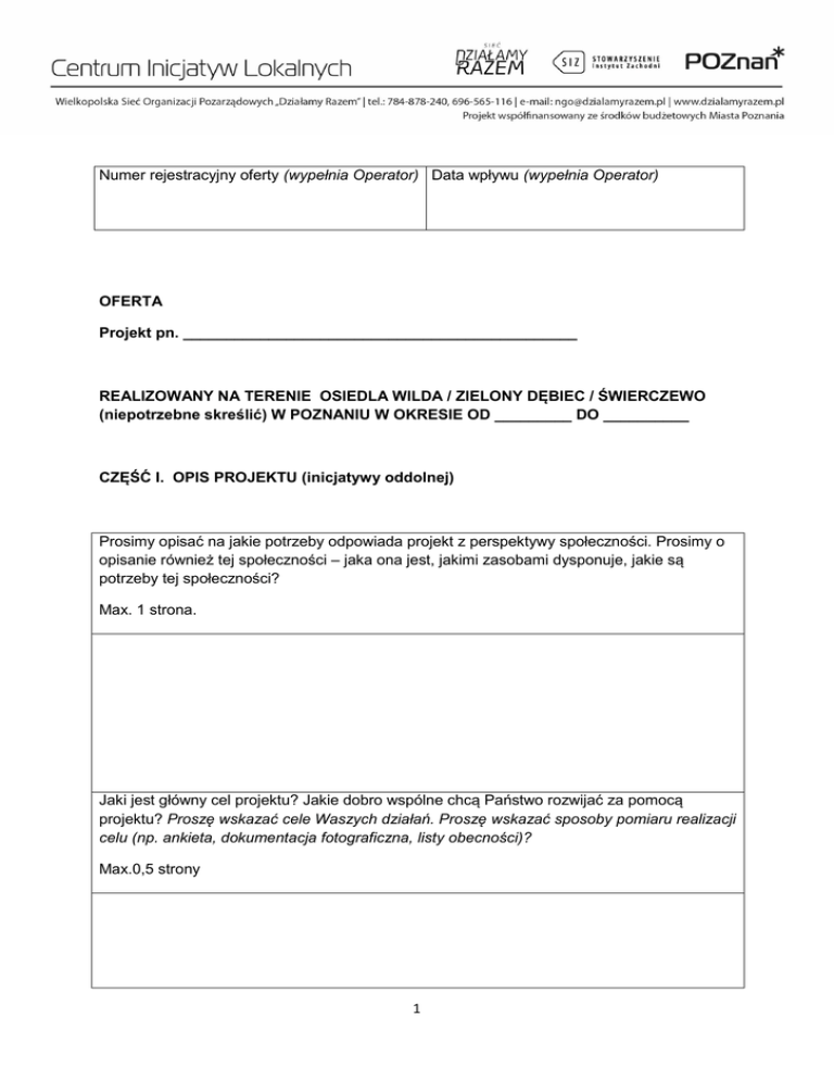 Numer rejestracyjny oferty (wypełnia Operator) Data wpływu (wypełnia Operator) OFERTA Projekt pn. ______________________________________________ REALIZOWANY NA TERENIE OSIEDLA WILDA / ZIELONY DĘBIEC / ŚWIERCZEWO (niepotrzebne skreślić) W POZNANIU W OKRESIE OD _________ DO __________ CZĘŚĆ I. OPIS PROJEKTU (inicjatywy oddolnej) Prosimy opisać na jakie potrzeby odpowiada projekt z perspektywy społeczności. Prosimy o opisanie również tej społeczności – jaka ona jest, jakimi zasobami dysponuje, jakie są potrzeby tej społeczności? Max. 1 strona. Jaki jest główny cel projektu? Jakie dobro wspólne chcą Państwo rozwijać za pomocą projektu? Proszę wskazać cele Waszych działań. Proszę wskazać sposoby pomiaru realizacji celu (np. ankieta, dokumentacja fotograficzna, listy obecności)? Max.0,5 strony 1 Opis adresatów mikrograntu. Jak będziecie ich rekrutować? Proszę opisać wielkość grupy docelowej. W jaki sposób chcecie dotrzeć do mieszkańców z informacją o projekcie? W jaki sposób mieszkańcy osiedla zostaną włączeni w realizację zadań. W jakim zakresie proponowane rozwiązania odpowiadają na potrzeby adresatów? Max. 1 strona Na czym polega Państwa projekt? Jakie działania chcą Państwo przeprowadzić w ramach realizacji projektu? Proszę opisać sposób organizacji poszczególnych działań wraz z terminami ich realizacji. Proszę wskazać osoby zaangażowane w realizację, ilość osób uczestniczących, ilość i rodzaj działań Max. 2 strony Wolontariusze w projekcie Czy projekt zakłada udział Wolontariuszy w projekcie? Ilu? W jaki sposób będą rekrutowani. Opiszcie sposób zaangażowania wolontariuszy i ich zadania. Max. 1 strona 2 Jakim dysponujecie potencjałem? Proszę wskazać na dotychczasowe doświadczenie oraz kwalifikacje osób realizujących projekt. Proszę wskazać na zasoby, które będą wykorzystywane na potrzeby realizacji projektu. Max. 1 strona Jakie działania w projekcie będą realizowane na terenie biura Centrum Inicjatyw Lokalnych ? Proszę wskazać, czy w ramach projektu planują Państwo działania realizowane w biurze Centrum Inicjatyw Lokalnych [Biuro Fundacji Aktywności Lokalnej w Poznaniu ul. 28 Czerwca 1956 r. nr 398, 61-441 Poznań]. Proszę wskazać terminy tych działań oraz wielkość/zakres. Max. 0,5 strony Jakie są planowane rezultaty projektu? (prosimy posłużyć się liczbami i przykładami). Z których rezultatów będzie korzystać jak największa liczba mieszkańców? Max. 0,5 strony 3 Jakie korzyści odniesie organizacja/grupa z realizacji projektu? Max. 0,5 strony W jakim stopniu działania opisane w projekcie wykraczają poza dotychczasową działalność realizatora? Na ile proponowane działania stanowić mogą nową ofertę dla mieszkańców, albo włączają nowe środowiska w prowadzone wcześniej działania? Max. 0,5 strony 4 Budżet projektu? Proszę poniżej wypisać w tabeli planowane wydatki wraz z podaniem odpowiedniej kwoty. Proszę w budżecie uwzględnić wartość i rodzaj (finansowy, osobowy, rzeczowy) planowanego wkładu własnego. Wnioskowana kwota mikrograntu: Wydatki w projekcie: Kwota z mikrogrant u Kwota z wkładu własnego (osobowy i finansowy) osobowy finansow y 1. 2. 3. 4. ... SUMA ŁĄCZNIE WARTOŚĆ: WKŁAD WŁASNY – min 10% wnioskowanej kwoty (do wyboru; proszę wypełnić odpowiednią rubrykę) OSOBOWY – w kwocie: …. Czym będą zajmować się wolontariusze? FINANSOWY – w kwocie:… 5 Skąd pozyskacie środki finansowe? Część II. DANE REALIZATORA MIKROGRANTU Proszę wybrać odpowiednio – Organizacja pozarządowa lub grupa nieformalna. NAZWA, OKREŚLENIE FORMY PRAWNEJ (np. stowarzyszenie, fundacja). Nazwa Realizatora (organizacja pozarządowa) Forma Prawna SKŁAD CZŁONKÓW GRUPY NIEFORMALNEJ [występujące pod patronatem Sieci Działamy Razem] –wypełniają tylko grupy nieformalne. Prosimy o wpisanie wszystkich członków grupy nieformalnej. Imię i Nazwisko Adres zamieszkania Telefon i e-mail 1.- Lider grupy 2. 3. 4. 5. DANEORGANIZACJI POZARZĄDOWEJ Dane osoby wyznaczonej do kontaktu z Operatorem – odpowiedzialnej za realizację projektu. Imię i nazwisko 6 Stanowisko Numer telefonu Adres e-mail Dane osoby wyznaczonej jako osoby nadzorującej finanse i rozliczenie projektu. Imię i nazwisko Stanowisko Numer telefonu Adres e-mail ....................................................... podpis realizatora mikrograntu W przypadku organizacji pozarządowej podpis osoby wskazanej w KRS lub upoważnionej. W przypadku upoważnienia prosimy o dołączenie go do oferty. W przypadku grupy nieformalnej podpis lidera. 7