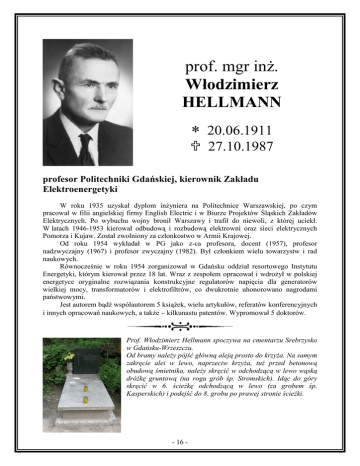 prof. mgr inż. Włodzimierz HELLMANN ∗ 20.06.1911 27.10.1987 profesor Politechniki Gdańskiej, kierownik Zakładu Elektroenergetyki W roku 1935 uzyskał dyplom inżyniera na Politechnice Warszawskiej, po czym pracował w filii angielskiej firmy English Electric i w Biurze Projektów Śląskich Zakładów Elektrycznych. Po wybuchu wojny bronił Warszawy i trafił do niewoli, z której uciekł. W latach 1946-1953 kierował odbudową i rozbudową elektrowni oraz sieci elektrycznych Pomorza i Kujaw. Został zwolniony za członkostwo w Armii Krajowej. Od roku 1954 wykładał w PG jako z-ca profesora, docent (1957), profesor nadzwyczajny (1967) i profesor zwyczajny (1982). Był członkiem wielu towarzystw i rad naukowych. Równocześnie w roku 1954 zorganizował w Gdańsku oddział resortowego Instytutu Energetyki, którym kierował przez 18 lat. Wraz z zespołem opracował i wdrożył w polskiej energetyce oryginalne rozwiązania konstrukcyjne regulatorów napięcia dla generatorów wielkiej mocy, transformatorów i elektrofiltrów, co dwukrotnie uhonorowano nagrodami państwowymi. Jest autorem bądź współautorem 5 książek, wielu artykułów, referatów konferencyjnych i innych opracowań naukowych, a także − kilkunastu patentów. Wypromował 5 doktorów. Prof. Włodzimierz Hellmann spoczywa na cmentarzu Srebrzysko w Gdańsku-Wrzeszczu. Od bramy należy pójść główną aleją prosto do krzyża. Na samym zakręcie alei w lewo, naprzeciw krzyża, tuż przed betonową obudową śmietnika, należy skręcić w odchodzącą w lewo wąską dróżkę gruntową (na rogu grób śp. Stromskich). Idąc do góry skręcić w 6. ścieżkę odchodzącą w lewo (za grobem śp. Kasperskich) i podejść do 8. grobu po prawej stronie ścieżki. - 16 -