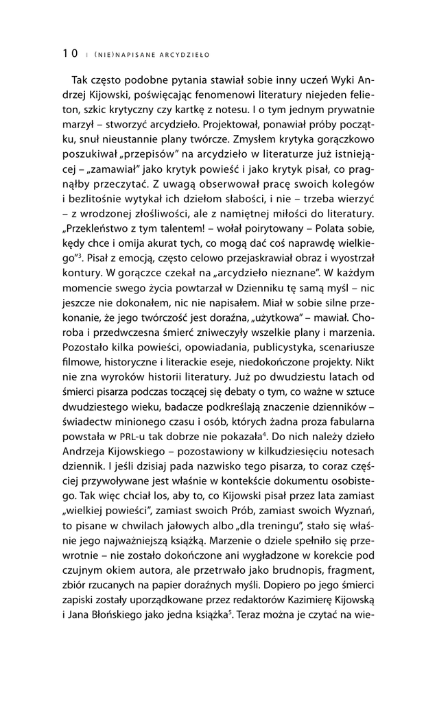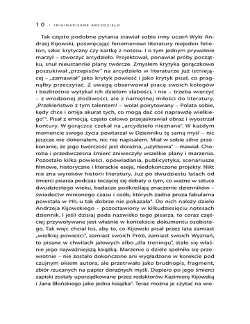 10 | (NIE)NAPISANE ARCYDZIEŁO Tak często podobne pytania stawiał sobie inny uczeń Wyki Andrzej Kijowski, poświęcając fenomenowi literatury niejeden felieton, szkic krytyczny czy kartkę z notesu. I o tym jednym prywatnie marzył – stworzyć arcydzieło. Projektował, ponawiał próby początku, snuł nieustannie plany twórcze. Zmysłem krytyka gorączkowo poszukiwał „przepisów” na arcydzieło w literaturze już istniejącej – „zamawiał” jako krytyk powieść i jako krytyk pisał, co pragnąłby przeczytać. Z uwagą obserwował pracę swoich kolegów i bezlitośnie wytykał ich dziełom słabości, i nie – trzeba wierzyć – z wrodzonej złośliwości, ale z namiętnej miłości do literatury. „Przekleństwo z tym talentem! – wołał poirytowany – Polata sobie, kędy chce i omija akurat tych, co mogą dać coś naprawdę wielkiego”3. Pisał z emocją, często celowo przejaskrawiał obraz i wyostrzał kontury. W gorączce czekał na „arcydzieło nieznane”. W każdym momencie swego życia powtarzał w Dzienniku tę samą myśl – nic jeszcze nie dokonałem, nic nie napisałem. Miał w sobie silne przekonanie, że jego twórczość jest doraźna, „użytkowa” – mawiał. Choroba i przedwczesna śmierć zniweczyły wszelkie plany i marzenia. Pozostało kilka powieści, opowiadania, publicystyka, scenariusze filmowe, historyczne i literackie eseje, niedokończone projekty. Nikt nie zna wyroków historii literatury. Już po dwudziestu latach od śmierci pisarza podczas toczącej się debaty o tym, co ważne w sztuce dwudziestego wieku, badacze podkreślają znaczenie dzienników – świadectw minionego czasu i osób, których żadna proza fabularna powstała w PRL-u tak dobrze nie pokazała4. Do nich należy dzieło Andrzeja Kijowskiego – pozostawiony w kilkudziesięciu notesach dziennik. I jeśli dzisiaj pada nazwisko tego pisarza, to coraz częściej przywoływane jest właśnie w kontekście dokumentu osobistego. Tak więc chciał los, aby to, co Kijowski pisał przez lata zamiast „wielkiej powieści”, zamiast swoich Prób, zamiast swoich Wyznań, to pisane w chwilach jałowych albo „dla treningu”, stało się właśnie jego najważniejszą książką. Marzenie o dziele spełniło się przewrotnie – nie zostało dokończone ani wygładzone w korekcie pod czujnym okiem autora, ale przetrwało jako brudnopis, fragment, zbiór rzucanych na papier doraźnych myśli. Dopiero po jego śmierci zapiski zostały uporządkowane przez redaktorów Kazimierę Kijowską i Jana Błońskiego jako jedna książka5. Teraz można je czytać na wie- WSTĘP | 11 le sposobów – jako nowoczesną opowieść o artyście, jako dzieje duszy konwertyty, jako świadectwo czasów ukazujące wycinek peerelowskiej rzeczywistości, jako tekst rozrachunkowy – z dzieciństwem, życiorysem, wyborami, jakich musiał dokonać. Wreszcie jest to opowieść o pisarzu, który pragnął napisać arcydzieło i któremu to się nie udało. A wszystkie te wątki spotykają się w jednym – autocharakterystyce autora-bohatera. Można więc Dziennik Andrzeja Kijowskiego porównać do wariacji, w której temat główny ulega urozmaiceniom, najprzeróżniejszym przekształceniom. Notatki te przybierają wciąż odmienną formę – to eseju, to intymnego wyznania, to ironicznego felietonu, to z kolei niby-dialogu, listów do żony i przyjaciół, relacji z podróży, uładzonych opowiadań, emocjonalnych apeli do siebie samego. Trzy tomy Dziennika mają swą wewnętrzną dynamikę, przypominającą trochę neurotyczną, czasem burzliwą, czasem wolniejszą melodię opartą na jednym temacie, a jej ostatecznym zwieńczeniem i zaakcentowaniem staje się ostatni tom zakończony wyodrębnionym Dziennikiem choroby. O tym właśnie jest niniejsza praca – o (nie)napisanym arcydziele, które przewrotnie ujawniło się jako Dziennik. Podejmuję tu próbę rekonstrukcji projektowanego dzieła i zamierzeń twórczych Andrzeja Kijowskiego, pokazuję, skąd czerpał inspiracje, jacy mistrzowie przyświecali jego natchnieniom, kto wpłynął na jego poglądy i twórczość. Moim zamiarem jest także ukazanie, jakie znaczenie dla twórczości tego pisarza ma prowadzony przez lata Dziennik. Wreszcie pragnę scharakteryzować bohatera samego dzieła – wydobyć z tej wariacyjnej formy wątki i problemy, jakimi żył i pod których wpływem tworzył. Przyjmuję więc w lekturze Dziennika perspektywę odbiorcy, który pisma autobiograficzne odczytuje „przez pryzmat przyzwyczajeń i nawyków wyniesionych z lektury powieści” 6. Czytam dziennik, jakby był powieścią o pewnym pisarzu i jego niespełnionych marzeniach. Znany z celności nazywania Andrzej Kijowski pisał w jednym z notesów: „Można żyć zapisując jedno zdanie dziennie, ale jakie zdanie! Można spędzić dzień na formułowaniu tego jednego zdania. Byle było dobre” (Os, 17956/ II , t. 21). Nie dziwi więc wyznanie zamieszczone w Miniaturach krytycznych, że jego ulubionym bohaterem literackim jest Grand z Dżumy Alberta Camusa – ten