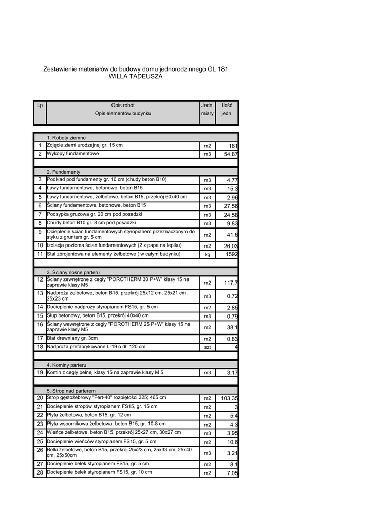 Zestawienie materiałów do budowy domu jednorodzinnego GL 181 WILLA TADEUSZA Lp Opis robót Jedn. Ilość Opis elementów budynku miary jedn. 1. Roboty ziemne 1 Zdjęcie ziemi urodzajnej gr. 15 cm m2 2 Wykopy fundamentowe m3 181 54,87 3 Podkład pod fundamenty gr. 10 cm (chudy beton B10) m3 4,77 4 Ławy fundamentowe, betonowe, beton B15 m3 15,3 5 Ławy fundamentowe, żelbetowe, beton B15, przekrój 60x40 cm m3 2,96 6 Ściany fundamentowe, betonowe, beton B15 m3 27,56 7 Podsypka gruzowa gr. 20 cm pod posadzki m3 24,58 8 Chudy beton B10 gr. 8 cm pod posadzki m3 9,83 m2 41,6 10 Izolacja pozioma ścian fundamentowych (2 x papa na lepiku) m2 11 Stal zbrojeniowa na elementy żelbetowe ( w całym budynku) kg 26,03 1592 m2 117,7 m3 0,72 14 Docieplenie nadproży styropianem FS15, gr. 5 cm m2 2,85 15 Słup betonowy, beton B15, przekrój 40x40 cm m3 0,79 zaprawie klasy M5 m2 38,1 17 Blat drewniany gr. 3cm m2 18 Nadproża prefabrykowane L-19 o dł. 120 cm szt 0,83 4 m3 3,17 20 Strop gęstożebrowy "Fert-40" rozpiętości 325; 465 cm m2 103,35 21 Docieplenie stropów styropianem FS15, gr. 15 cm m2 3 22 Płyta żelbetowa, beton B15, gr. 12 cm m2 5,4 23 Płyta wspornikowa żelbetowa, beton B15, gr. 10-8 cm m2 4,3 24 Wieńce żelbetowe, beton B15, przekrój 25x27 cm, 30x27 cm m3 3,95 25 Docieplenie wieńców styropianem FS15, gr. 5 cm m2 10,6 m3 3,21 2. Fundamenty 9 Ocieplenie ścian fundamentowych styropianem przeznaczonym do styku z gruntem gr. 5 cm 3. Ściany nośne parteru 12 Ściany zewnętrzne z cegły "POROTHERM 30 P+W" klasy 15 na zaprawie klasy M5 13 Nadproża żelbetowe, beton B15, przekrój 25x12 cm, 25x21 cm, 25x23 cm 16 Ściany wewnętrzne z cegły "POROTHERM 25 P+W" klasy 15 na 4. Kominy parteru 19 Komin z cegły pełnej klasy 15 na zaprawie klasy M 5 5. Strop nad parterem 26 Belki żelbetowe, beton B15, przekrój 25x23 cm, 25x33 cm, 25x40 cm, 25x50cm 27 Docieplenie belek styropianem FS15, gr. 5 cm m2 8,1 28 Docieplenie belek styropianem FS15, gr. 10 cm m2 7,05 29 Schody płytowe, żelbetowe, beton B15, gr. 12 cm m2 4,25 m2 38,55 6. Ściany nośne poddasza 30 Ściany zewnętrzne z cegły "POROTHERM 30 P+W" klasy 15 na zaprawie klasy M5 31 Nadproża łukowe, ceglane, przekrój 25x12 cm m3 0,1 32 Docieplenie nadproża styropianem FS15, gr. 5 cm m2 0,36 33 Wieńce opaskowe żelbetowe, beton B15, przekrój 25x25 cm m3 3,5 34 Docieplenie wieńców styropianem FS15, gr. 5 cm m2 13,98 35 Słupki kotwiące żelbetowe, beton B15, przekrój 25x25 cm m3 36 Docieplenie słupków kotwiących styropianem FS15, gr. 5 cm m2 0,78 2,5 m3 3,6 m3 1,49 m3 0,2 40 Drewno konstrukcyjne więźby klasy C30 m3 41 Konstrukcja dachu ( w rozwinięciu) m2 14,86 283,4 42 Krycie dachówką m2 283,4 43 Folia wiatroizolacyjna m2 283,4 44 Rynny f 100 mb 6,4 45 Rynny f 125 mb 55 46 Rury spustowe f 100 mb 14,7 47 Wyłaz dachowy o wymiarach min. 80 x 80 cm szt 1 7. Kominy poddasza 37 Komin z cegły pełnej klasy 15 na zaprawie klasy M5 38 Komin z cegły klinkierowej klasy 15 na zaprawie klasy M5 ( nad dachem) 39 Nakrywy betonowe kominów, beton B15 8. Więźba 9. Dach 48 Okna połaciowe o wymiarach ościeżnicy 78x140 cm szt 10 49 Podbitka drewniana, heblowana gr. 2 cm m2 50 Podłoga drewniana na jętkach, gr. 3, 2 cm m2 58,8 31,98 m2 48,4 szt 5 53 Izolacja pozioma przeciwwilgociowa (2 x papa na lepiku) m2 122,89 54 Wełna mineralna "STROPROCK" , gr. 10 cm m2 55 Wylewka betonowa, beton B15, gr. 6, 5 cm, zatarta na gładko m3 122,15 7,94 m2 66 szt 5 58 Styropian FS 20 gr. 3 cm m2 59 Wylewka betonowa, beton B15, gr. 3, 5 cm, zatarta na gładko m3 111,83 3,91 10. Ściany działowe parteru 51 Ściana gr. 12 cm z cegły pełnej klasy 10 na zaprawie klasy M2 52 Nadproża prefabrykowane L-19 o dł. 120 cm 11. Podłoga na parterze 12. Ściany działowe poddasza 56 Ściana gr. 12 cm z cegły dziurawki klasy 5 na zaprawie klasy M2 57 Nadproża prefabrykowane L-19 o dł. 120 cm 13. Podłoga na poddaszu 14. Roboty wykończeniowe Tynki 60 Tynk cementowo-wapienny na ścianach od wewnątrz m2 510 61 Tynk cementowo-wapienny na słupie od zewnątrz m2 14 62 Tynk cienkowarstwowy m2 14 63 Tynk cementowo-wapienny na sufitach m2 106,33 m2 200,2 m2 16,72 Docieplenie ścian zewnętrznych 64 Ocieplenie ścian zewnętrznych wełną mineralną "FASROCK-L", gr. 10 cm 65 Ocieplenie cokołu zewnętrznego styropianem przeznaczonym do styku z gruntem gr. 5 cm Sufit podwieszany + skosy poddasza 66 Wełna mineralna "ROCKMIN" gr. 18 cm m2 9,26 67 Wełna mineralna "ROCKMIN" gr. 12 cm m2 136,68 68 Wełna mineralna "ROCKMIN" gr. 5 cm m2 112,36 m2 127,03 70 Posadzka z płytek ceramicznych m2 65,93 71 Posadzka z paneli podłogowych m2 168,06 72 Trepy dębowe na schodach m2 4,25 73 Styropian FS 15 gr. 2 cm m2 1,48 74 Izolacja pozioma przeciwwilgociowa (2 x papa na lepiku) m2 4,29 75 Styropian FS 20 gr. 15 cm m2 4,29 76 Wylewka betonowa, beton B15, gr. 4, 5 cm, zatarta na gładko m3 0,19 77 Posadzka z płytek gresowych m2 4,2 78 Balustrada na schodach wysokości 90 cm mb 79 Balustrada na tarasie wysokości 100 cm mb 4,4 5 80 Okna o wymiarach ościeżnicy 58x55, 5 cm szt 5 81 Okna o wymiarach ościeżnicy 148x145, 5 cm szt 3 82 Zestaw okienny o wysokości ościeżnicy 145, 5 cm szt 1 83 Drzwi wewnętrzne pokojowe o wymiarach ościeżnicy 88x205 cm szt 6 84 Drzwi wewnętrzne pokojowe o wymiarach ościeżnicy 98x205 cm szt 2 85 Drzwi wewnętrzne łazienkowe o wymiarach ościeżnicy 88x205 cm szt 3 szt 1 87 Drzwi zewnętrzne o wymiarach ościeżnicy 96, 5x222 cm szt 1 88 Drzwi balkonowe o wymiarach ościeżnicy 156, 5x236 cm szt 1 89 Drzwi balkonowe, łukowe o wymiarach otworu 180x230 cm szt 1 szt 1 91 Wyłaz strychowy o wymiarach 70x80 cm szt 1 92 Parapety zewnętrzne mb 93 Parapety wewnętrzne mb 13,4 13,4 94 Schody zewnętrzne m2 8,02 95 Kostka brukowa gr. 6 cm m2 4,92 69 Płyta gipsowo-włóknowa FERMACELL na ruszcie stalowym gr. 1, 0 cm Posadzki Taras Balustrady 15. Okna i drzwi 86 Drzwi wewnętrzne o odporności ogniowej 0, 5 h o wymiarach ościeżnicy 88x205 cm 90