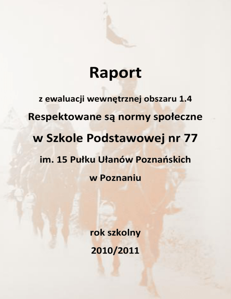 Raport z ewaluacji wewnętrznej obszaru 1.4 Respektowane są normy społeczne w Szkole Podstawowej nr 77 im. 15 Pułku Ułanów Poznańskich w Poznaniu rok szkolny 2010/2011 Przebieg ewaluacji Prezentowany raport jest rezultatem ewaluacji wewnętrznej przeprowadzonej w Szkole Podstawowej nr 77 w Poznaniu przez zespół ds. ewaluacji wewnętrznej powołany na podstawie Rozporządzenia Ministra Edukacji Narodowej z dnia 7 października 2009 w sprawie nadzoru pedagogicznego, uchwałą Rady Pedagogicznej SP 77 w Poznaniu Zadaniem zespołu było przeprowadzenie ewaluacji wewnętrznej obszaru „1.4 Respektowane są normy społeczne”, która polegała na zaplanowanym i podporządkowanym pewnym rygorom metodologicznym zbieraniu oraz przetwarzaniu informacji o warunkach, przebiegu i skuteczności działań na terenie szkoły.. W trakcie badania zbierano informacje pochodzące z wielu źródeł: ankieta dla uczniów, ankieta dla nauczycieli, ankieta dla rodziców, wywiad z pedagogiem, obserwacja, wywiad z członkami samorządu uczniowskiego, wywiad z opiekunem samorządu uczniowskiego oraz analiza dokumentów. Dzięki zastosowaniu różnorodnych metod badawczych wyniki ewaluacji wewnętrznej charakteryzują się wysokim stopniem wiarygodności, osoby przeprowadzające badania, mimo że są pracownikami placówki, starały się zachować jak największy obiektywizm. Badanie zostało zrealizowane w dniach 24.01.2011 – 12.05.2011 przez zespół ds. ewaluacji wewnętrznej w składzie: 1. Ewa Garczarek – nauczyciel j. polskiego - lider zespołu 2. Ewa Miedzińska - nauczyciel nauczania wczesnoszkolnego - lider zespołu 3. Izabela Czyż - nauczyciel matematyki – członek zespołu 4. Violetta Grześkowiak – nauczyciel nauczania wczesnoszkolnego - – członek zespołu W badaniu szukano odpowiedzi na 8 pytań kluczowych: 1. Czy uczniowie czują się w szkole bezpiecznie? 2. Czy uczniowie znają zasady bezpiecznego zachowania się w szkole? 3. Czy w szkole analizuje się zachowania uczniów? 4. Czy w szkole podejmuje się działania eliminujące zagrożenia? 5. Czy uczniowie zachowują się zgodnie z przyjętymi normami? 6. W jaki sposób podejmowane są działania wychowawcze mające na celu eliminowanie zagrożeń? 7. W jaki sposób szkoła wzmacnia pozytywne zachowania uczniów? 8. Czy uczniowie współpracują z nauczycielami w zakresie przestrzegania norm społecznych? W badaniu wzięło udział 156 uczniów z klas III – VI, 90 rodziców oraz 20 nauczycieli i pedagog szkolny. Wnioski i rekomendacje Analiza zebranych z wielu źródeł informacji pozwala stwierdzić, że uczniowie czują się w szkole bezpiecznie. Ponad 90 % ankietowanych uczniów czuje się na lekcjach bezpiecznie, około 80 % na przerwach oraz około 85 % na boisku szkolnym. Niewielki procent (zwłaszcza uczniów klas trzecich) wskazał, iż obawia się starszych uczniów i gimnazjalistów przechodzących przez boisko szkolne. Rodzice również uważają szkołę za miejsce bezpieczne (86 rodziców na 90 ankietowanych). Jedna trzecia ankietowanych uczniów nikogo się nie obawia, a 50 % ankietowanych stwierdziło, że wszędzie w szkole czuje się bezpiecznie. Jako mało bezpieczne miejsca uczniowie wskazywali najczęściej korytarze szkolne, boisko i toalety. W celu zwiększenia poczucia bezpieczeństwa uczniów na korytarzach i w toaletach należałoby zwiększyć zaangażowanie nauczycieli w pełnienie dyżurów oraz prowadzić systematyczną pracę wychowawczą mającą na celu wykształcenie właściwego modelu zachowania uczniów podczas przerw. W sprawie bezpieczeństwa na boisku szkolnym należałoby nawiązać ścisłą współpracę z dyrekcją Gimnazjum 51 w celu wprowadzenia bezwzględnego zakazu przechodzenia gimnazjalistów przez boisko naszej szkoły zwłaszcza w czasie przerw. 6 % ankietowanych uczniów stwierdziło, iż klika razy na terenie szkoły było obiektem agresji fizycznej, natomiast 36 % ankietowanych wskazało, że kilkakrotnie doznało agresji słownej. Agresja słowna (wulgarne słownictwo, wyzwiska) jest zjawiskiem zdecydowanie częstszym od agresji fizycznej. Szkoła stwarza uczniom warunki do respektowania norm społecznych i wszyscy uczniowie znają zasady właściwego zachowania w szkole. Kryteria oceniania zachowania są dla uczniów zrozumiałe. Osobami, które informują uczniów o właściwym zachowaniu, są przede wszystkim: wychowawca klasy, rodzice, inni nauczyciele, dyrektor szkoły i pedagog. W szkole istnieją różnorodne formy diagnozowania zachowania uczniów, między innymi zeszyty spostrzeżeń o uczniach w klasach IV – VI, w klasach młodszych wybór ucznia miesiąca, obserwacja pedagoga szkoły, wymiana spostrzeżeń pomiędzy nauczycielami, punktowy system oceniania zachowania (większość ankietowanych: uczniów, rodziców i nauczycieli uważa, że ma on wpływ na respektowanie norm). Szkoła podejmuje różnorodne działania mające na celu eliminację zachowań niepożądanych, są to: pogadanki na lekcjach, apele robocze, rozmowy z pedagogiem, zajęcia z psychologiem, spotkania z policjantem, spotkania interwencyjne (rodzice, dzieci, nauczyciele). Z problemami uczniowie najczęściej zwracają się do: wychowawcy, innych nauczycieli, dyrektora i pedagoga oraz psychologa. 50 % uczniów uważa, że sposób reagowania tych osób spełnił ich oczekiwania, podobnie uważają rodzice (60 % ankietowanych). Połowa ankietowanych uczniów potwierdziła, że analizuje z nauczycielami przyczyny swoich sukcesów/porażek szklonych. W celu poprawy jakości kontaktów uczeń – nauczyciel (wzmocnienie więzi) należałoby częściej wspólnie z dzieckiem i jego rodzicami analizować problemy/sukcesy dydaktyczne i wychowawcze. Rozważyć możliwość stworzenia przez psychologa warsztatów dla uczniów słabo radzących sobie z problemami dydaktycznymi lub wychowawczymi. Większość uczniów (67%) uważa, że ich koledzy zachowują się zgodnie z przyjętymi normami. Potwier