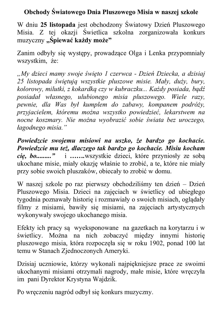 Obchody Światowego Dnia Pluszowego Misia w naszej szkole W dniu 25 listopada jest obchodzony Światowy Dzień Pluszowego Misia. Z tej okazji Świetlica szkolna zorganizowała konkurs muzyczny „Śpiewać każdy może” Zanim odbyły się występy, prowadzące Olga i Lenka przypomniały wszystkim, że: „My dzieci mamy swoje święto 1 czerwca - Dzień Dziecka, a dzisiaj 25 listopada świętują wszystkie pluszowe misie. Mały, duży, bury, kolorowy, milutki, z kokardką czy w kubraczku... Każdy posiada, bądź posiadał własnego, ulubionego misia pluszowego. Wiele razy, pewnie, dla Was był kumplem do zabawy, kompanem podróży, przyjacielem, któremu można wszystko powiedzieć, lekarstwem na nocne koszmary. Nie można wyobrazić sobie świata bez uroczego, łagodnego misia.” Powiedzcie swojemu misiowi na uszko, że bardzo go kochacie. Powiedzcie mu też, dlaczego tak bardzo go kochacie. Misiu kocham cię, bo.........” i …….wszystkie dzieci, które przyniosły ze sobą ukochane misie, miały okazję właśnie to zrobić, a te, które nie miały przy sobie swoich pluszaków, obiecały to zrobić w domu. W naszej szkole po raz pierwszy obchodziliśmy ten dzień – Dzień Pluszowego Misia. Dzieci na zajęciach w świetlicy od ubiegłego tygodnia poznawały historię i rozmawiały o swoich misiach, oglądały filmy z misiami, bawiły się misiami, na zajęciach artystycznych wykonywały swojego ukochanego misia. Efekty ich pracy są wyeksponowane na gazetkach na korytarzu i w świetlicy. Można na nich zobaczyć między innymi historię pluszowego misia, która rozpoczęła się w roku 1902, ponad 100 lat temu w Stanach Zjednoczonych Ameryki. Dzisiaj uczniowie, którzy wykonali najpiękniejsze prace ze swoimi ukochanymi misiami otrzymali nagrody, małe misie, które wręczyła im pani Dyrektor Krystyna Wajdzik. Po wręczeniu nagród odbył się konkurs muzyczny. Na widowni zasiedli uczniowie kibicujący swoim klasowym koleżankom i kolegom oraz rodzice, rodzeństwo i inni członkowie rodzin, którzy razem z artystami przeżywali ich występy. Wszyscy wspaniale się bawili, o czym świadczył wspólny śpiew widowni w trakcie występów wykonawców. Mieliśmy okazję obejrzeć 13 występów 20 wykonawców. Śpiewających artystów oceniało Jury w składzie: Przewodnicząca: Alicja Matusik Członkowie: Danuta Matejko Bożena Leśniakiewicz Marta Cholewa – Janoszek – przedstawicielka rodziców oraz Szymon Krupa – przedstawiciel Samorządu Uczniowskiego, które brało pod uwagę: dobór repertuaru, walory głosowe, czystość brzmienia, intonację i dykcję, muzykalność, własną interpretację, ogólny wyraz artystyczny. Wyniki konkursu „Śpiewać każdy może”: Kategoria kl. 0 I miejsce – Zespół z kl.0 w składzie: Wiktoria Janoszek, Wiktoria Dędys, Julia Lewek, Lena Gracjasz, Amelia Fornal, Maja Łuczak Kategoria kl. I – IV Szkoły Podstawowej I miejsce – Anna Fortuna z kl. 3b II miejsce – Dominika Mentel z kl. 3b III miejsce – Julia Wysmołek i Zuzanna Janeczek z kl. 2c Wyróżnienie – Julia Moskała z kl. 1a Emilia Trojanowska z kl. 1b Lena Kosman i Olga Gałosz z kl. 4b Kategoria Gimnazjum I miejsce – Barłomiej Kosała z kl. I C Wyróżnienie – Magdalena Pasierbek z kl. III A Nagrodę publiczności otrzymali Dominika Mentel i Bartek Kosała. W trakcie ich występów widownia śpiewała razem z nimi. Oprawą muzyczną i nagłośnieniem zajmowali się uczniowie z kl. II B Szymon Żmija i Łukasz Gołuszka. Konferansjerkami były, debiutujące w tej roli, Olga Gałosz i Lena Kosman z kl. 4b. Wszystkim zwycięzcom serdecznie gratulujemy i życzymy dalszych sukcesów. Dziękujemy za udział wszystkim wykonawcom, widzom oraz jurorom za ich pracę. Nagrody i dyplomy dla laureatów zostaną wręczone w grudniu, o czym wszyscy zostaną powiadomieni. Zdjęcia z konkursu można obejrzeć na stronie internetowej świetlicy w naszej galerii. Link do galerii http://swietlica.edl.pl/galeria.html