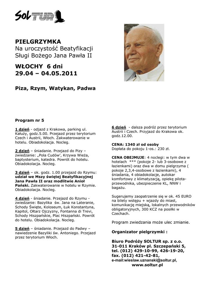 PIELGRZYMKA Na uroczystość Beatyfikacji Sługi Bożego Jana Pawła II WŁOCHY 6 dni 29.04 – 04.05.2011 Piza, Rzym, Watykan, Padwa Program nr 5 1 dzień - odjazd z Krakowa, parking ul. Kałuży, godz.5.00. Przejazd przez terytorium Czech i Austrii, Włoch. Zakwaterowanie w hotelu. Obiadokolacja. Nocleg. 2 dzień – śniadanie. Przejazd do Pizy – zwiedzanie: „Pola Cudów’, Krzywa Wieża, baptysterium, katedra. Powrót do hotelu. Obiadokolacja. Nocleg. 3 dzień – ok. godz. 1.00 przejazd do Rzymu: udział we Mszy świętej Beatyfikacyjnej Jana Pawła II oraz modlitwie Anioł Pański. Zakwaterowanie w hotelu w Rzymie. Obiadokolacja. Nocleg. 4 dzień - śniadanie. Przejazd do Rzymu zwiedzanie: Bazylika św. Jana na Lateranie, Schody Święte, Koloseum, Łuk Konstantyna, Kapitol, Ołtarz Ojczyzny, Fontanna di Trevi, Schody Hiszpańskie, Plac Hiszpański. Powrót do hotelu. Obiadokolacja. Nocleg. 5 dzień – śniadanie. Przejazd do Padwy – nawiedzenie Bazyliki św. Antoniego. Przejazd przez terytorium Włoch. 6 dzień - dalsza podróż przez terytorium Austrii i Czech. Przyjazd do Krakowa ok. godz.12.00. CENA: 1340 zł od osoby Dopłata do pokoju 1-os.: 230 zł. CENA OBEJMUJE: 4 noclegi: w tym dwa w hotelach *** (pokoje 2- lub 3-osobowe z łazienkami) oraz dwa w domu pielgrzyma ( pokoje 2,3,4-osobowe z łazienkami), 4 śniadania, 4 obiadokolacje, autokar komfortowy z klimatyzacją, opiekę pilotaprzewodnika, ubezpieczenie KL, NNW i bagażu. Sugerujemy zaopatrzenie się w ok. 45 EURO na bilety wstępu + wjazdy do miast, komunikację miejską, lokalnych przewodników obligatoryjnych, 300 KCZ na posiłki w Czechach. Program zwiedzania może ulec zmianie. Organizator pielgrzymki : Biuro Podróży SOLTUR sp. z o.o. 31-011 Kraków pl. Szczepański 5, tel. (012) 429-10-99, 426-19-20, fax. (012) 421-42-81, e-mail:[email protected], www.soltur.pl