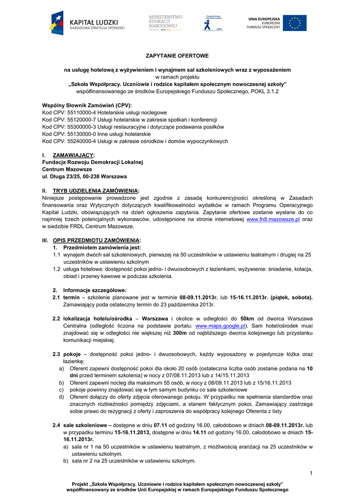 ZAPYTANIE OFERTOWE na usługę hotelową z wyżywieniem i wynajmem sal szkoleniowych wraz z wyposażeniem w ramach projektu „Szkoła Współpracy. Uczniowie i rodzice kapitałem społecznym nowoczesnej szkoły” współfinansowanego ze środków Europejskiego Funduszu Społecznego, POKL 3.1.2 Wspólny Słownik Zamówień (CPV): Kod CPV: 55110000-4 Hotelarskie usługi noclegowe Kod CPV: 55120000-7 Usługi hotelarskie w zakresie spotkań i konferencji Kod CPV: 55300000-3 Usługi restauracyjne i dotyczące podawania posiłków Kod CPV: 55130000-0 Inne usługi hotelarskie Kod CPV: 55240000-4 Usługi w zakresie ośrodków i domów wypoczynkowych I. ZAMAWIAJĄCY: Fundacja Rozwoju Demokracji Lokalnej Centrum Mazowsze ul. Długa 23/25, 00-238 Warszawa II. TRYB UDZIELENIA ZAMÓWIENIA: Niniejsze postępowanie prowadzone jest zgodnie z zasadą konkurencyjności określoną w Zasadach finansowania oraz Wytycznych dotyczących kwalifikowalności wydatków w ramach Programu Operacyjnego Kapitał Ludzki, obowiązujących na dzień ogłoszenia zapytania. Zapytanie ofertowe zostanie wysłane do co najmniej trzech potencjalnych wykonawców, udostępnione na stronie internetowej www.frdl.mazowsze.pl oraz w siedzibie FRDL Centrum Mazowsze. III. OPIS PRZEDMIOTU ZAMÓWIENIA: 1. Przedmiotem zamówienia jest: 1.1 wynajem dwóch sal szkoleniowych, pierwszej na 50 uczestników w ustawieniu teatralnym i drugiej na 25 uczestników w ustawieniu szkolnym 1.2 usługa hotelowa: dostępność pokoi jedno- i dwuosobowych z łazienkami, wyżywienie: śniadanie, kolacja, obiad i przerwy kawowe w podczas szkolenia. 2. Informacje szczegółowe: 2.1 termin – szkolenie planowane jest w terminie 08-09.11.2013r. lub 15-16.11.2013r. (piątek, sobota). Zamawiający poda ostateczny termin do 23 października 2013r. 2.2 lokalizacja hotelu/ośrodka – Warszawa i okolice w odległości do 50km od dworca Warszawa Centralna (odległość liczona na podstawie portalu: www.maps.google.pl). Sam hotel/ośrodek musi znajdować się w odległości nie większej niż 300m od najbliższego dworca kolejowego lub przystanku komunikacji miejskiej. 2.3 pokoje – dostępność pokoi jedno- i dwuosobowych, każdy wyposażony w pojedyncze łóżka oraz łazienkę: a) Oferent zapewni dostępność pokoi dla około 20 osób (ostateczna liczba osób zostanie podana na 10 dni przed terminem szkolenia) w nocy z 07/08.11.2013 lub z 14/15.11.2013 b) Oferent zapewni nocleg dla maksimum 55 osób, w nocy z 08/09.11.2013 lub z 15/16.11.2013 c) pokoje powinny znajdować się w tym samym budynku co sale szkoleniowe d) Oferent dołączy do oferty zdjęcia oferowanego pokoju. W przypadku nie spełnienia standardów oraz znacznych rozbieżności pomiędzy zdjęciami, a stanem faktycznym pokoi, Zamawiający zastrzega sobie prawo do rezygnacji z oferty i zaproszenia do współpracy kolejnego Oferenta z listy 2.4 sale szkoleniowe – dostępne w dniu 07.11 od godziny 16.00, całodobowo w dniach 08-09.11.2013r. lub w przypadku terminu 15-16.11.2013, dostępne w dniu 14.11 od godziny 16.00, całodobowo w dniach 1516.11.2013r. a) sala nr 1 na 50 uczestników w ustawieniu teatralnym, z możliwością aranżacji na 25 uczestników w ustawieniu szkolnym. b) sala nr 2 na 25 uczestników w ustawieniu szkolnym. 1 Projekt „Szkoła Współpracy. Uczniowie i rodzice kapitałem społecznym nowoczesnej szkoły” współfinansowany ze środków Unii Europejskiej w ramach Europejskiego Funduszu Społecznego c) sale powinny spełniać wszystkie wymagania bezpieczeństwa i higieny pracy stawiane pomieszczeniom, w których organizowane są szkolenia d) sale muszą mieć dodatkowy stolik dla prowadzących (2 prowadzących w każdej sali) e) przed salą Oferent udostępni dodatkowy stolik dla „recepcji” szkolenia f) sale muszą być wyposażone w sprzęt multimedialny niezbędny do przeprowadzenia szkolenia: laptop, projektor multimedialny, ekran lub biała (bardzo jasna) ściana, łącze internetowe (stałe, wi-fi), inne dodatkowe elementy: flipchart, flamastry; dostęp do ksero i faxu w budynku (w sytuacjach awaryjnych). g) sale powinny znajdować się w tym samym budynku co restauracja (wyżywienie). h) Oferent dołączy do oferty zdjęcia oferowanych sal oraz miejsca gdzie będą świadczone usługi cateringowe. W przypadku nie spełnienia standardów (czyste ściany, czysta podłoga/wykładzina, pomieszczenie z oknami, nieuszkodzone meble, klimatyzacja, winda w przypadku sal na piętrze) oraz znacznych rozbieżności pomiędzy zdjęciami, a stanem faktycznym sal, Zamawiający zastrzega sobie prawo do rezygnacji z oferty i zaproszenia do współpracy kolejnego Oferenta z listy. 2.5 wyżywienie a) 7.11.2013 lub 14.11.2013 - kolacja dla około 20 osób; ostateczna liczba osób podana na 10 dni przed terminem szkolenia b) 8.11.2013 lub 15.11.2013 – śniadanie dla około 20 osób; ostateczna liczba osób podana na 10 dni przed terminem szkolenia c) 8.11.2013 lub 15.11.2013 - obiad, kolacja dla 55 osób d) 9.11.2013 lub 16.11.2013 – śniadanie i obiad dla 55 osób e) Oferent zaproponuje 3 przykładowe MENU, z opcją MENU wegetariańskiego w tej samej cenie (liczbę wegetarian Zamawiający poda najpóźniej na 10 dni przed terminem szkolenia) 2.6 przerwa kawowa w dniach 08 i 09.11.2013r. lub 15 i 16.11.2013r., całodniowa, uzupełniana w razie potrzeby: a) kawa, herbata, ciasteczka lub ciasto, wody gazowana, niegazowana, soki owocowe (nie napoje), mleko (nie w proszku) lub śmietanka do kawy. b) przerwa kawowa powinna być przygotowana w pobliżu sal szkoleniowych, co najmniej na pół godziny przed jego rozpoczęciem szkolenia. 3. Pozostałe warunki 3.1 możliwość przyklejenia lub umieszczenia w inny sposób plakatu i programu szkolenia przy drzwiach wejściowych (np. na stojakach – zapewnia oferent), na drodze do sal i w salach. 3.2 możliwości spędzania czasu wolnego, poza godzinami szkoleniowymi w budynku ośrodka lub na jego terenie, w innych pomieszczeniach, prze