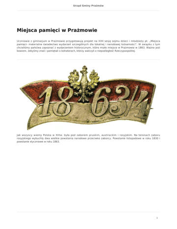 Urząd Gminy Prażmów Miejsca pamięci w Prażmowie Uczniowie z gimnazjum w Prażmowie przygotowują projekt na XXII sesję sejmu dzieci i młodzieży pt. „Miejsca pamięci- materialne świadectwo wydarzeń szczególnych dla lokalnej i narodowej tożsamości”. W związku z tym chcieliśmy państwa zapoznać z wydarzeniem historycznym, które miało miejsce w Prażmowie w 1863. Ważne jest bowiem, żebyśmy znali i pamiętali o bohaterach, którzy walczyli o niepodległość Rzeczypospolitej. Jak wszyscy wiemy Polska w XIXw. była pod zaborem pruskim, austriackim i rosyjskim. Na terenach zaboru rosyjskiego wybuchły dwa wielkie powstania narodowe przeciwko zaborcy. Powstanie listopadowe w roku 1830 i powstanie styczniowe w roku 1863. 1 Urząd Gminy Prażmów Ważnym wydarzeniem w historii Prażmowa było stoczenie przez powstańców styczniowych bitwy odwrotowej z żołnierzami rosyjskimi. Miała ona miejsce 5 sierpnia 1863 r. . Powstańcami dowodził Władysław Grabowski, zaś Rosjanami podpułkownik Kulgaczew. 10 lipca w bitwie pod Ossą, kawaleria Grabowskiego wsparła 1350 - osobową kompanię majora Ludwika Żychlińskiego. Przyczyniło się to do jej zwycięstwa. Po tym starciu oddział wrócił w okolice Białobrzegów, by 18 lipca ponownie bez powodzenia zaatakować garnizon rosyjski. Aktywna działalność bojowa Grabowskiego sprowokowała ostatecznie Rosjan do działania. Znaczne siły rosyjskie zmusiły w końcu powstańców do marszu w kierunku Warszawy. Wyczerpani kilkudniowym odwrotem żołnierze zatrzymali się w Prażmowie. Był 5 sierpnia 1863 r. Gościny udzieliła im we dworze matka zarządcy majątku prażmowskiego Bronisława Ryxa Józefa ze Stawiarskich. Na odpoczywających Polaków niespodziewanie uderzyło zgrupowanie podpułkownika Kulgaczewa, stanowiące część formacji generała Meller-Zakomelskiego. By ich osaczyć, Kulgaczew podzielił swoje siły na trzy części. Rosjanie zaatakowali z południa (od strony Gościeńczyc), wschodu (od strony Woli Prażmowskiej ) oraz północy (od strony Łosia). Powstańcy, wśród których było 215 kawalerzystów i 70 piechurów, wycofali się na zachód w stronę Racibór i Wilczej Wólki, czyli w jedynym nie zablokowanym prze wojska rosyjskie kierunku. W wyniku starcia zginęło 7 Polaków. Straty rosyjskie były zbliżone. Pomimo zabitych dużym sukcesem Grabowskiego było to, że nie dopuścił do rozbicia oddziału, który przemieszczał się teraz w kierunku Grodziska Mazowieckiego. Następnego dnia Rosjanie doścignęli powstańców w rejonie Osuchowa . 7 sierpnia żołnierze Kulgaczewa zaskoczyli ich w czasie odpoczynku w Milanówku. Dowódca opanował jednak sytuację i większość oddziału wycofała się do Zaborowa, a stamtąd do Puszczy Kampinoskiej. Nie widząc szans na dalsze utrzymanie w całości tak dużej formacji zbrojnej i obawiając się otoczenia przez siły przeciwnika Władysław Grabowski wydał rozkaz o jej rozwiązaniu. Sam próbował przedostać się do Prus, ale tuż po przekroczeniu granicy został aresztowany. Niedobitki oddziału Grabowskiego wzięły udział w formacji Ludwika Żychlińskiego w bitwie pod Żelazną. Mimo wielkich strat zadanych wojskom rosyjskim Polacy ponieśli klęskę . Ciekawostką jest fakt, że w starciu został ranny nie kto inny , jak pogromca powstańców w Prażmowie podpułkownik Kulgaczew. Przebieg bitwy prażmowskiej opisał w swoich wspomnieniach, opierając się na relacji matki, Bronisław Ryx: „6 sierpnia (powinno być 5 sierpnia; błąd Bronisława Ryxa, powielony na współczesnym grobowcu powstańców) 1863 roku oddział liczący około 500 osób (w rzeczywistości składał się z 285 żołnierzy) pod dowództwem Grabowskiego złożony z piechoty i kawalerii, dobrze uzbrojony, ścigany był od Warki przez kilkunastotysięczny pułk Moskali pod dowództwem gen. Meller-Zakomelskiego jeżdżącego wygodnie w powozie. We dworze była tylko moja matka z siostrą Mysyrowiczową i one zastawiły gościnne stoły dla żołnierzy Grabowskiego we wszystkich pokojach. Naraz pikieta stojąca za wsią i karbowy Witek Matulka umieszczony na budującej się dzwonnicy dają znać, że Moskale idą z trzech 2 Urząd Gminy Prażmów stron, od Gościeńczyc, od Łosia i od Woli. Matka zaklina Grabowskiego, aby czym prędzej uciekał, ale on powiada: „Ja wiem dobrze, że mnie gonią, ale ja się nie dam schwytać”. Moskale tymczasem wpadli na dziedziniec i podwórze, rozpoczęła się na dobre utarczka. Mama moja słysząc świst kul i brzęk tłuczących szyb zemknęła do ogrodu i skryła się w ogrodzonej kąpieli rzeczce. Nasi cofnęli się przez czwarty niezajęty przez Moskali bok, a mianowicie przez mosty i groblę za spichrzem, wiodące do Dębowego Borku. Na tej to grobli i na podwórzu zginęło 11(dokumenty parafialne mówią o 7) powstańców i tyleż żołnierzy ruskich. Reszta naszych wycofała się szczęśliwie i uszła w kierunku Racibór i Wilczej Wólki. We dworze rozlokowali się oficerowie i sołdaci i zaczęli hulać po swojemu. Widząc co się dzieje, mój zastępca, a były naczelnik powiatu p. Rafalski ubrany w mundur frakowy, zaczął ich mitygować, ale nie mogąc nic poradzić podbiegł do matki, prosząc Ją, aby wróciła do domu, bo tam wszystko „bohaterzy” potłuką i pokradną. Choć z wielką trwogą, nieśmiało, matka moja wkroczyła przez werandę do sali i widząc ucztujących woła donośnym głosem: „Precz stąd! Wynosić się!”. Oficerowie zaczynają wymawiać matce, że przyjmowała buntowników, na co Ona odpowiada, że inaczej nie mogła. Sołdaci żądają czego innego i mówią „Borynia dajtie wodki”. „Dobrze dostaniecie wódki, ale nie tu, tylko na podwórzu, a teraz wynoście się”. Sołdaci skuszeni obietnicą zabierają swoje i nie swoje manatki, jak serwety, noże, widelce, łyżki itp. i wychodzą. Poległych i obdartych prawie do naga powstańców, po odejściu wojska ruskiego złożono pr