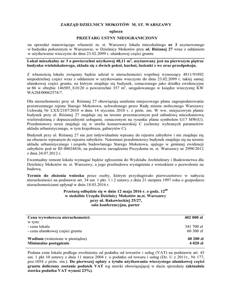 ZARZĄD DZIELNICY MOKOTÓW M. ST. WARSZAWY ogłasza PRZETARG USTNY NIEOGRANICZONY na sprzedaż stanowiącego własność m. st. Warszawy lokalu mieszkalnego nr 3 usytuowanego w budynku położonym w Warszawie, w Dzielnicy Mokotów przy ul. Różanej 27 wraz z oddaniem w użytkowanie wieczyste do dnia 23.02.2099 r. ułamkowej części gruntu Lokal mieszkalny nr 3 o powierzchni użytkowej 48,11 m2, usytuowany jest na pierwszym piętrze budynku wielolokalowego, składa się z dwóch pokoi, kuchni, łazienki z wc oraz przedpokoju. Z własnością lokalu związany będzie udział w nieruchomości wspólnej wynoszący 4811/91892 niepodzielnej części wraz z oddaniem w użytkowanie wieczyste do dnia 23.02.2099 r. takiej samej ułamkowej części gruntu, na którym znajduje się budynek, oznaczonego jako działka ewidencyjna nr 86 w obrębie 146505_8.0120 o powierzchni 357 m2, uregulowanego w księdze wieczystej KW WA2M/00062574/7. Dla nieruchomości przy ul. Różanej 27 obowiązują ustalenia miejscowego planu zagospodarowania przestrzennego rejonu Starego Mokotowa, uchwalonego przez Radę miasta stołecznego Warszawy Uchwałą Nr LXX/2187/2010 w dniu 14 stycznia 2010 r. z późn. zm. W ww. miejscowym planie budynek przy ul. Różanej 27 znajduje się na terenie przeznaczonym pod zabudowę mieszkaniową wielorodzinną z dopuszczalnymi usługami, oznaczonym na rysunku planu symbolem G17 MW(U). Przedmiotowy teren znajduje się w strefie konserwatorskiej C (ochrony wybranych parametrów układu urbanistycznego, w tym krajobrazu, gabarytów C). Budynek przy ul. Różanej 27 nie jest indywidualnie wpisany do rejestru zabytków i nie znajduje się na obszarze wpisanym do rejestru zabytków. Natomiast przedmiotowy budynek znajduje się na terenie układu urbanistycznego i zespołu budowlanego Starego Mokotowa, ujętego w gminnej ewidencji zabytków pod nr ID 00024836, na podstawie zarządzenia Prezydenta m. st. Warszawy nr 2998/2012 z dnia 24.07.2012 r. Ewentualny remont lokalu wymagać będzie zgłoszenia do Wydziału Architektury i Budownictwa dla Dzielnicy Mokotów m. st. Warszawy, a jego przebudowa wystąpienia z wnioskiem o pozwolenie na budowę. Termin do złożenia wniosku przez osoby, którym przysługiwało pierwszeństwo w nabyciu nieruchomości na podstawie art. 34 ust. 1 pkt. 1 i 2 ustawy z dnia 21 sierpnia 1997 roku o gospodarce nieruchomościami upłynął w dniu 18.03.2016 r. Przetarg odbędzie się w dniu 12 maja 2016 r. o godz. 1200 w siedzibie Urzędu Dzielnicy Mokotów m.st. Warszawy przy ul. Rakowieckiej 25/27, sala konferencyjna, parter Cena wywoławcza nieruchomości: w tym: - cena lokalu - cena ułamkowej części gruntu Wadium (wniesione w pieniądzu) Minimalne postąpienie 402 000 zł 341 700 zł 60 300 zł 40 200 zł 4 020 zł Podana cena lokalu podlega zwolnieniu od podatku od towarów i usług (VAT) na podstawie art. 43 ust. 1 pkt 10 ustawy z dnia 11 marca 2004 r. o podatku od towaru i usług (Dz. U z 2011r., Nr 177, poz.1054 z późn. zm.). Do pierwszej opłaty z tytułu użytkowania wieczystego ułamkowej części gruntu doliczony zostanie podatek VAT wg stawki obowiązującej w dacie sprzedaży (aktualnie stawka podatku VAT wynosi 23%). Cena nieruchomości osiągnięta w przetargu obejmuje cenę lokalu oraz cenę udziału w gruncie przynależnego do lokalu, która stanowi podstawę do ustalenia opłat z tytułu użytkowania wieczystego. Dla odrębnego ustalenia tych cen przyjmuje się proporcje zachodzące między nimi w cenie wywoławczej. Opłaty z tytułu użytkowania wieczystego ułamkowej części gruntu wynoszą: - pierwsza opłata – 25% ceny ułamkowej części gruntu osiągniętej w przetargu powiększona o obowiązującą stawkę podatku VAT - opłaty roczne – 1 % ceny ułamkowej części gruntu osiągniętej w przetargu powiększone o obowiązującą stawkę podatku VAT Opłaty roczne należy wnosić przez cały okres użytkowania wieczystego w terminie do dnia 31 marca każdego roku. Opłaty te mogą być aktualizowane, nie częściej niż raz na trzy lata, jeżeli wartość gruntu ulegnie zmianie. Opłaty z tytułu użytkowania wieczystego gruntu ustalane są zgodnie z przepisami ustawy z dnia 21 sierpnia 1997 r. o gospodarce nieruchomościami (Dz. U. z 2015 r., poz. 1774 z późn. zm.). W zakresie obowiązku zapłaty opłat rocznych z tytułu użytkowania wieczystego ułamkowej części gruntu w terminie do dnia 31 marca każdego roku, nabywca nieruchomości zobowiązany będzie poddać się wprost z aktu notarialnego egzekucji w trybie art. 777 § 1 pkt 5 kodeksu postępowania cywilnego. W przetargu mogą brać udział osoby fizyczne, osoby prawne lub jednostki organizacyjne nieposiadające osobowości prawnej lecz posiadające zdolność prawną, które zapoznają się z treścią informatora przetargowego, wniosą wadium i złożą zgłoszenie udziału w przetargu (zgłoszenie stanowi załącznik do informatora przetargowego). Wadium winno być wniesione na rachunek Dzielnicy Mokotów m.st. Warszawy nr 96 1030 1508 0000 0005 5002 3067, do dnia 06.05.2016 r. Za datę wniesienia wadium uważa się wpływ wymaganej kwoty na ww. rachunek. Zgłoszenie udziału w przetargu winno być złożone do dnia 06.05.2016 r. do godz. 1500, bezpośrednio w Wydziale Obrotu Nieruchomościami dla Dzielnicy przy ul. Rakowieckiej 25/27, w pokoju nr 309, III piętro. Przystępujący do przetargu obowiązani są do zapoznania się z treścią informatora przetargowego, który można nabyć w Urzędzie Dzielnicy Mokotów m.st. Warszawy przy ul. Rakowieckiej 25/27, w pokoju nr 309, III piętro (od poniedziałku do piątku w godz. 800-1600), po uprzednim wpłaceniu w kasie Urzędu Dzielnicy Mokotów m. st. Warszawy lub na rachunek Dzielnicy Mokotów m.st. Warszawy nr 40 1030 1508 0000 0005 5002 3008 kwoty w wysokości 20,00 zł. Osoba ustalona jako nabywca nieruchomości zobowiązana jest wpłacić nie później niż na 3 dni przed wyznaczonym terminem podpisania umowy ustano