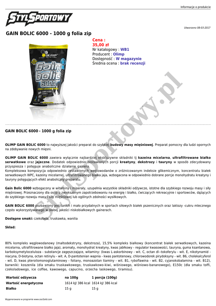 Informacje o produkcie Utworzono 08-03-2017 GAIN BOLIC 6000 - 1000 g folia zip Cena : 35,00 zł GAIN BOLIC 6000 - 1000 g folia zip or to w y. pl Nr katalogowy : WB1 Producent : Olimp Dostępność : W magazynie Średnia ocena : brak recenzji OLIMP GAIN BOLIC 6000 to najwyższej jakości preparat do szybkiej budowy masy mięśniowej. Preparat pomocny dla ludzi opornych na zdobywanie nowych mięsni. lS p OLIMP GAIN BOLIC 6000 zawiera wyłącznie najbardziej ekskluzywne składniki tj kazeina micelarna, ultrafiltrowane białko serwatkowe oraz jajeczne. Dodatek odpowiednio zestawionych porcji kreatyny, dekstrozy i tauryny w sposób zdecydowany przyspiesza i potęguje anaboliczne działanie gainera. Kompleksowa kompozycja odpowiednio zestawionych węglowodanów o zróżnicowanym indeksie glikemicznym, koncentratu białek serwatkowych WPC, kazeiny micelarnej, ultrafiltrowanego białka jaja, wzbogacona w odpowiednio dobrane porcje monohydratu kreatyny i tauryny potęgujących efekt anaboliczny preparatu. St y Gain Bolic 6000 wzbogacony w witaminy i minerały, uzupełnia wszystkie składniki odżywcze, istotne dla szybkiego rozwoju masy i siły mięśniowej. Przeznaczony dla osób o zwiększonym zapotrzebowaniu na energię i białko, ćwiczących rekreacyjnie i sportowców, dążących do szybkiego rozwoju masy i siły mięśniowej lub ogólnych zdolności wysiłkowych. GAIN BOLIC 6000 pozbawiony jest tanich i mało przydatnych w sportach siłowych białek pszenicznych oraz laktozy -cukru mlecznego często wykorzystywanego w słabej jakości niskobiałkowych gainerach. Dostępne smaki: czekolada, truskawka, wanilia Skład: 80% kompleks węglowodanowy (maltodekstryny, dekstroza), 15,5% kompleks białkowy (koncentrat białek serwatkowych, kazeina micelarna, ultrafiltrowane białko jaja), aromaty, monohydrat kreatyny, kwas jabłkowy - regulator kwasowości, tauryna, guma ksantanowa, karboksymetyloceluloza - substancje zagęszczające, witaminy: (kwas L-askorbinowy - wit. C, octan dl--tokoferylu - wit. E, nikotynamid niacyna, D-biotyna, octan retinylu - wit. A, D-pantotenian wapnia - kwas pantotenowy, chlorowodorek pirydoksyny - wit. B6, cholekalcyferol - wit. D, kwas pteroilomonoglutaminowy - foliany, monoazotan tiaminy - wit. B1, ryboflawina - wit. B2, cyjanokobalamina - wit. B12), barwniki: koszenila (dla smaku truskawkowego, truskawkowo-kiwi, wiśniowego, wiśniowo-bananowego), E150c (dla smaku toffi, czekoladowego, ice coffee, kawowego, capucino, orzecha laskowego, tiramisu). Wartość odżywcza na 100g Wartość energetyczna 1614 kJ/ 386 kcal 1614 kJ/ 386 kcal Białko 15 g Wygenerowano w programie www.oscGold.com 1 porcja (100g) 15 g Węglowodany 80 g 80 g w tym cukry 33,8 g 33,8 g Tłuszcz 0,7 g 0,7 g w tym nasycone kwasy tłuszczowe 0,3 g 0,3 g Błonnik pokarmowy 0g 0g Sód 0,1 g 0,1 g Monohydrat kreatyny 1500 mg 1500 mg Tauryna 500 mg 500 mg Aminogram wzorcowy # na 100g 1 porcja (100g) łącznie: 14500 mg 14500 mg pl Aminokwasy 2470 mg */**L-leucyna 1250 mg 1250 mg L-kwas asparaginowy 1570 mg 1570 mg *L-lizyna 1300 mg 1300 mg L-prolina 1100 mg 1100 mg */**L-walina 850 mg 850 mg */**L-izoleucyna 680 mg 680 mg *L-treonina 750 mg 750 mg L-alanina 660 mg 660 mg L-seryna 840 mg 840 mg */***L-fenyloalanina 720 mg 720 mg ***L-tyrozyna 810 mg 810 mg L-arginina 350 mg 350 mg L-glicyna 340 mg 340 mg *L-metionina 240 mg 240 mg L-histydyna 310 mg 310 mg L-cysteina 116 mg 116 mg */***L-tryptofan 180 mg 180 mg or to w 2470 mg lS p L-kwas glutaminowy y. w tym: St y ' Wartości dla smaku czekoladowego i tiramisu. # Wartości aminogramu mogą podlegać biologicznym wahaniom typowym dla produktów naturalnych. * - aminokwasy egzogenne ** - aminokwasy rozgałęzione *** - aminokwasy aromatyczne Sposób użycia: 1-3 porcji dziennie pomiędzy posiłkami oraz na ok. 1 godz. przed i po treningu. 1 porcję (100 g 210 jednostki miarki = 5,5 miarki lub 14 płaskich łyżek) rozpuścić w °120 ml wody. Na początku preparat można stosować w ilości 1/2 porcji tj. 50 g. ° Ilość sugerowana przez Olimp. W zależności od preferencji, rozpuścić w ilości 100-200 ml wody. Dostępne opcje GAIN BOLIC 6000 - 1000 g folia zip Smak: czekolada, wanilia, truskawka.