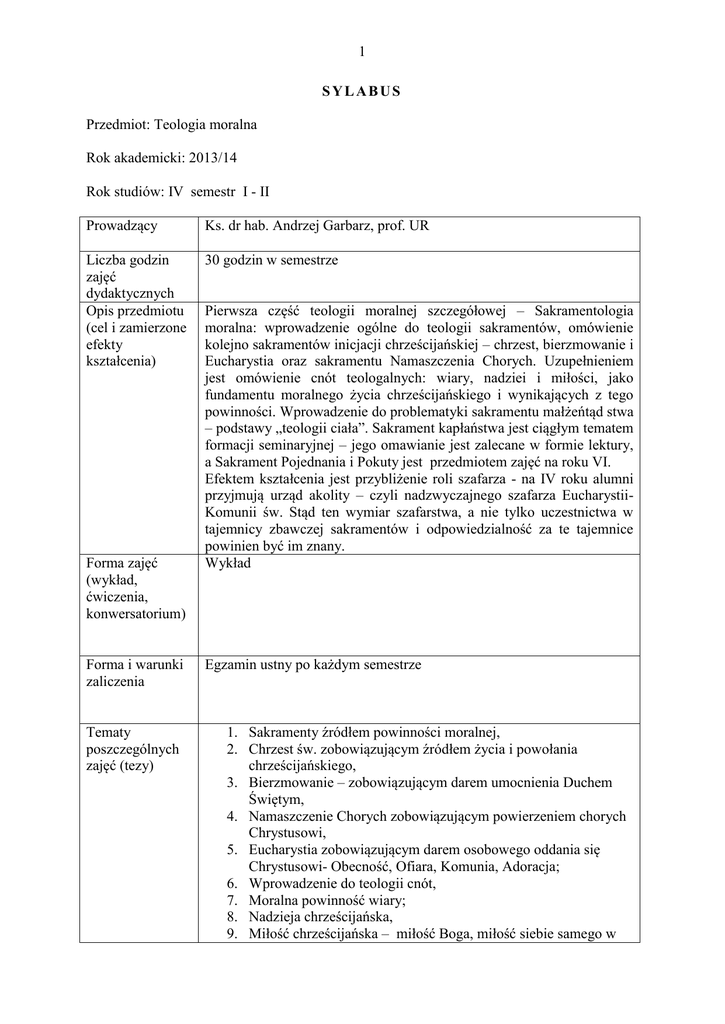 1 SYLABUS Przedmiot: Teologia moralna Rok akademicki: 2013/14 Rok studiów: IV semestr I - II Prowadzący Ks. dr hab. Andrzej Garbarz, prof. UR Liczba godzin zajęć dydaktycznych Opis przedmiotu (cel i zamierzone efekty kształcenia) 30 godzin w semestrze Forma zajęć (wykład, ćwiczenia, konwersatorium) Forma i warunki zaliczenia Tematy poszczególnych zajęć (tezy) Pierwsza część teologii moralnej szczegółowej – Sakramentologia moralna: wprowadzenie ogólne do teologii sakramentów, omówienie kolejno sakramentów inicjacji chrześcijańskiej – chrzest, bierzmowanie i Eucharystia oraz sakramentu Namaszczenia Chorych. Uzupełnieniem jest omówienie cnót teologalnych: wiary, nadziei i miłości, jako fundamentu moralnego życia chrześcijańskiego i wynikających z tego powinności. Wprowadzenie do problematyki sakramentu małżeńtąd stwa – podstawy „teologii ciała”. Sakrament kapłaństwa jest ciągłym tematem formacji seminaryjnej – jego omawianie jest zalecane w formie lektury, a Sakrament Pojednania i Pokuty jest przedmiotem zajęć na roku VI. Efektem kształcenia jest przybliżenie roli szafarza - na IV roku alumni przyjmują urząd akolity – czyli nadzwyczajnego szafarza EucharystiiKomunii św. Stąd ten wymiar szafarstwa, a nie tylko uczestnictwa w tajemnicy zbawczej sakramentów i odpowiedzialność za te tajemnice powinien być im znany. Wykład Egzamin ustny po każdym semestrze 1. Sakramenty źródłem powinności moralnej, 2. Chrzest św. zobowiązującym źródłem życia i powołania chrześcijańskiego, 3. Bierzmowanie – zobowiązującym darem umocnienia Duchem Świętym, 4. Namaszczenie Chorych zobowiązującym powierzeniem chorych Chrystusowi, 5. Eucharystia zobowiązującym darem osobowego oddania się Chrystusowi- Obecność, Ofiara, Komunia, Adoracja; 6. Wprowadzenie do teologii cnót, 7. Moralna powinność wiary; 8. Nadzieja chrześcijańska, 9. Miłość chrześcijańska – miłość Boga, miłość siebie samego w 2 Bogu, miłość ludzi w Bogu i dla Boga 10. Obowiązek miłosierdzia 11. Podstawy „teologii ciała” –„Mężczyzną i niewiasta stworzył ich”, 12. Godność ciała ludzkiego; 13. Czystość; 14. Wstydliwość; 15. Samotności – nagość – jedność; 16. Problem „serca” ludzkiego – miłość czy pożądliwość? 17. Kryteria oceny moralnej. Literatura podstawowa Lektura uzupełniająca - Ks. Adam Kokoszka, Zobowiązujące znaki łaski. Sakramentologia moralna, cz. I-II, wyd. Byblos, Tarnów 2003, - Ks. Alojzy Drożdż, Wiara – nadzieja – miłość. Teologia moralna szczegółowa, Tarnów 1994; - Ks. Adam Kokoszka, Moralność życia małżeńskiego, wyd. Byblos, Tarnów 1997, - Ks. Stanisław Olejnik, Teologia moralna życia osobistego, Włocławek 1999. - Jan Paweł II, „Mężczyzną i niewiastą stworzył ich” – Katechezy środowe: Chrystus odwołuje się do „początku”; Chrystus odwołuje się do „serca”; Chrystus odwołuje się do zmartwychwstania; - Jan Paweł II, Adhortacja „Familiaris consortio”; - Benedykt XVI, Encyklika “Deus Caritas est”, - Benedykt XVI, Encyklika, “Spem salvi”, - Ks. Joachim Piegsa MSF, Człowiek - istota moralna, t. II: Religijne podstawy moralności: wiara – nadzieja – miłość, Opole 2002.